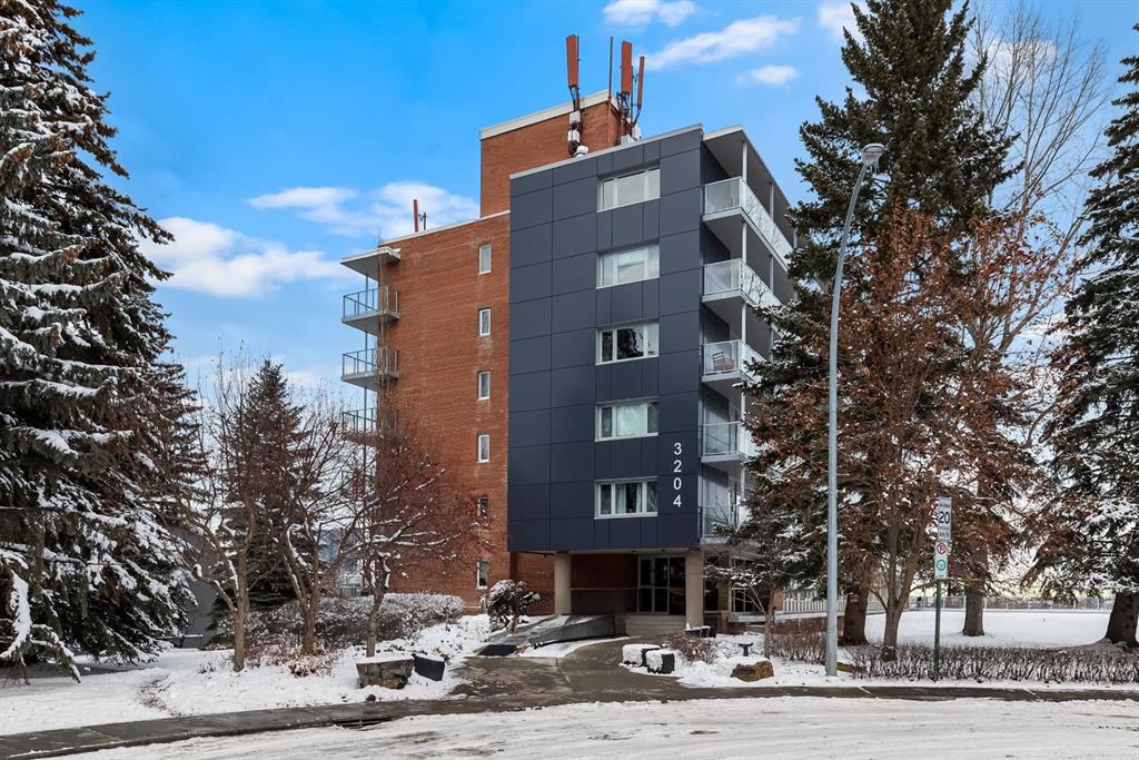 Uninterrupted panoramic views of Calgary’s downtown skyline define this recently renovated two-bedroom, one-bathroom end unit on the 6th floor of the renowned Renfrew House. Renovated in 2016, the transformation went far beyond aesthetics. The unit was completely rebuilt to modern standards with new windows, electrical wiring and panel, updated plumbing lines, enhanced soundproofing, and hardwired CAT 6e networking throughout for seamless connectivity. Inside, mid-century modern design meets contemporary sophistication. Commercial-grade Coswick hardwood floors, dimmable LED lighting with designer fixtures, and Lutron controls create a polished ambiance, while unique touches—like the restored original milk delivery door and custom quartz-topped radiator covers—preserve timeless character. The kitchen is a culinary showpiece, boasting built-in Thermador and Bosch appliances including an induction cooktop, custom soft-close cabinetry, and a striking Italian chevron Mutina stone backsplash lit by LED under-cabinet lighting. A built-in electric fireplace enhances the dining area, while the living room is anchored by a walnut-paneled TV feature wall framed by sweeping city views. Custom closet systems maximize storage throughout, while the spa-inspired bathroom offers a walnut vanity, quartz counters, Grohe and Kohler fixtures, and a dedicated makeup station. The primary bedroom provides elegant, functional closet solutions, and the spacious second bedroom is perfect for guests or a home office. The home includes underground parking and a storage unit, all within 13 acres of park-like grounds atop the hill—an unmatched setting combining green space, privacy, and city convenience. Book your private showing today.