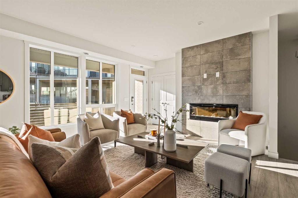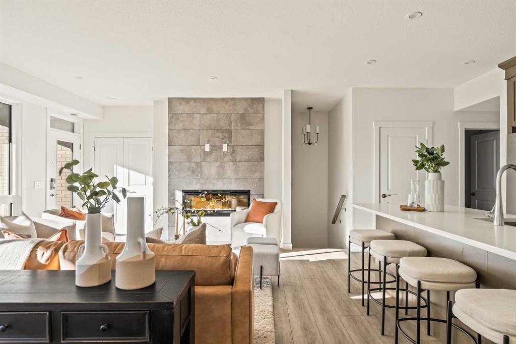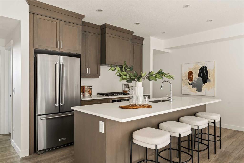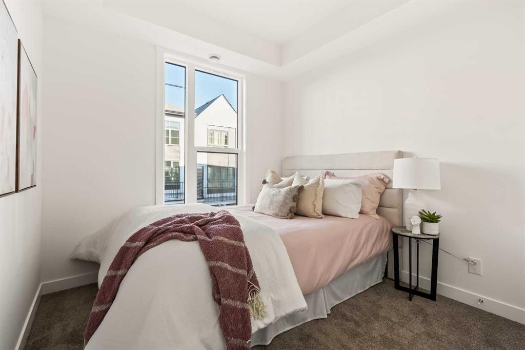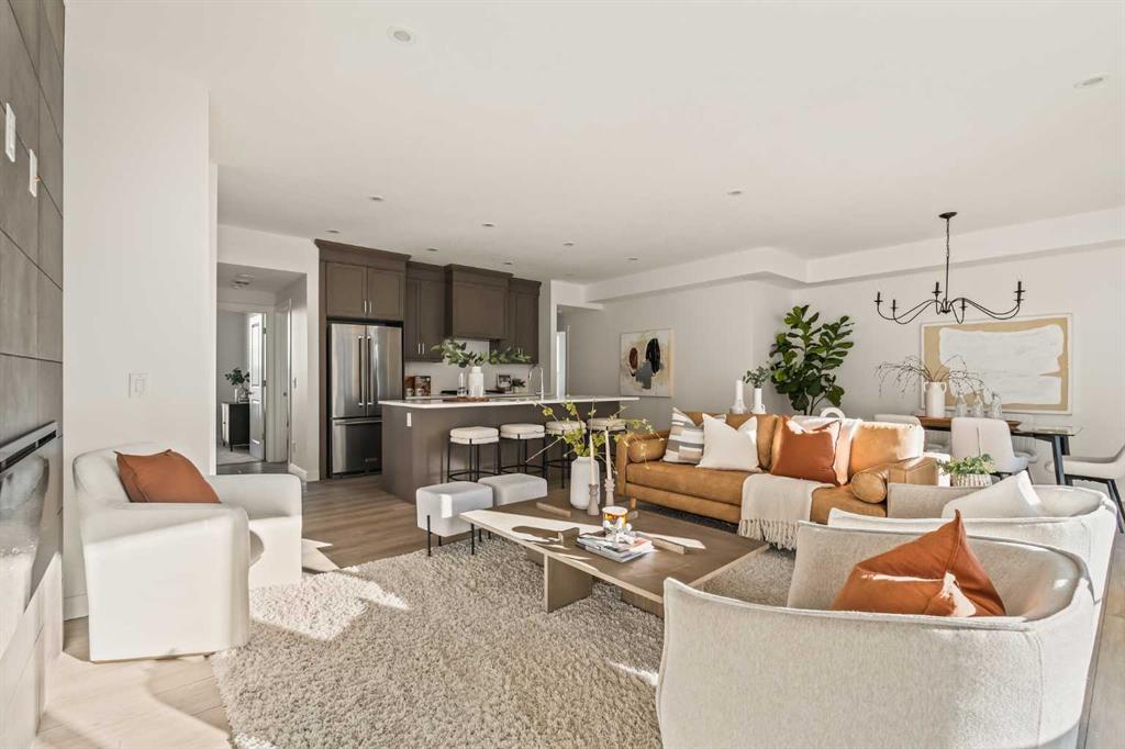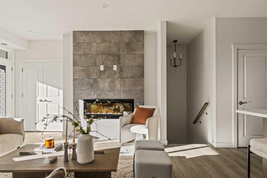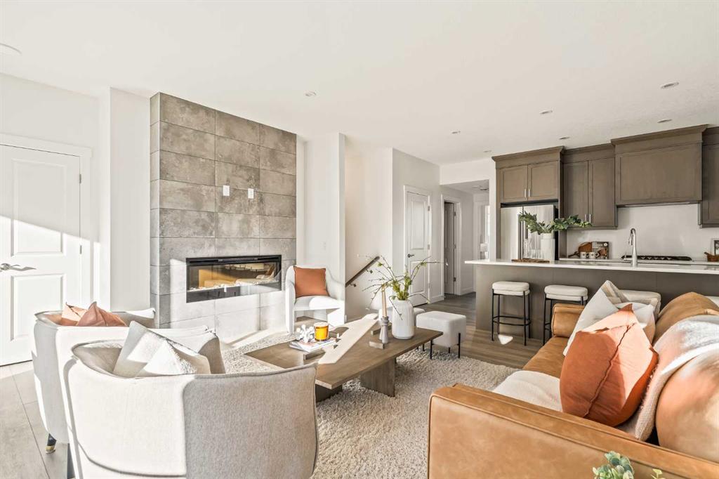 Welcome to the Regent at Crown Park, a beautifully crafted bungalow-style townhome offering true single-level living without compromise! This unique design combines the benefits of a bungalow lifestyle without compromising on storage or garage space, all while moving into a brand new beautiful home with full warranty! Thoughtfully designed with down-sizers in mind, this maintenance-free residence is perfect for those who travel or simply prefer a lock-and-leave lifestyle free from exterior upkeep, landscaping, or snow removal. This brand-new 3-bedroom, 2-bathroom home offers nearly 1,300 sq.ft. of well-planned living space on one level, plus a lower level featuring extensive storage and access to the oversized double garage. At the heart of the home, a stunning open-concept living area was created for effortless entertaining. The central kitchen seamlessly connects the living and dining spaces while a full wall of south-west facing windows floods the interior with natural light all year long. Timeless finishes include warm-tone natural wood shaker maple cabinetry, light quartz countertops, and a premium built-in appliance package featuring a gas cooktop, built-in oven, and chimney hood fan – ensuring the chef is always part of the conversation. A striking floor-to-ceiling tile fireplace anchors the great room, offering a warm focal point and comfortable seating for gatherings. The spacious dining area easily accommodates a full table and buffet, providing exceptional furnishing flexibility. Privately positioned at the rear of the home, the primary retreat features a generous walk-in closet and spa-inspired ensuite with dual vanities and a tiled walk-in shower with 10mm glass. A centrally located laundry room with upper cabinetry and folding counter enhances everyday convenience while naturally separating the primary suite from the secondary bedrooms. Two additional bedrooms and a full bathroom provide versatility for guests, a home office, media room, or creative space – while maintaining excellent resale appeal. The lower level offers a large storage room and an oversized utility room (approx. 17′ x 7′) ideal for hobbies or seasonal storage. A double closet and oversized double attached garage completes the interior features on the lower level. Step outside to your private covered southwest-facing patio spanning over 26 feet that overlooks the park and includes a gas line, hose bib, and A/C rough-in – the perfect setting for relaxed outdoor living and future upgrades in mind. Bungalow-style townhomes with double attached garages are exceptionally rare. Enjoy added peace of mind with comprehensive builder warranty coverage plus Alberta New Home Warranty. Located minutes from downtown and surrounded by established amenities, Crown Park offers the confidence of a mature community paired with the comfort of a brand-new home. This is one of the very last brand new opportunities remaining – a truly rare opportunity you won’t want to miss!