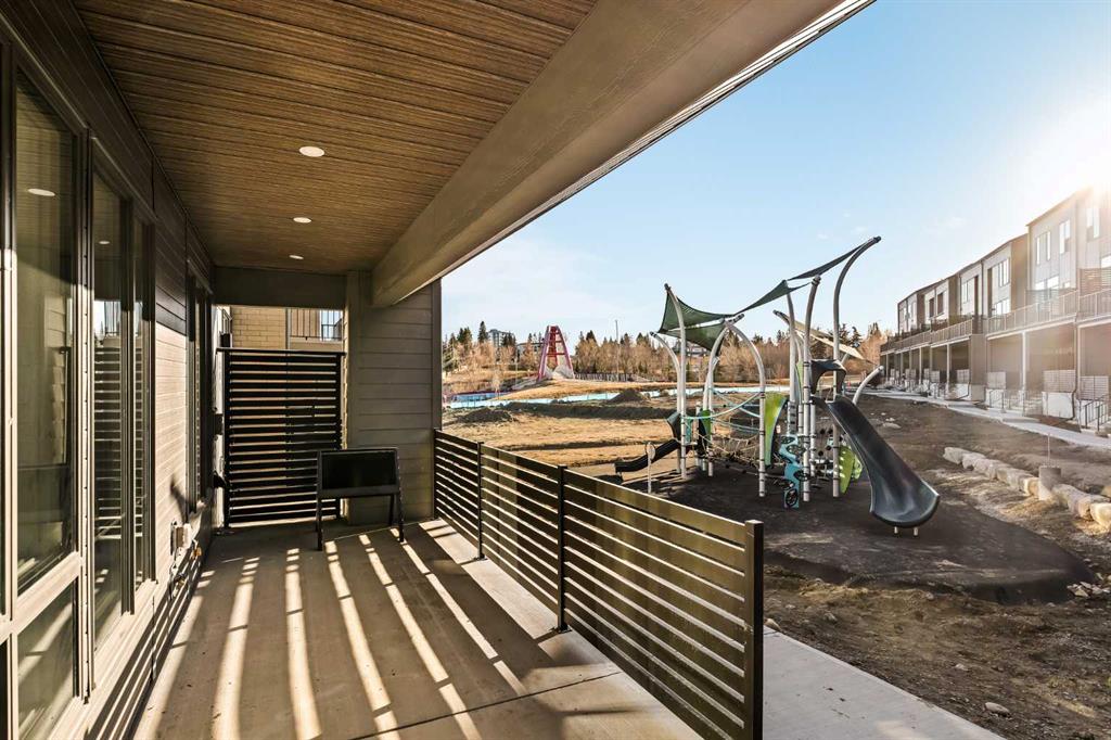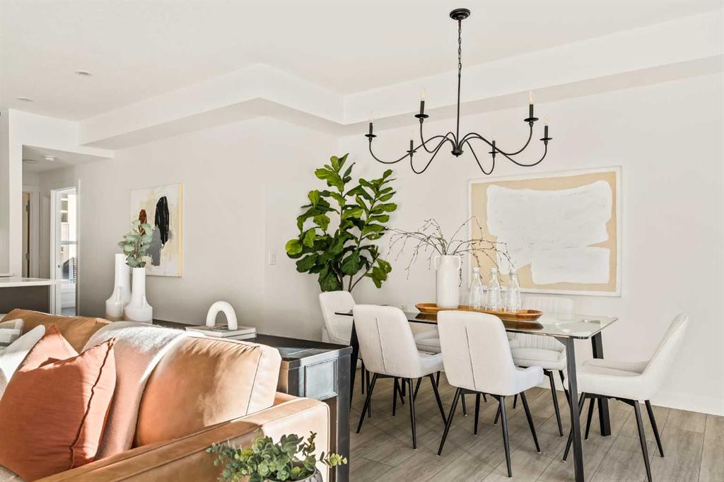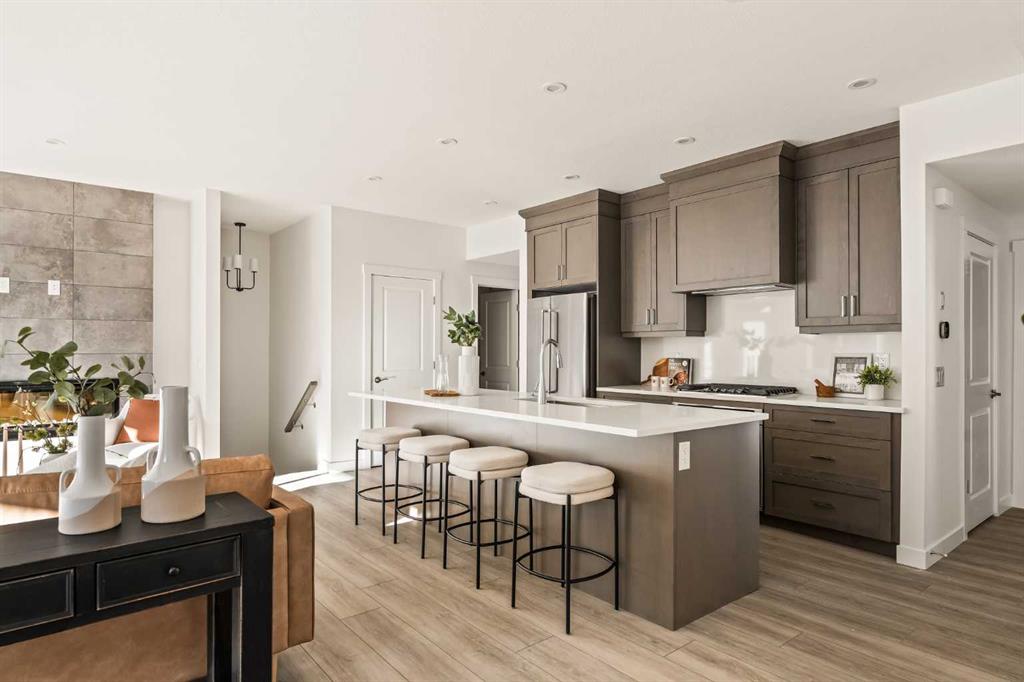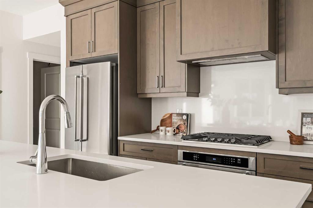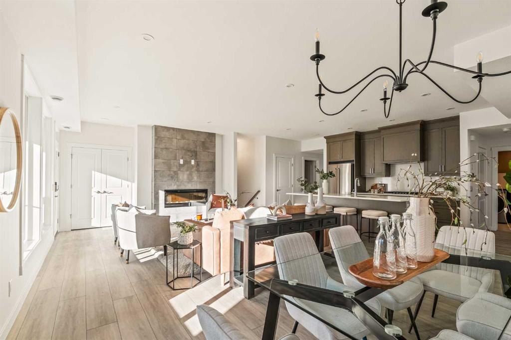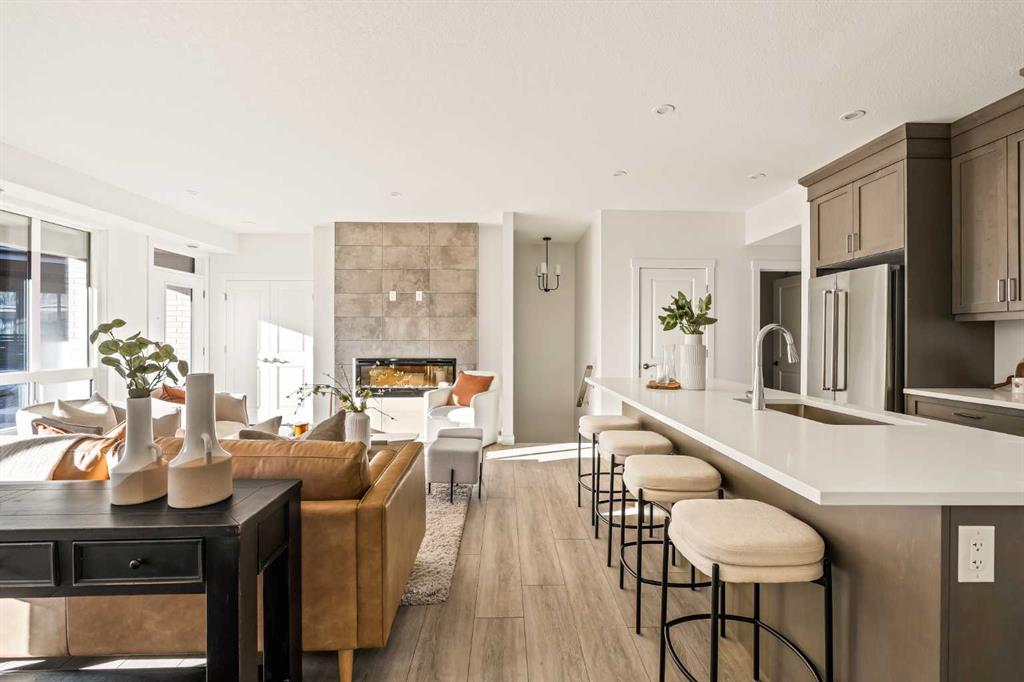 Welcome to the Regent at Crown Park, a beautifully crafted bungalow-style townhome offering true single-level living without compromise! This unique design combines the benefits of a bungalow lifestyle without compromising on storage or garage space, all while moving into a brand new beautiful home with full warranty! Thoughtfully designed with down-sizers in mind, this maintenance-free residence is perfect for those who travel or simply prefer a lock-and-leave lifestyle free from exterior upkeep, landscaping, or snow removal. This brand-new 3-bedroom, 2-bathroom home offers nearly 1,300 sq.ft. of well-planned living space on one level, plus a lower level featuring extensive storage and access to the oversized double garage. At the heart of the home, a stunning open-concept living area was created for effortless entertaining. The central kitchen seamlessly connects the living and dining spaces while a full wall of south-west facing windows floods the interior with natural light all year long. Timeless finishes include warm-tone natural wood shaker maple cabinetry, light quartz countertops, and a premium built-in appliance package featuring a gas cooktop, built-in oven, and chimney hood fan – ensuring the chef is always part of the conversation. A striking floor-to-ceiling tile fireplace anchors the great room, offering a warm focal point and comfortable seating for gatherings. The spacious dining area easily accommodates a full table and buffet, providing exceptional furnishing flexibility. Privately positioned at the rear of the home, the primary retreat features a generous walk-in closet and spa-inspired ensuite with dual vanities and a tiled walk-in shower with 10mm glass. A centrally located laundry room with upper cabinetry and folding counter enhances everyday convenience while naturally separating the primary suite from the secondary bedrooms. Two additional bedrooms and a full bathroom provide versatility for guests, a home office, media room, or creative space – while maintaining excellent resale appeal. The lower level offers a large storage room and an oversized utility room (approx. 17′ x 7′) ideal for hobbies or seasonal storage. A double closet and oversized double attached garage completes the interior features on the lower level. Step outside to your private covered southwest-facing patio spanning over 26 feet that overlooks the park and includes a gas line, hose bib, and A/C rough-in – the perfect setting for relaxed outdoor living and future upgrades in mind. Bungalow-style townhomes with double attached garages are exceptionally rare. Enjoy added peace of mind with comprehensive builder warranty coverage plus Alberta New Home Warranty. Located minutes from downtown and surrounded by established amenities, Crown Park offers the confidence of a mature community paired with the comfort of a brand-new home. This is one of the very last brand new opportunities remaining – a truly rare opportunity you won’t want to miss!