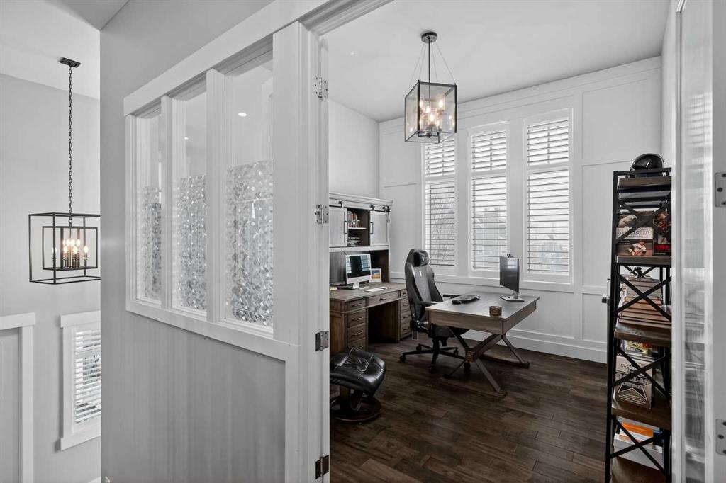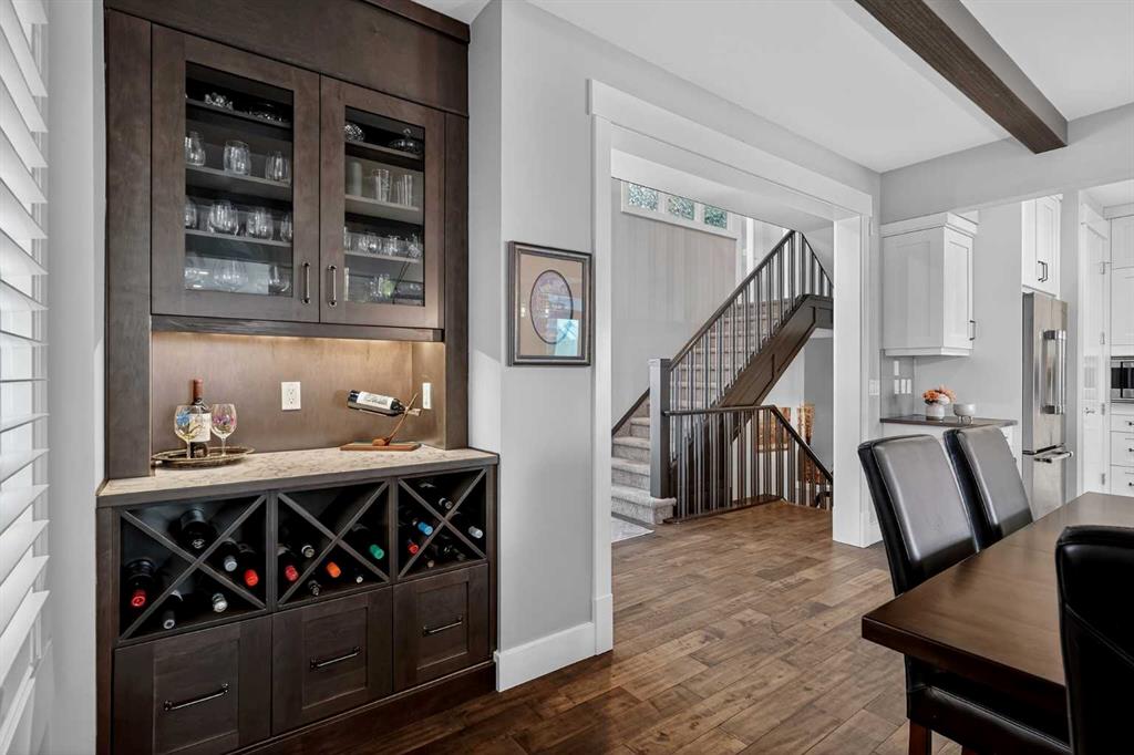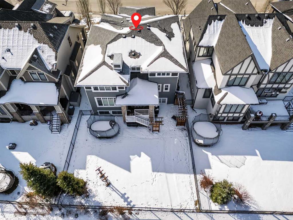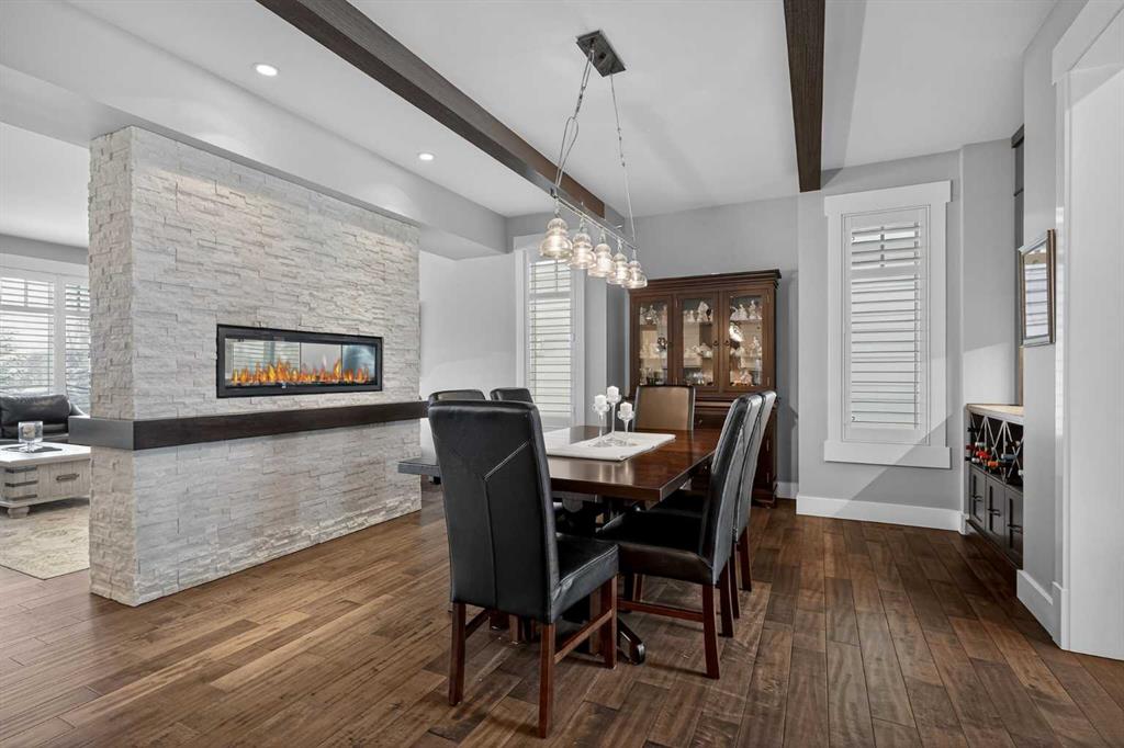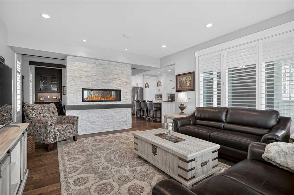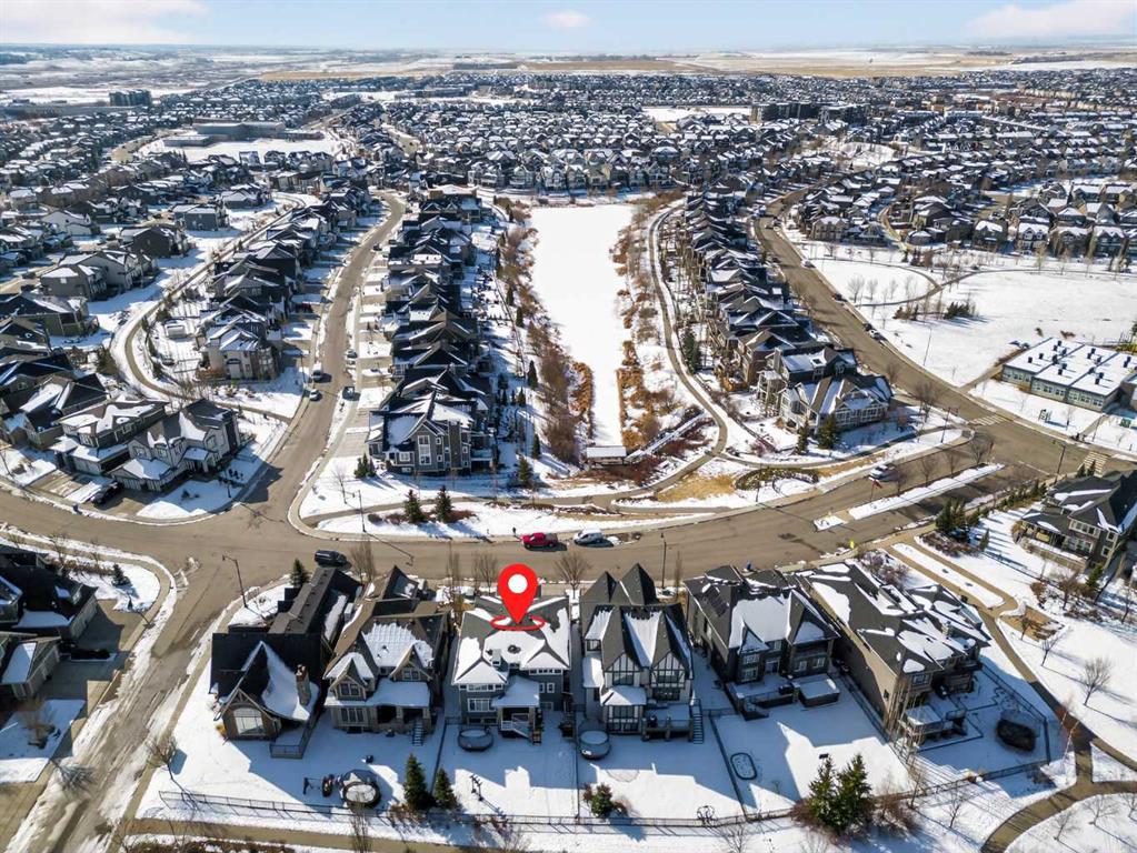 This former Crystal Creek show home is the definition of opulence and luxury. Located directly across the street from Coopers Pond, this 4 bedroom, 3.5 bathroom stunner truly has it all. Curb appeal is evident as you approach the home welcoming you before you even enter. As you come inside, you are immediately greeted with high ceilings and gorgeous wood floors that span the main level. Your eyes will be drawn to the infinite details that are impossible to miss such as the wood beams on the ceiling above your dining room, which is framed with a double-sided fireplace set into a stone wall and accompanied by a classy wine bar. The kitchen is a chef’s dream equipped with ultra-high-end Viking stainless steel appliances, 2 different types of stone countertops, tons of cabinetry and drawers featuring every upgrade available when the home was constructed. The open floor plan flows from your kitchen into your dining room and through to your large living room overlooking the north facing back yard making this the perfect space for entertaining or for quiet nights at home with the family. A beautiful sliding door allows for ease of access to your large, covered deck, creating the best indoor/outdoor cooking and dining experience. Your half-bathroom with custom wallpaper and a fully equipped laundry room finish off the main level before heading upstairs. With a truly unique design feature exclusive to this home, the home office is a show piece in itself, featuring a gorgeous feature wall framing 3 large south facing windows looking over Coopers Pond and bathing the space in natural light. Your home office has been taken to a level you have never seen before! The bonus room is a great size for family movie nights and offers you a built in desk area for homework or arts and crafts. The primary suite is something you would see in a high end New York hotel and is the perfect space to make your own retreat. The bedroom itself is huge and will easily fit your king-size bed and all of the accompanying bedroom furniture. The spa inspired ensuite is to die for with gorgeous tile floors, an upgraded dual vanity, a massive soaker tub, and a walk-in shower with custom tile work and a seat. Your large walk in closet finishes off the primary suite before heading to the second and third bedrooms which are in a separate wing upstairs. Both are a great size and have direct access to the 4 piece bathroom located between the two bedrooms. The basement is fully finished and is an entertainer’s dream. You have your own wet bar with a fridge as well as a games area and large living space making it optimal to host friends and family for the big game or just a game night at home. The guest bedroom is a great size and is tucked into a private corner of the basement right beside another full bathroom. This home has dual furnaces, dual air conditioners, in floor heating, a triple tandem garage ,and hot water on demand. The large lot gives you a tranquil back yard backing on to green space.