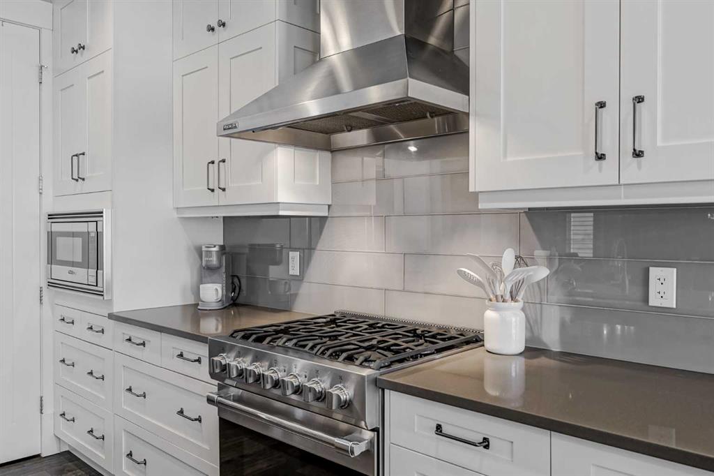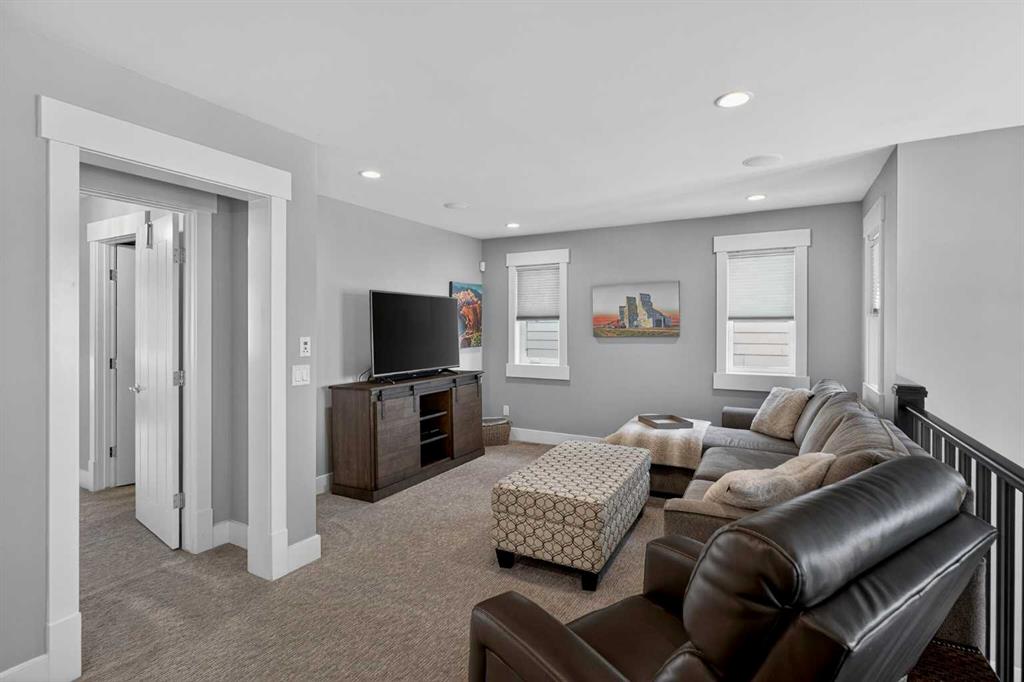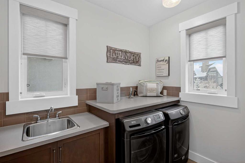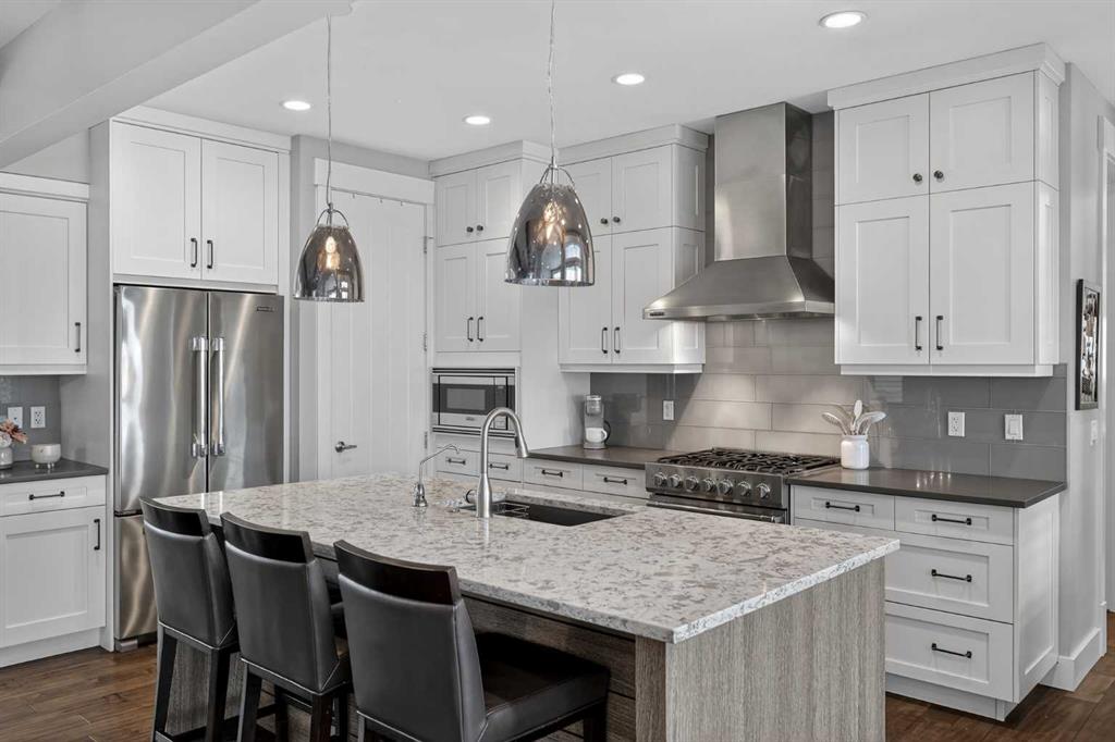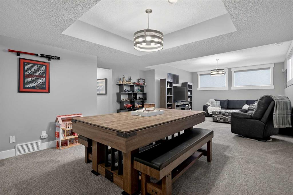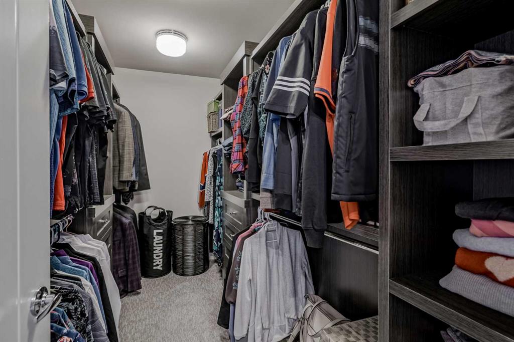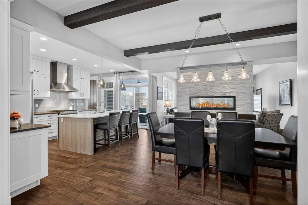 This former Crystal Creek show home is the definition of opulence and luxury. Located directly across the street from Coopers Pond, this 4 bedroom, 3.5 bathroom stunner truly has it all. Curb appeal is evident as you approach the home welcoming you before you even enter. As you come inside, you are immediately greeted with high ceilings and gorgeous wood floors that span the main level. Your eyes will be drawn to the infinite details that are impossible to miss such as the wood beams on the ceiling above your dining room, which is framed with a double-sided fireplace set into a stone wall and accompanied by a classy wine bar. The kitchen is a chef’s dream equipped with ultra-high-end Viking stainless steel appliances, 2 different types of stone countertops, tons of cabinetry and drawers featuring every upgrade available when the home was constructed. The open floor plan flows from your kitchen into your dining room and through to your large living room overlooking the north facing back yard making this the perfect space for entertaining or for quiet nights at home with the family. A beautiful sliding door allows for ease of access to your large, covered deck, creating the best indoor/outdoor cooking and dining experience. Your half-bathroom with custom wallpaper and a fully equipped laundry room finish off the main level before heading upstairs. With a truly unique design feature exclusive to this home, the home office is a show piece in itself, featuring a gorgeous feature wall framing 3 large south facing windows looking over Coopers Pond and bathing the space in natural light. Your home office has been taken to a level you have never seen before! The bonus room is a great size for family movie nights and offers you a built in desk area for homework or arts and crafts. The primary suite is something you would see in a high end New York hotel and is the perfect space to make your own retreat. The bedroom itself is huge and will easily fit your king-size bed and all of the accompanying bedroom furniture. The spa inspired ensuite is to die for with gorgeous tile floors, an upgraded dual vanity, a massive soaker tub, and a walk-in shower with custom tile work and a seat. Your large walk in closet finishes off the primary suite before heading to the second and third bedrooms which are in a separate wing upstairs. Both are a great size and have direct access to the 4 piece bathroom located between the two bedrooms. The basement is fully finished and is an entertainer’s dream. You have your own wet bar with a fridge as well as a games area and large living space making it optimal to host friends and family for the big game or just a game night at home. The guest bedroom is a great size and is tucked into a private corner of the basement right beside another full bathroom. This home has dual furnaces, dual air conditioners, in floor heating, a triple tandem garage ,and hot water on demand. The large lot gives you a tranquil back yard backing on to green space.