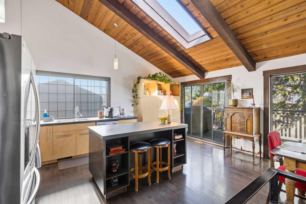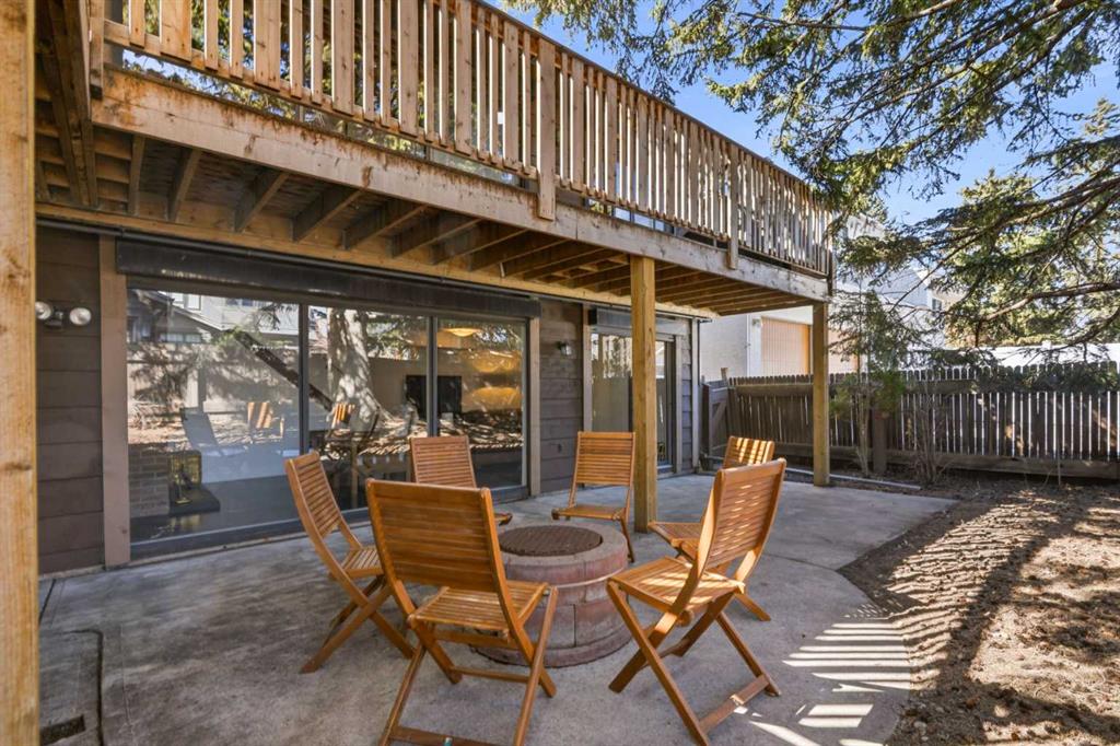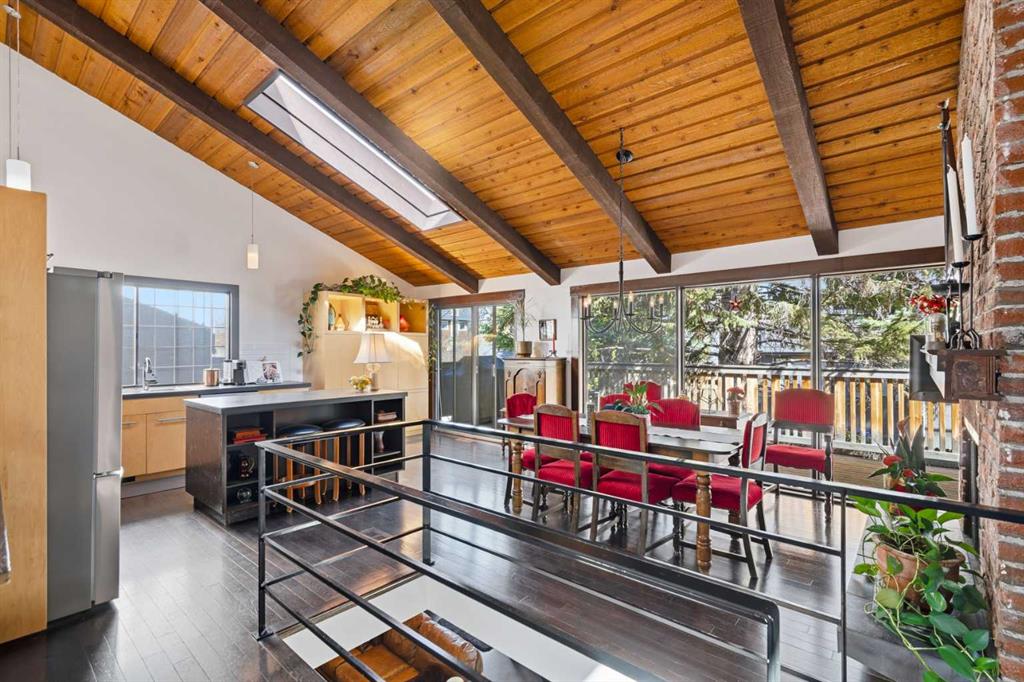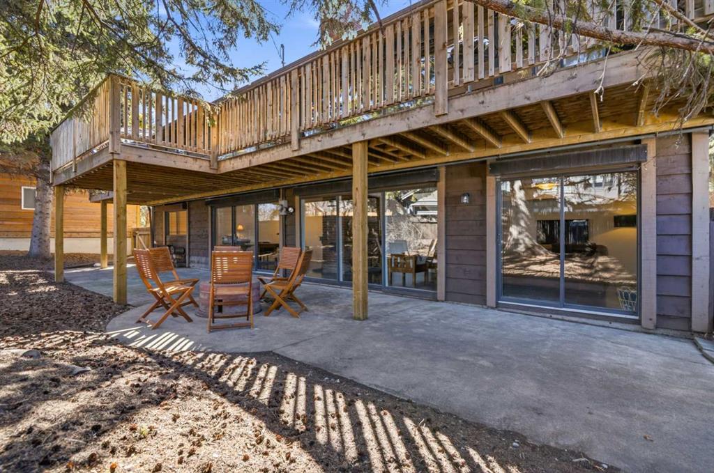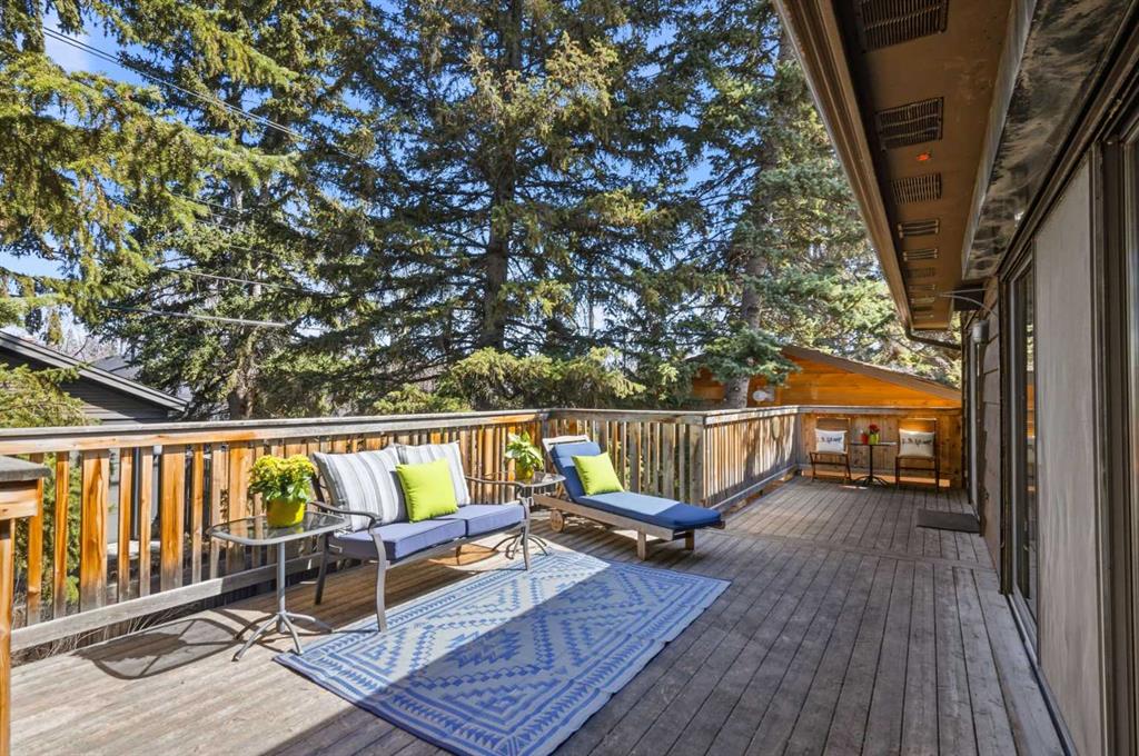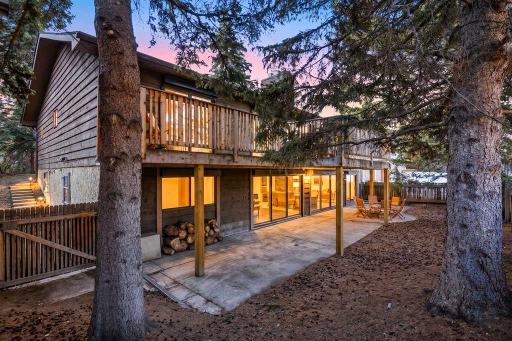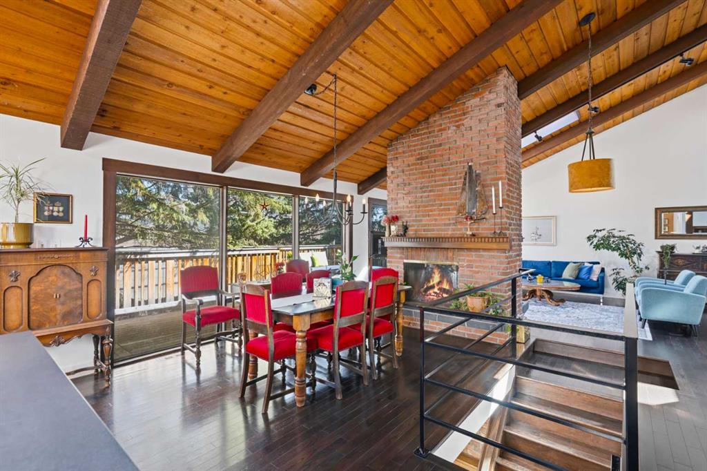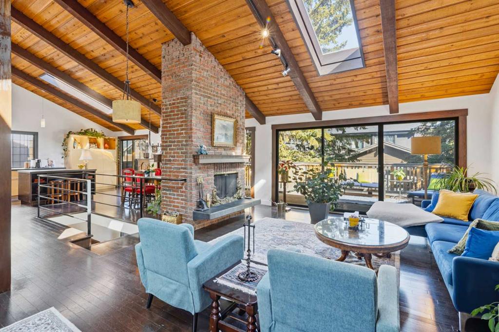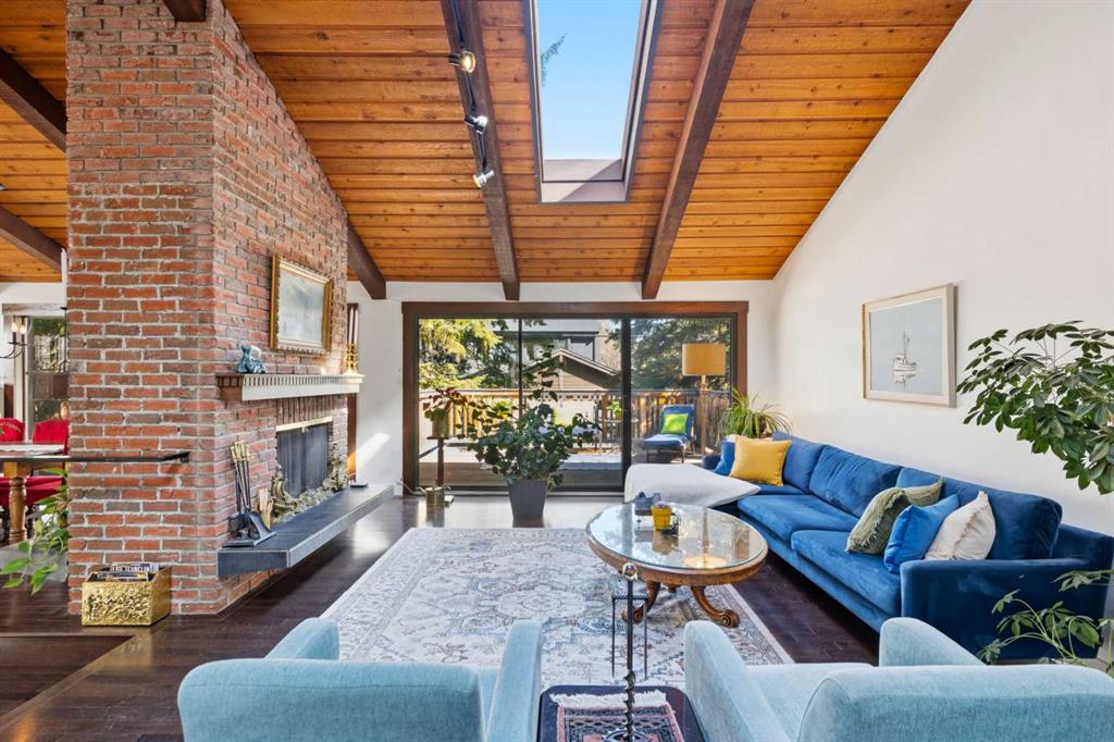 Welcome to the elegant neighbourhood of Elbow Park. This charming Post Modern home offers over 3200 square feet of living space. Tucked away on a one way street and facing forested reserve space your privacy and tranquility is ensured. The Interior features a vaulted wood beamed ceiling with skylights affording sun drenched days. Imagine yourself in a beautiful chalet in the heart of the city. The open floor plan creates a bright and airy living environment. The Cornerstone feature of this home is the raised hearth dual sided bi-level fireplace that can be enjoyed from the living area, dining room, secondary living area and office/den. The upper level feature 3 generous bedrooms. The Primary with En suite and another 4 piece bath for the additional 2 upstairs bedrooms. The sliding patio doors off the kitchen and primary bedroom allow access to the generous deck surrounded by mature trees. In the lower level we have another full wall of windows creating a feeling of outdoor access and allowing ample light. This area offers an additional living space again with full access to the feature fireplace. The office/den area can be whatever you envision. Art studio, playroom – choose your own adventure. The lower level features another generous bedroom as well as ample storage rooms and a large recreation space. A newly renovated 3pc bath makes this the perfect guest space. The ample laundry space has a separate entrance for ease of access. The back yard is fully fenced with a gas firepit that’s perfect for roasting hotdogs and smores or enjoying get-togethers. The detached 3 car garage includes a hydraulic lift as well as shop space. This is a generous green space with mature trees and blooming front garden. An attached double car garage allows ample parking space for family and guests. Situated just a block away from the Elbow River with easy access to top rated schools, The Glencoe, Stanley Park and Shopping. This lovely home presents a rare opportunity to own a special parcel of property in the heart of the city