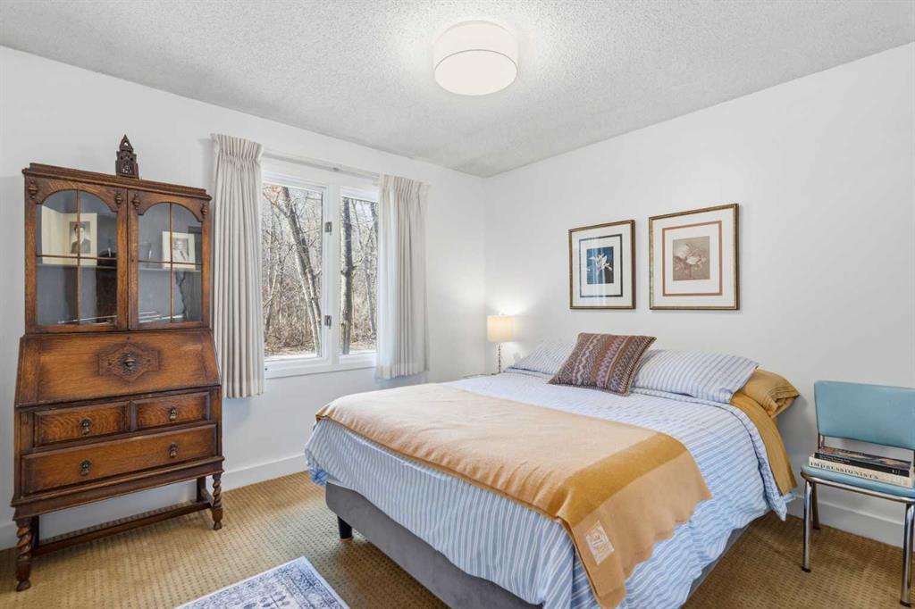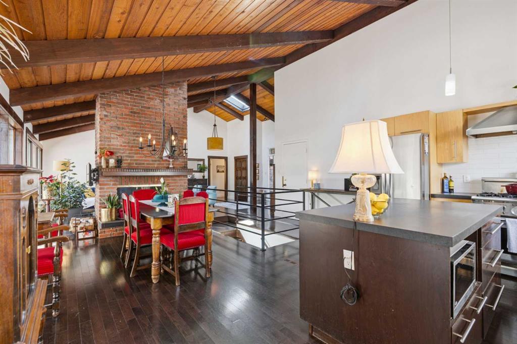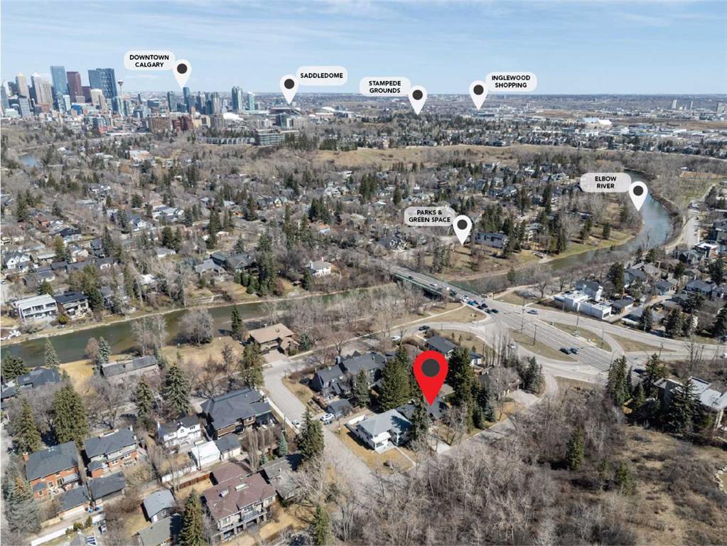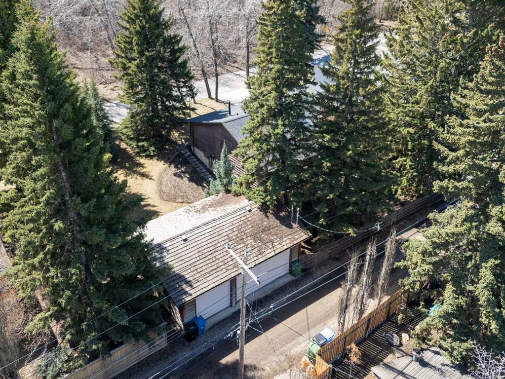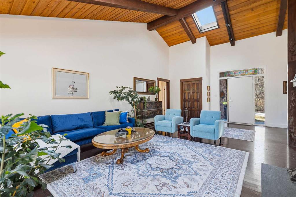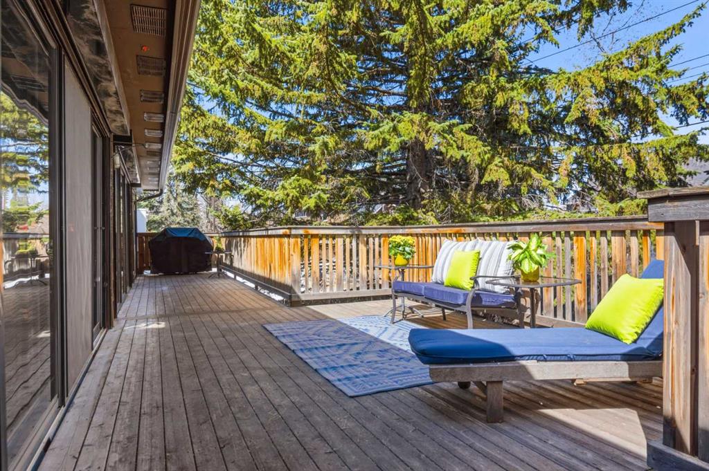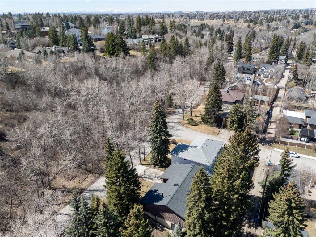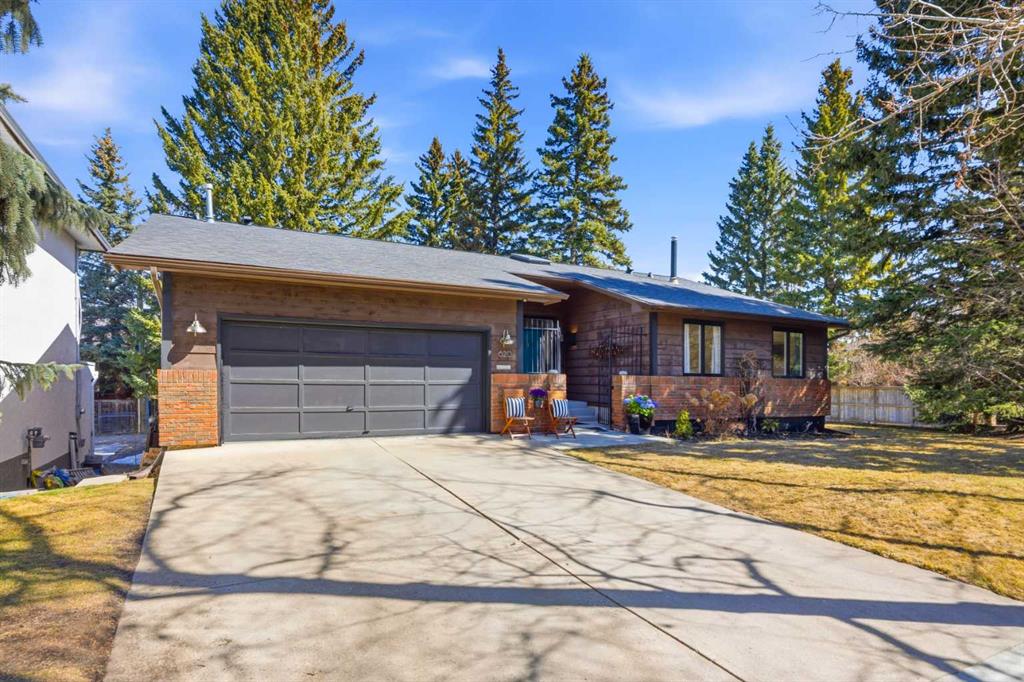 Welcome to the elegant neighbourhood of Elbow Park. This charming Post Modern home offers over 3200 square feet of living space. Tucked away on a one way street and facing forested reserve space your privacy and tranquility is ensured. The Interior features a vaulted wood beamed ceiling with skylights affording sun drenched days. Imagine yourself in a beautiful chalet in the heart of the city. The open floor plan creates a bright and airy living environment. The Cornerstone feature of this home is the raised hearth dual sided bi-level fireplace that can be enjoyed from the living area, dining room, secondary living area and office/den. The upper level feature 3 generous bedrooms. The Primary with En suite and another 4 piece bath for the additional 2 upstairs bedrooms. The sliding patio doors off the kitchen and primary bedroom allow access to the generous deck surrounded by mature trees. In the lower level we have another full wall of windows creating a feeling of outdoor access and allowing ample light. This area offers an additional living space again with full access to the feature fireplace. The office/den area can be whatever you envision. Art studio, playroom – choose your own adventure. The lower level features another generous bedroom as well as ample storage rooms and a large recreation space. A newly renovated 3pc bath makes this the perfect guest space. The ample laundry space has a separate entrance for ease of access. The back yard is fully fenced with a gas firepit that’s perfect for roasting hotdogs and smores or enjoying get-togethers. The detached 3 car garage includes a hydraulic lift as well as shop space. This is a generous green space with mature trees and blooming front garden. An attached double car garage allows ample parking space for family and guests. Situated just a block away from the Elbow River with easy access to top rated schools, The Glencoe, Stanley Park and Shopping. This lovely home presents a rare opportunity to own a special parcel of property in the heart of the city