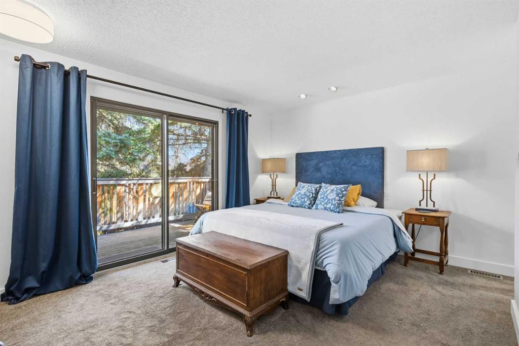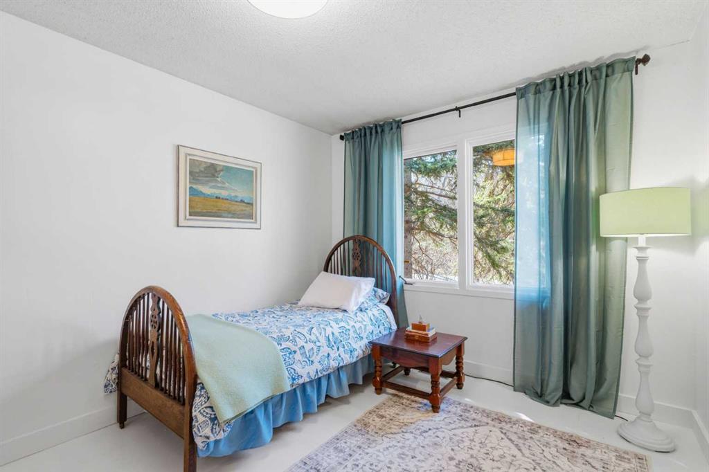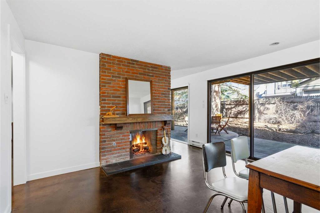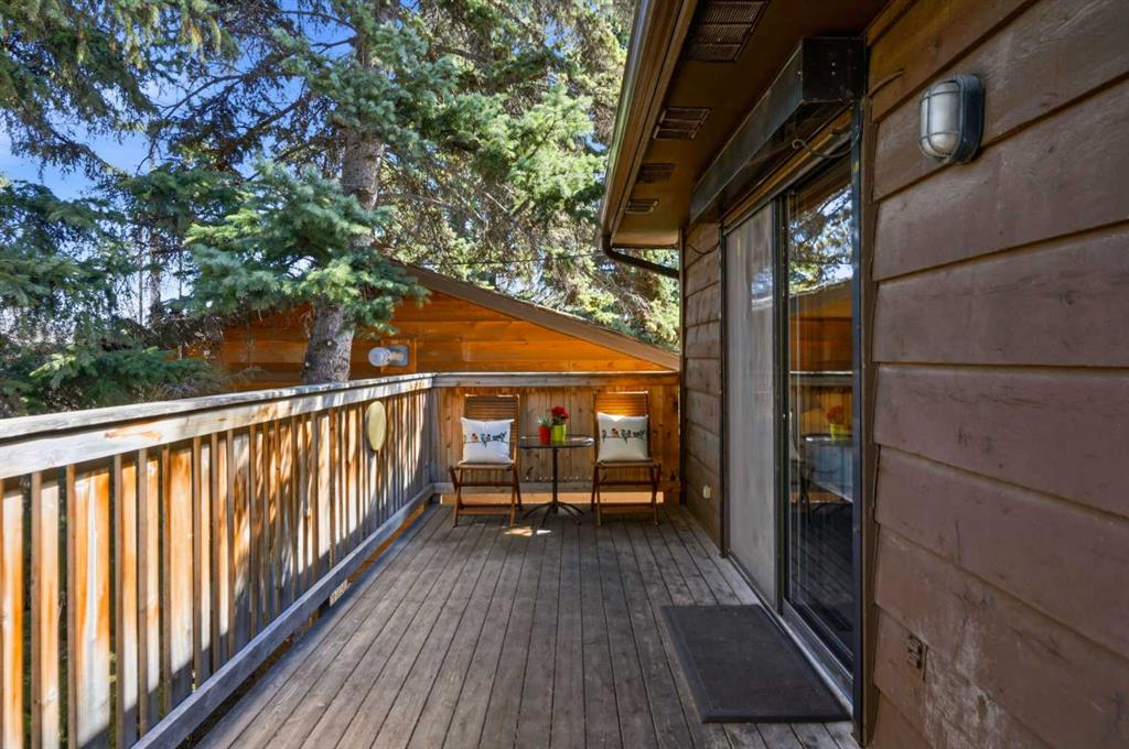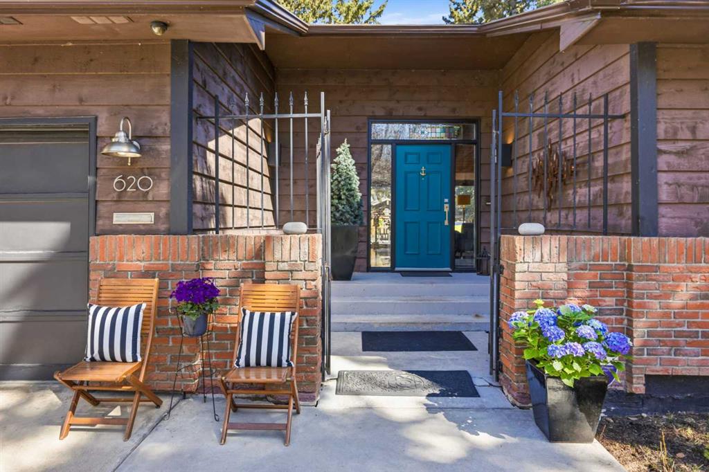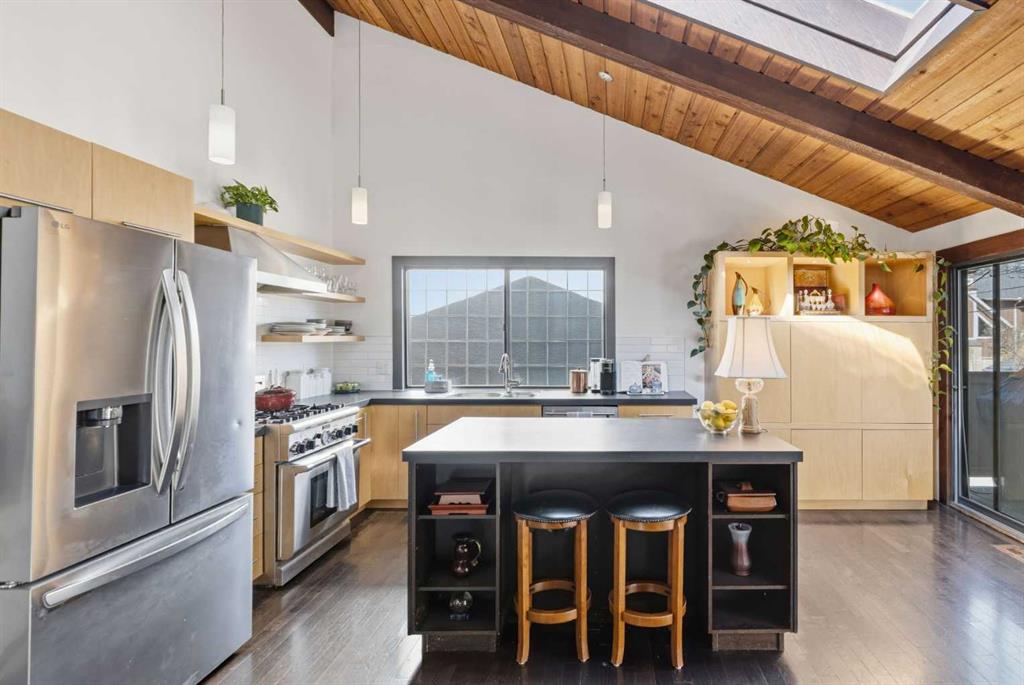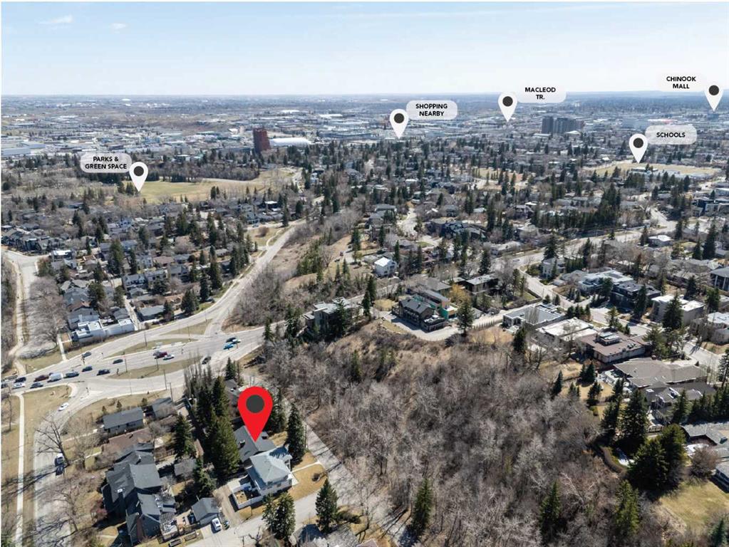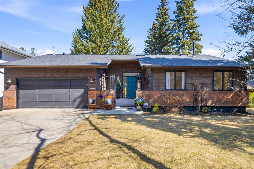 Welcome to the elegant neighbourhood of Elbow Park. This charming Post Modern home offers over 3200 square feet of living space. Tucked away on a one way street and facing forested reserve space your privacy and tranquility is ensured. The Interior features a vaulted wood beamed ceiling with skylights affording sun drenched days. Imagine yourself in a beautiful chalet in the heart of the city. The open floor plan creates a bright and airy living environment. The Cornerstone feature of this home is the raised hearth dual sided bi-level fireplace that can be enjoyed from the living area, dining room, secondary living area and office/den. The upper level feature 3 generous bedrooms. The Primary with En suite and another 4 piece bath for the additional 2 upstairs bedrooms. The sliding patio doors off the kitchen and primary bedroom allow access to the generous deck surrounded by mature trees. In the lower level we have another full wall of windows creating a feeling of outdoor access and allowing ample light. This area offers an additional living space again with full access to the feature fireplace. The office/den area can be whatever you envision. Art studio, playroom – choose your own adventure. The lower level features another generous bedroom as well as ample storage rooms and a large recreation space. A newly renovated 3pc bath makes this the perfect guest space. The ample laundry space has a separate entrance for ease of access. The back yard is fully fenced with a gas firepit that’s perfect for roasting hotdogs and smores or enjoying get-togethers. The detached 3 car garage includes a hydraulic lift as well as shop space. This is a generous green space with mature trees and blooming front garden. An attached double car garage allows ample parking space for family and guests. Situated just a block away from the Elbow River with easy access to top rated schools, The Glencoe, Stanley Park and Shopping. This lovely home presents a rare opportunity to own a special parcel of property in the heart of the city