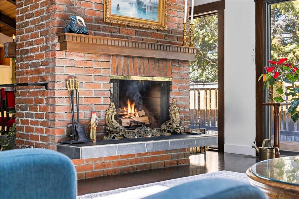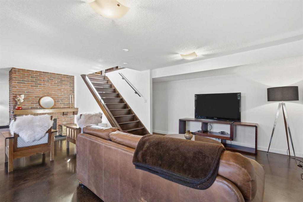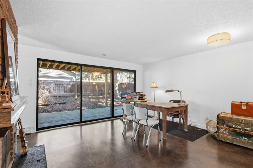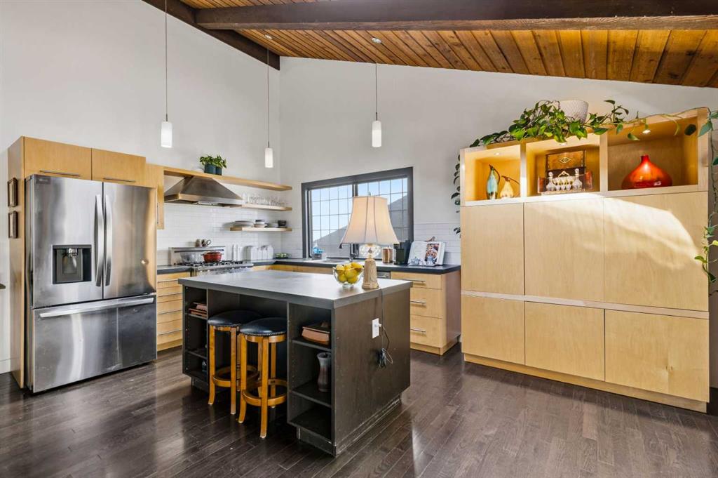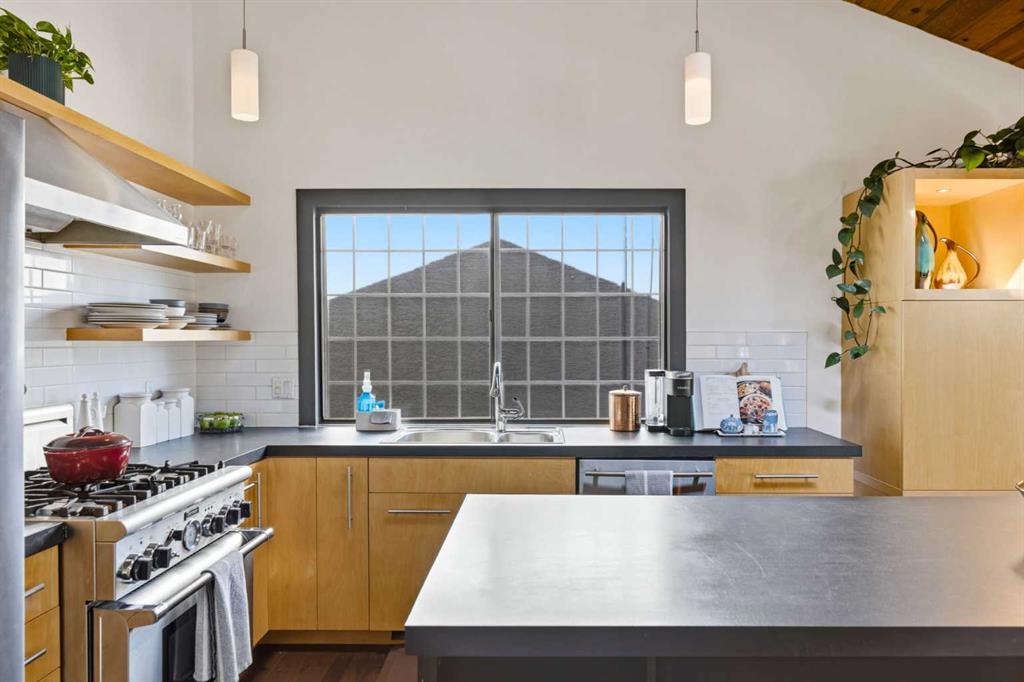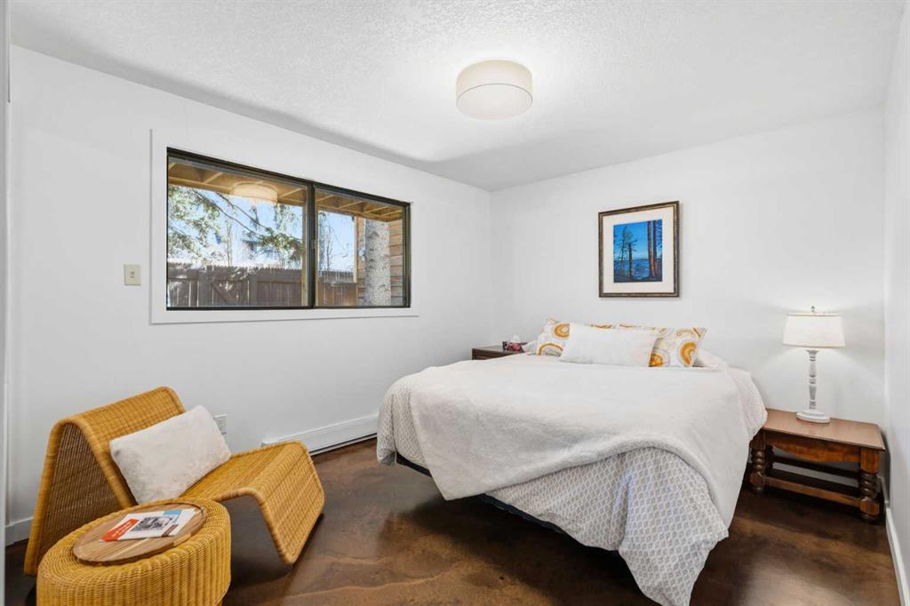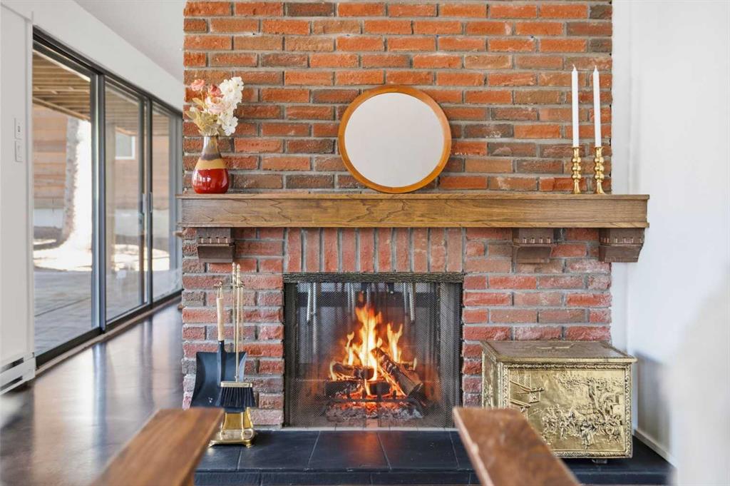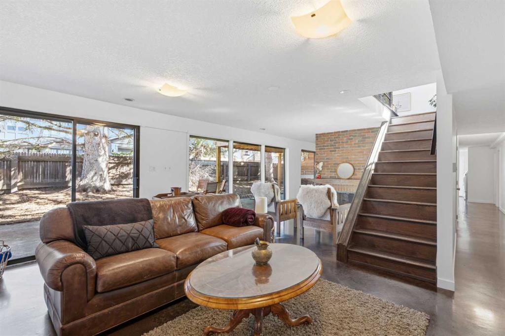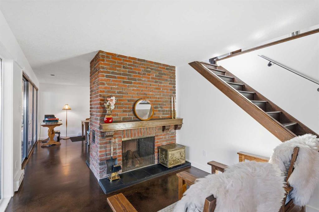Welcome to the elegant neighbourhood of Elbow Park. This charming Post Modern home offers over 3200 square feet of living space. Tucked away on a one way street and facing forested reserve space your privacy and tranquility is ensured. The Interior features a vaulted wood beamed ceiling with skylights affording sun drenched days. Imagine yourself in a beautiful chalet in the heart of the city. The open floor plan creates a bright and airy living environment. The Cornerstone feature of this home is the raised hearth dual sided bi-level fireplace that can be enjoyed from the living area, dining room, secondary living area and office/den. The upper level feature 3 generous bedrooms. The Primary with En suite and another 4 piece bath for the additional 2 upstairs bedrooms. The sliding patio doors off the kitchen and primary bedroom allow access to the generous deck surrounded by mature trees. In the lower level we have another full wall of windows creating a feeling of outdoor access and allowing ample light. This area offers an additional living space again with full access to the feature fireplace. The office/den area can be whatever you envision. Art studio, playroom – choose your own adventure. The lower level features another generous bedroom as well as ample storage rooms and a large recreation space. A newly renovated 3pc bath makes this the perfect guest space. The ample laundry space has a separate entrance for ease of access. The back yard is fully fenced with a gas firepit that’s perfect for roasting hotdogs and smores or enjoying get-togethers. The detached 3 car garage includes a hydraulic lift as well as shop space. This is a generous green space with mature trees and blooming front garden. An attached double car garage allows ample parking space for family and guests. Situated just a block away from the Elbow River with easy access to top rated schools, The Glencoe, Stanley Park and Shopping. This lovely home presents a rare opportunity to own a special parcel of property in the heart of the city