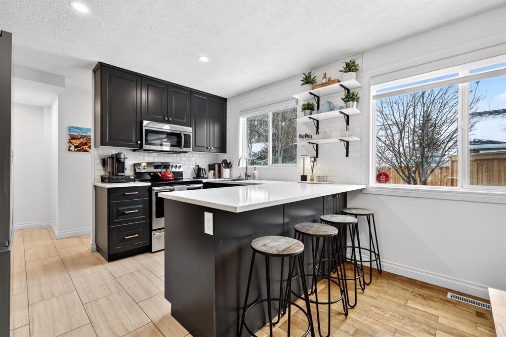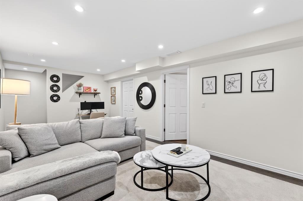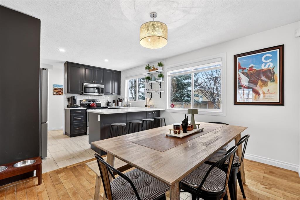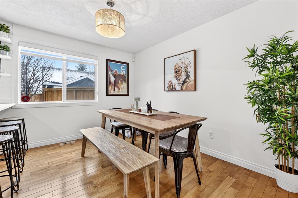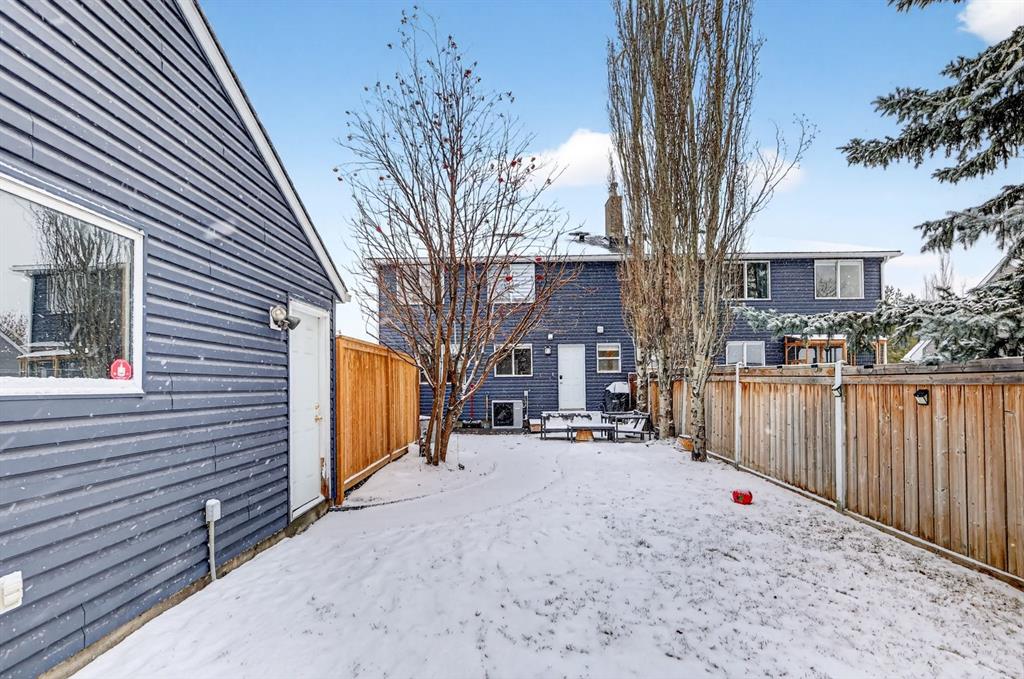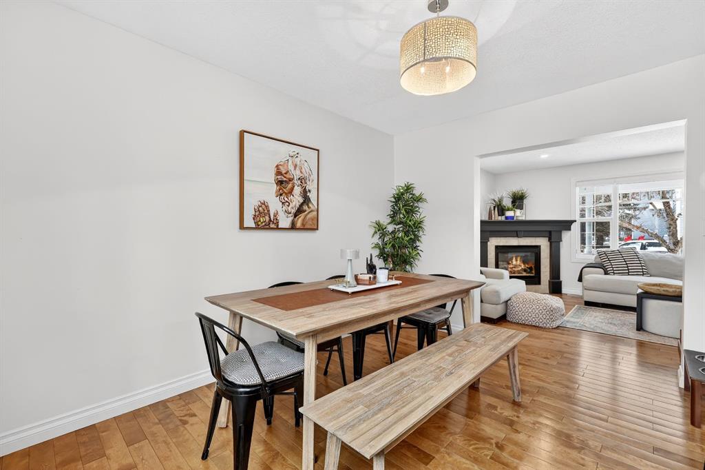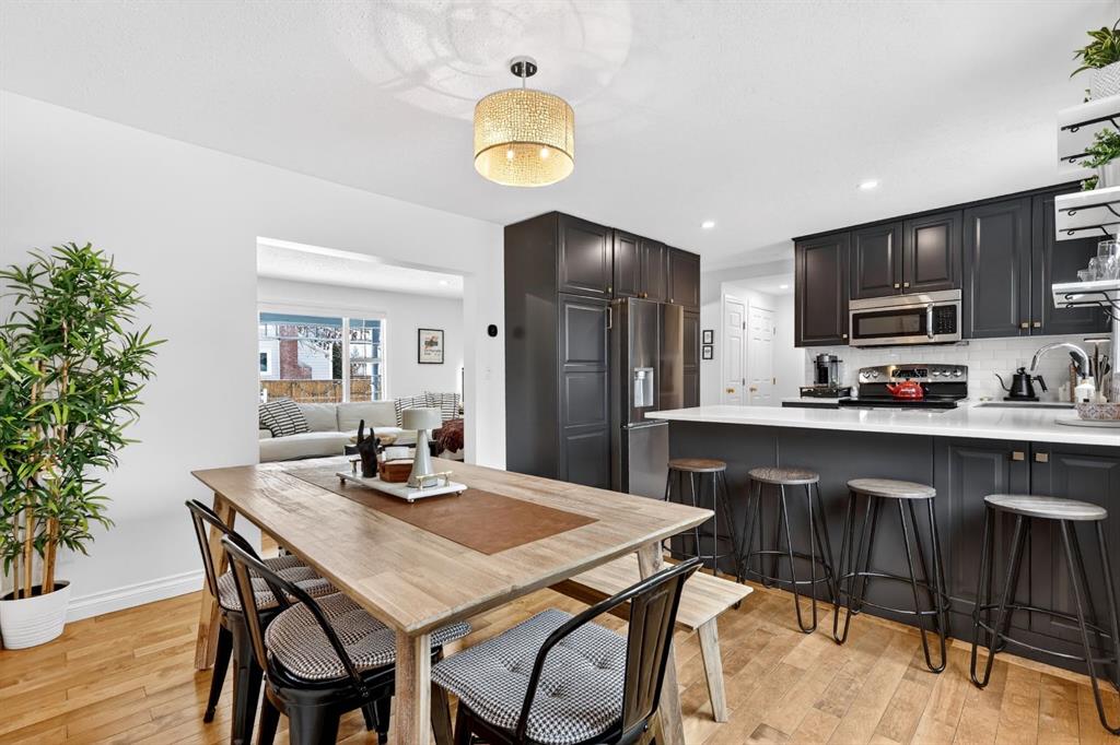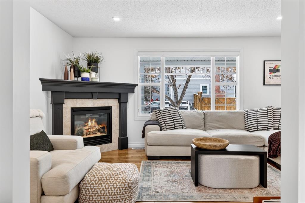 Welcome to this beautifully fully renovated semi-detached home in the established and highly sought-after community of Garrison Woods, perfectly designed for comfortable family living and summer enjoyment. The charming front porch and sun-drenched south-facing backyard create the ideal setting to soak up warm summer days. Step inside to a functional and inviting main floor featuring engineered hardwood flooring, a cozy living room warmed by a gas fireplace, a well-appointed dining area, and a spacious kitchen with breakfast bar, perfect for everyday living and entertaining. Large windows flood the home with abundant natural light.