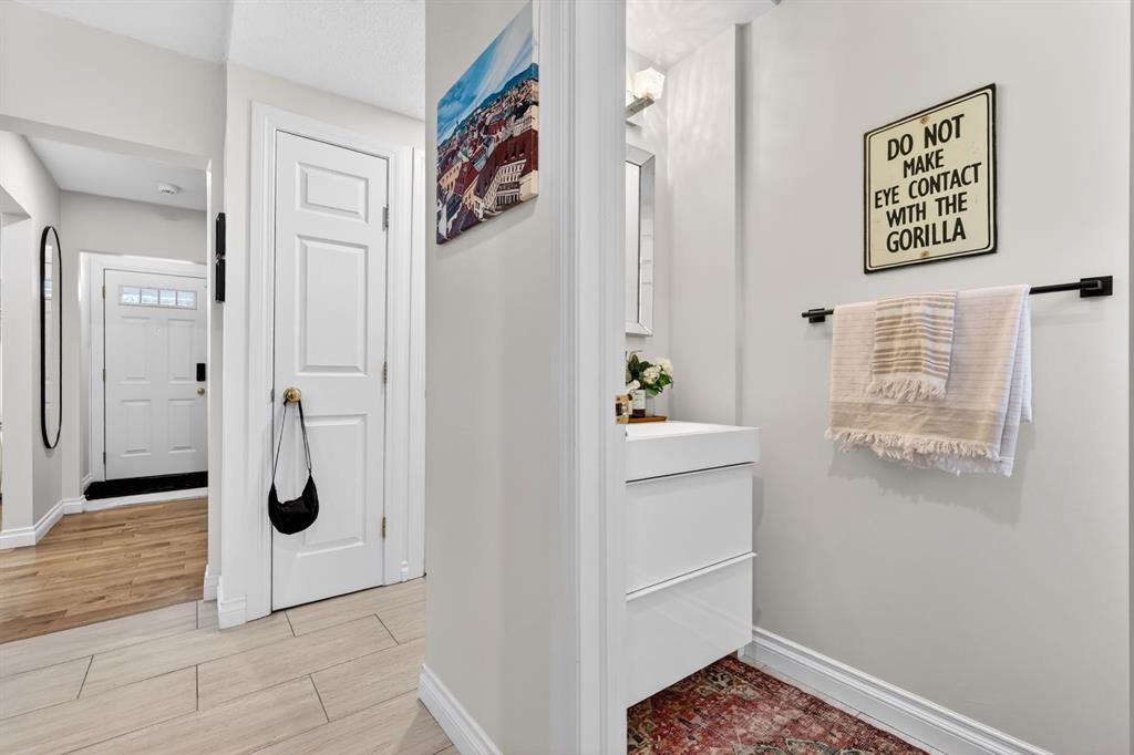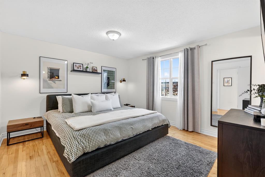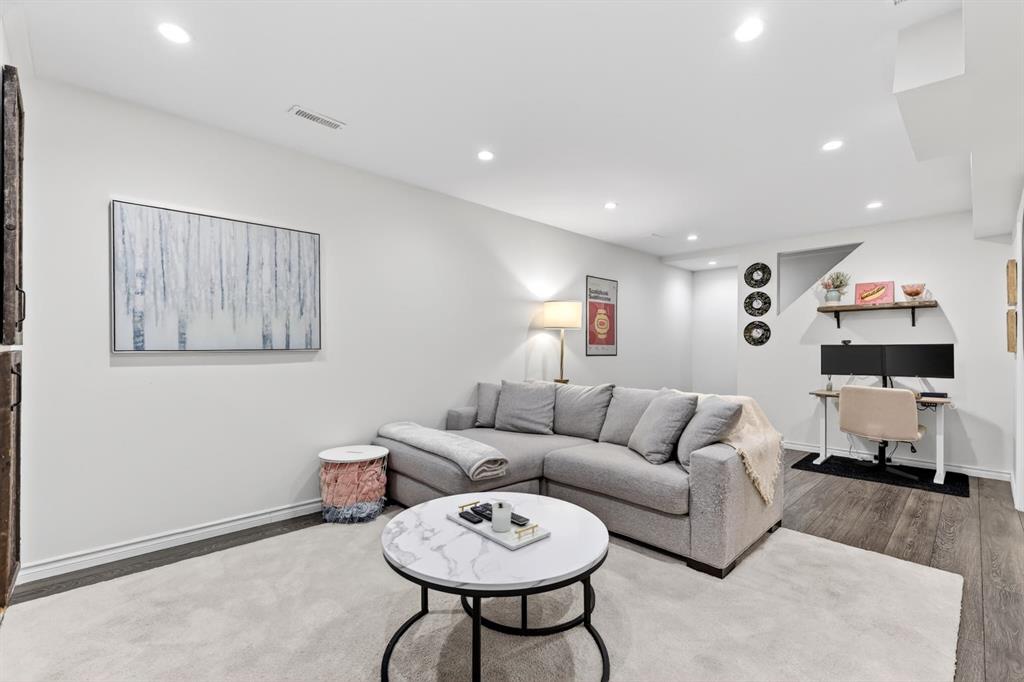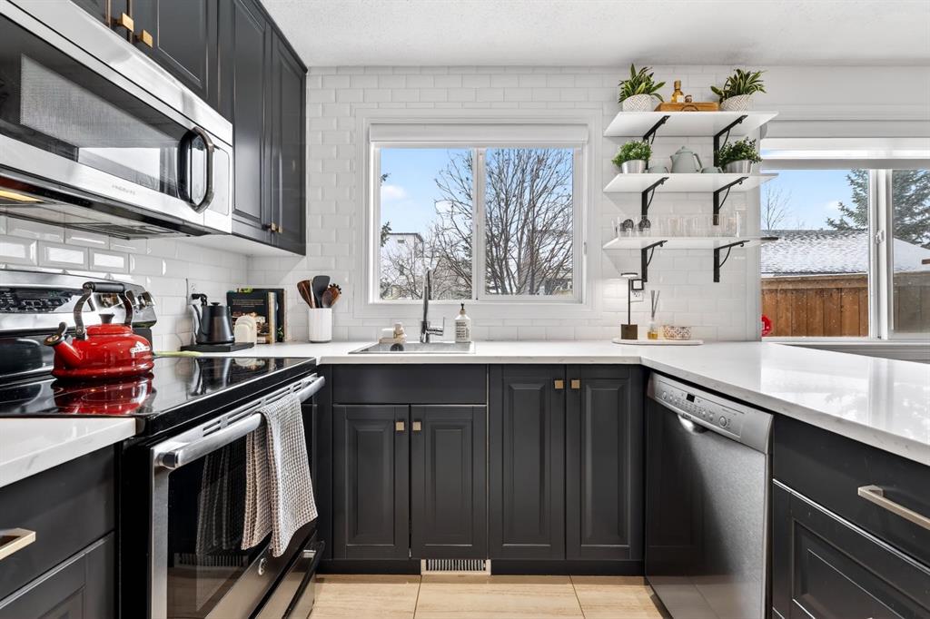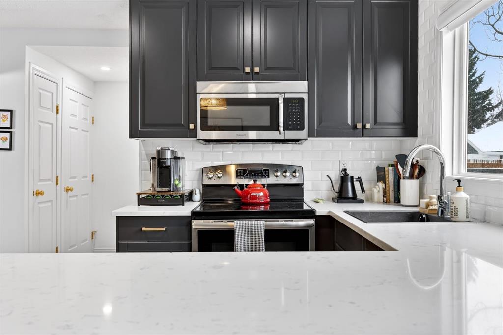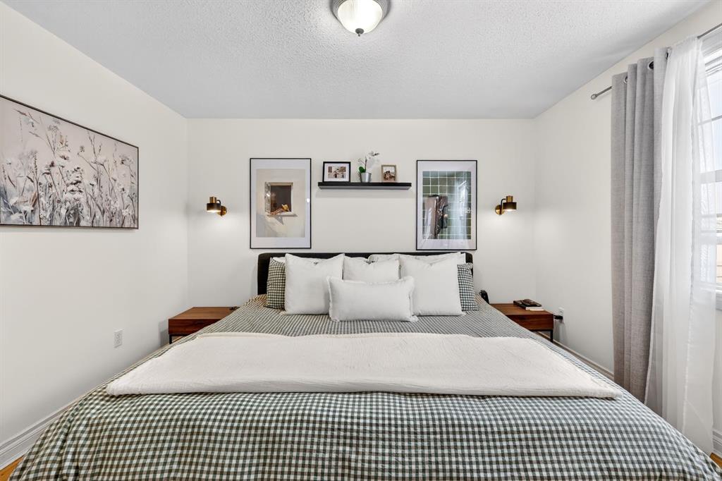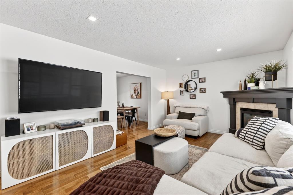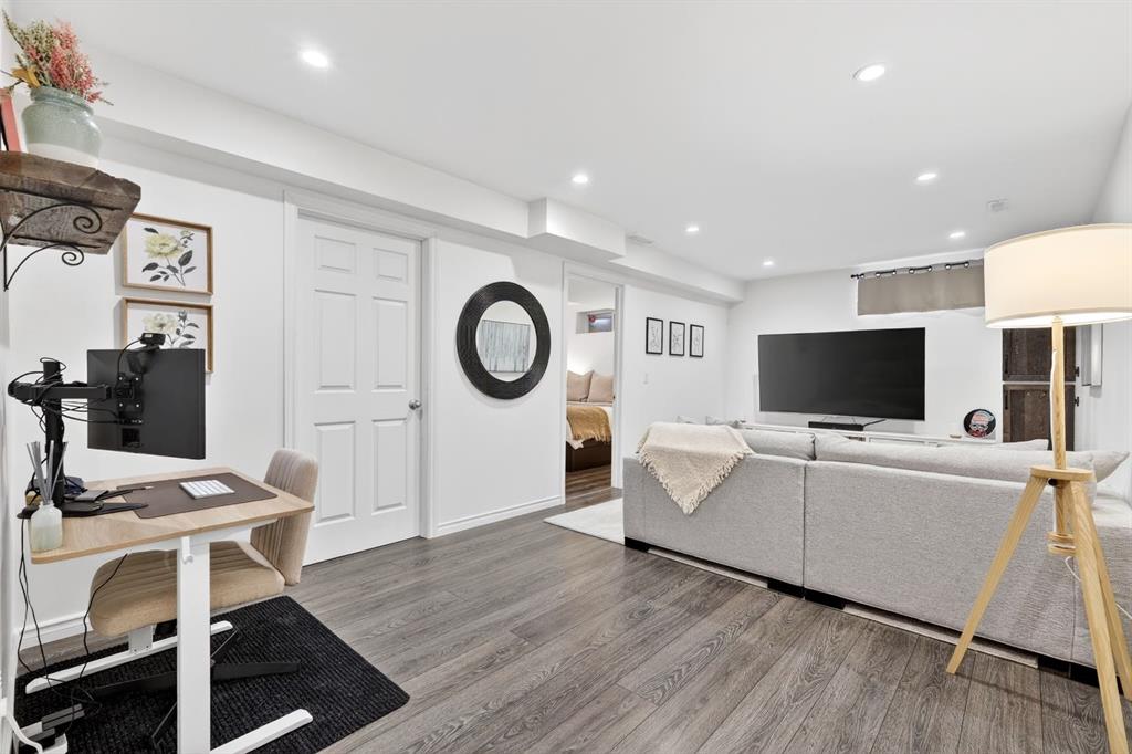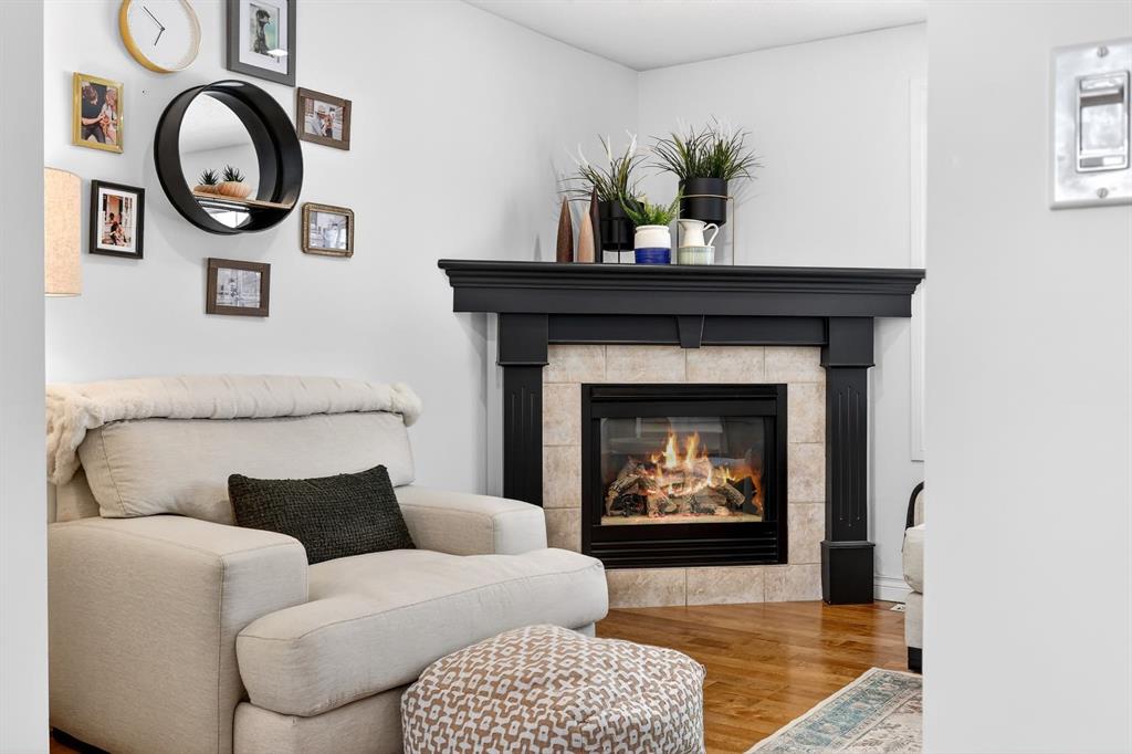 Welcome to this beautifully fully renovated semi-detached home in the established and highly sought-after community of Garrison Woods, perfectly designed for comfortable family living and summer enjoyment. The charming front porch and sun-drenched south-facing backyard create the ideal setting to soak up warm summer days. Step inside to a functional and inviting main floor featuring engineered hardwood flooring, a cozy living room warmed by a gas fireplace, a well-appointed dining area, and a spacious kitchen with breakfast bar, perfect for everyday living and entertaining. Large windows flood the home with abundant natural light.
