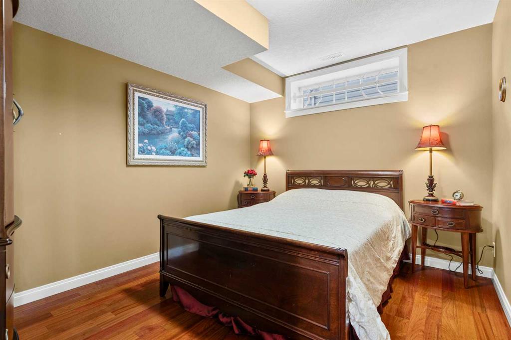The fully developed walkout basement offers a spacious recreation area with a second fireplace, a fifth bedroom, a 3-piece bath, a wine cellar, and an abundance of storage space. Step outside to a covered patio and landscaped yard.