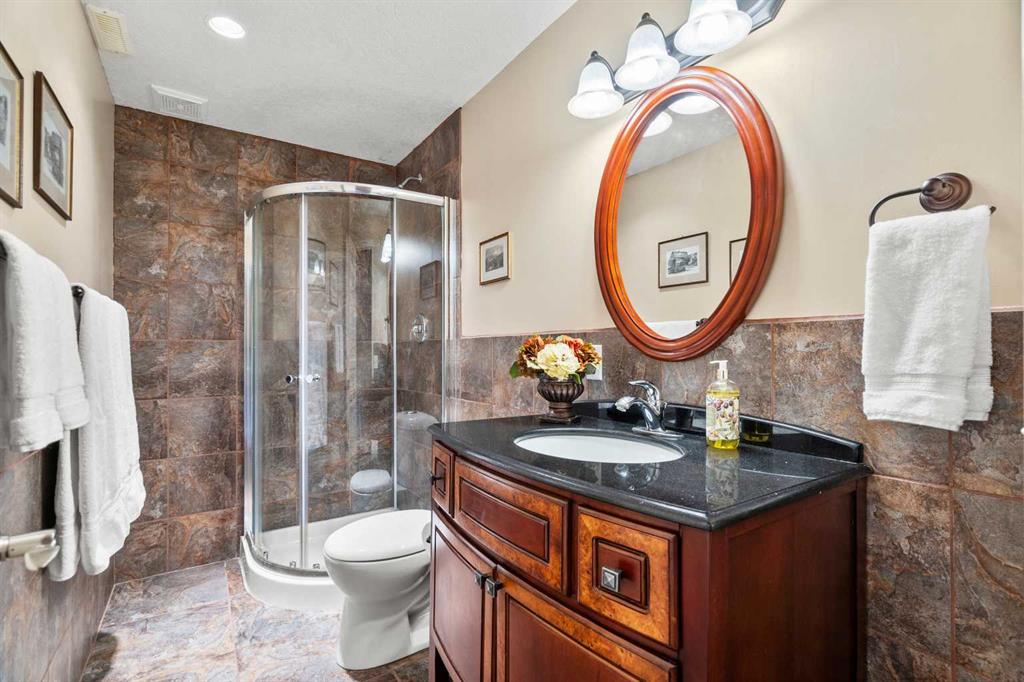 Upstairs, you’ll find four bedrooms, including a stunning primary suite with a 5-piece spa-inspired ensuite with in-floor heated marble floors, a large walk-in closet and beautiful mountain views. Just off the primary bedroom is a balcony to enjoy your morning coffee, the view and scenery. This level also includes an additional 5-piece bathroom with skylight and dual vanities and in-floor heated marble floors – comfort for the whole family.