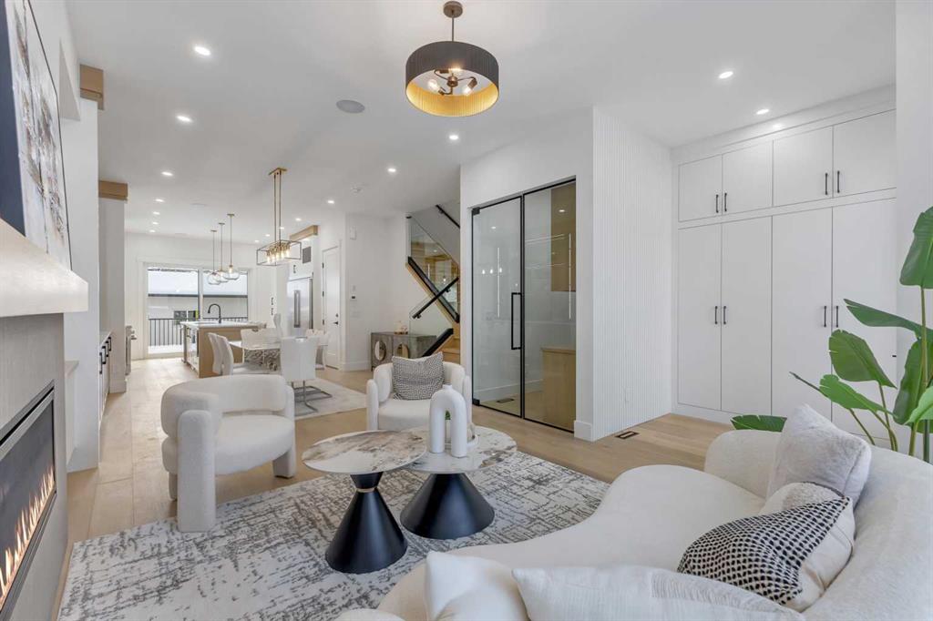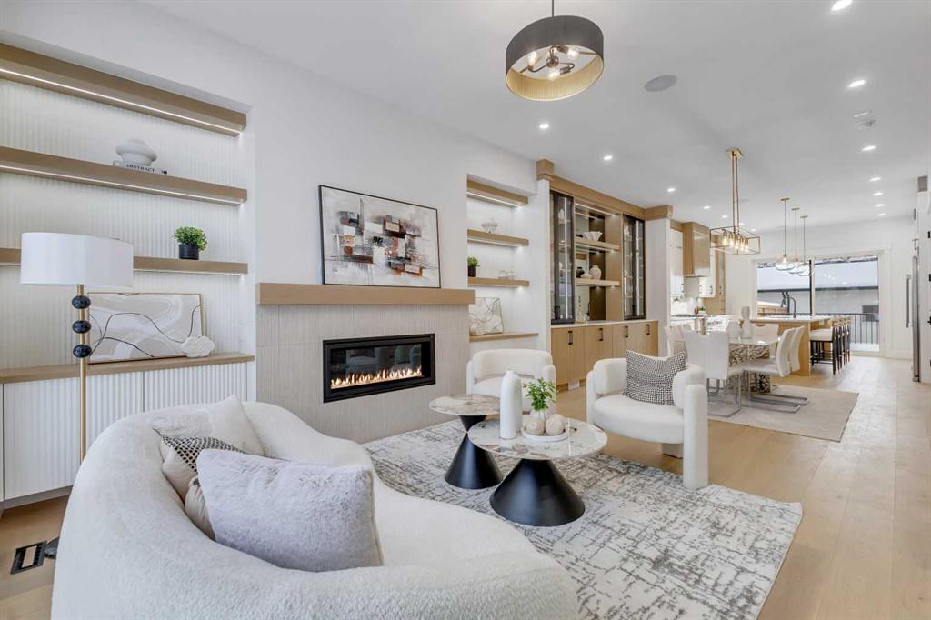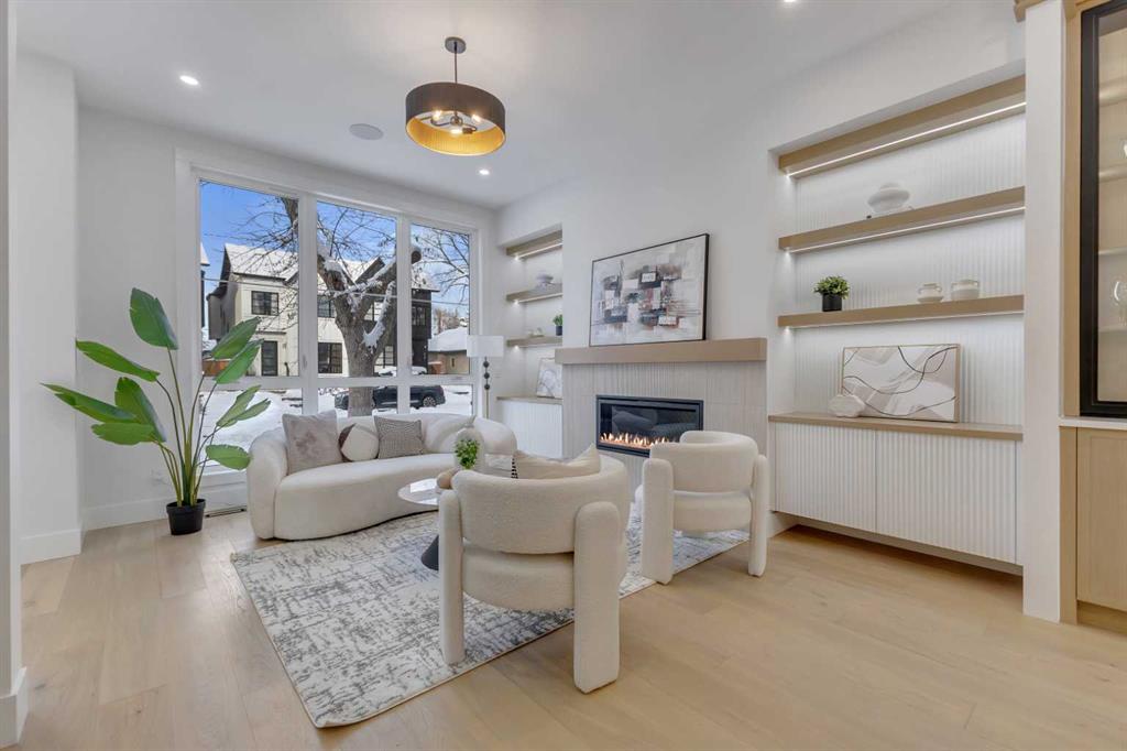 You enter through a spacious foyer with a full front closet and sightlines straight through to the living room. An OFFICE sits just off the entry, tucked away enough for privacy while still connected to the main level. The living room sits at the front with a gorgeous feature fireplace and built-in shelving that brings a clean, designer feel to the space. Large windows open to mature street trees, giving the room a soft, natural backdrop. The dining area sits comfortably between the living room and kitchen, sized for hosting without feeling overly formal, with an incredible custom built-in full wall serving space with decorative storage.