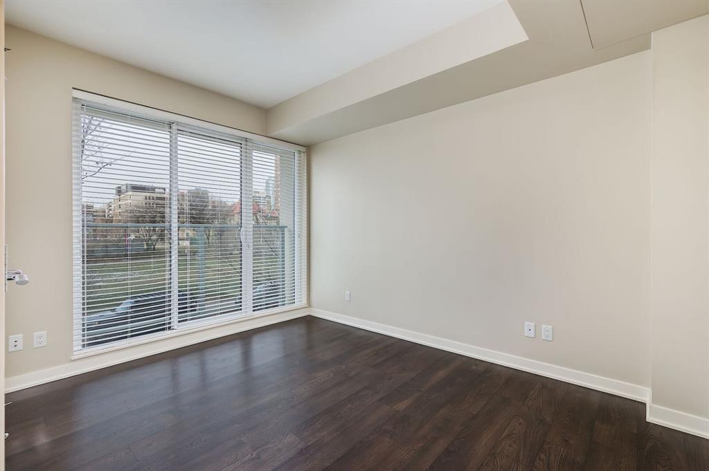 Inside, soaring 18-foot floor-to-ceiling windows flood the living space with natural light from both the south and west, highlighting the open-concept layout and durable laminate flooring throughout the main living areas and bedrooms. The spacious primary suite includes an ensuite bathroom and a Juliet balcony overlooking the park, while the versatile second bedroom with a walk-in closet is ideal as a home office or additional living space.
