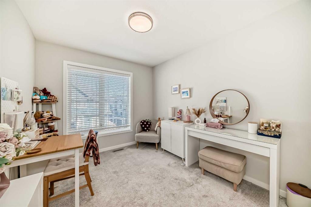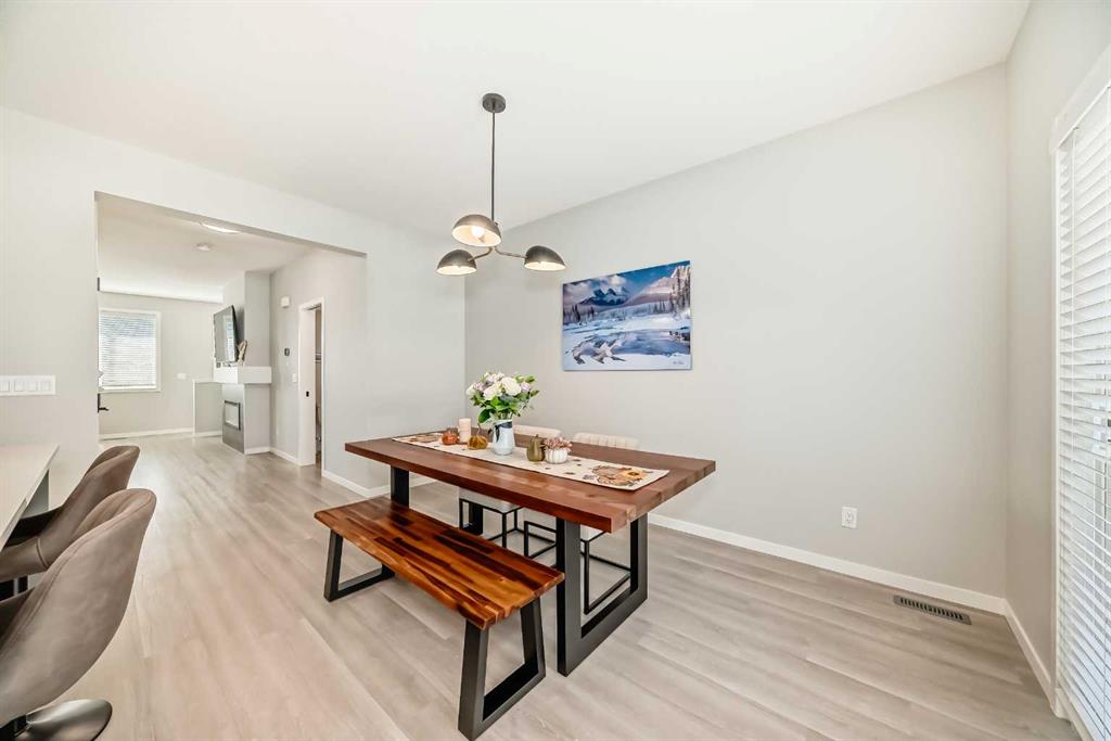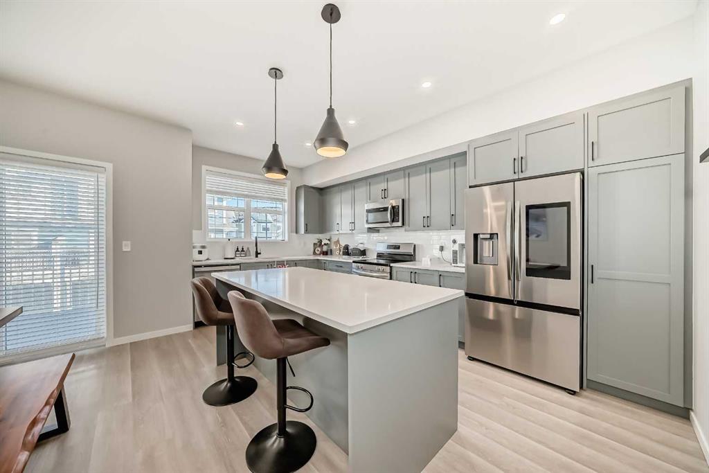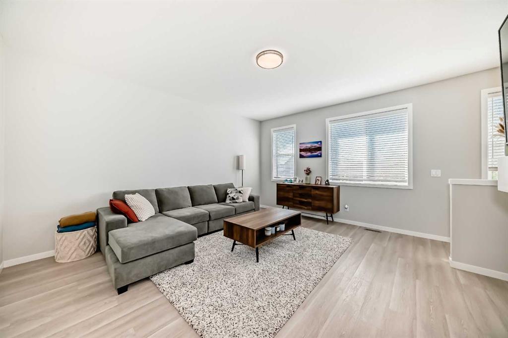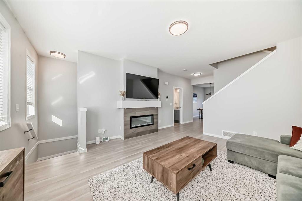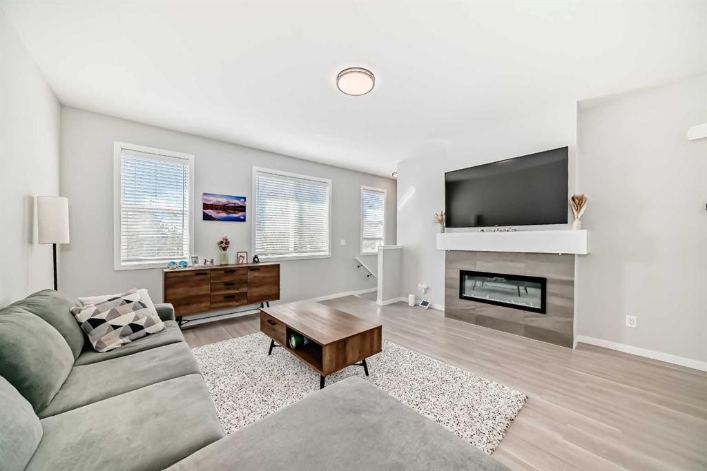 Welcome to this beautifully upgraded 2024-built townhome in the desirable community of Copperfield, offering over 2,000 sq. ft. of modern living space with a double attached garage. This bright and spacious 3-bedroom, 2.5-bath home features an open-concept main floor with large corner windows that fill the space with natural light. The gourmet kitchen includes quartz countertops, cabinetry, a large island, and an electric stove, perfect for both everyday living and entertaining. The living room is highlighted by a stylish electric fireplace and provides access to an oversized balcony with a BBQ gas line. Upstairs, the primary suite showcases breathtaking Rocky Mountain views, a walk-in closet, and a luxurious ensuite with dual vanities. Two additional bedrooms, a full bathroom, and convenient upper-floor laundry complete this level. The main floor flex room is fully developed and currently used as a home office, offering a quiet and functional space ideal for remote work or study. Enjoy added privacy with no townhomes directly behind, giving the backyard a more open, unobstructed feel. Located in a family-friendly, pet-friendly neighborhood, this home is just minutes from schools, parks, pathways, and everyday amenities. Modern finishes, open views, and a prime Copperfield location — this home truly has it all.