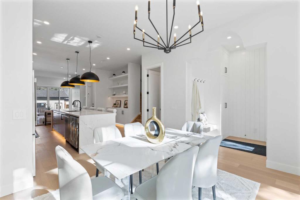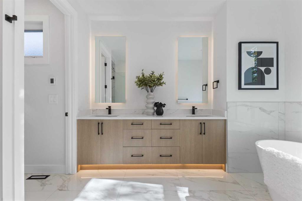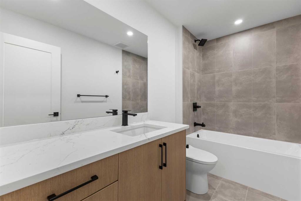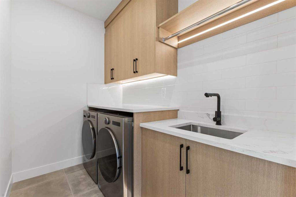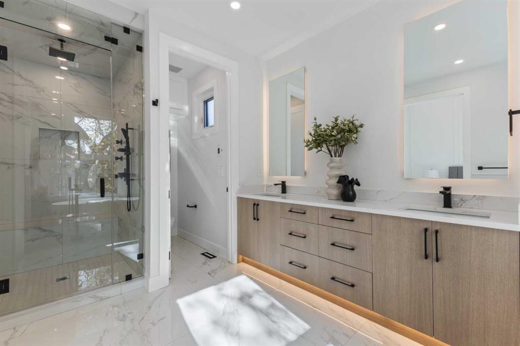 Sophisticated design and everyday function come together in this newly built semi-detached home, tucked onto a quiet, tree-lined street in the desirable community of Mount Pleasant. Spanning over 1,900 sq. ft. above grade, this home delivers 3 bedrooms, 2.5 bathrooms, and a thoughtfully designed legal 2-bedroom basement suite (approved by the city) – perfect for multigenerational living or added income potential. Just steps from Confederation Park and the amenities of the 4th Street corridor, this home offers the rare blend of luxury finishes, modern convenience, and unbeatable location. Step inside to 10’ ceilings, wide-plank engineered hardwood, and custom millwork that set an elevated tone from the start. At the front of the home, a bright dining space overlooks the tree canopy, while a discreet pocket office provides the perfect work-from-home setup with a built-in desk and storage. The heart of the main level is the chef’s kitchen, featuring a striking two-tone design with full-height cabinetry, quartz counters, a waterfall island with seating, and premium appliances including a panel-ready fridge, gas range, wall oven, and custom hood fan. A built-in pantry wall and oversized island ensure both form and function. Beyond, the living room invites gatherings with its gas fireplace surrounded by sleek tile and floating shelves. Large sliding doors flood the space with natural light and extend the living area into the landscaped backyard. At the rear, a mudroom with built-in lockers and a powder room keep daily comings and goings seamless. The second level is designed for family living. The primary retreat is a true sanctuary with soaring vaulted ceilings, oversized windows, and a large walk-in closet. The spa-inspired ensuite features heated tile floors, dual vanities, a freestanding soaker tub, glass-enclosed shower with dual showerheads, and private water closet. Two additional bedrooms with custom closets, a 4-piece bath, and a full laundry room with sink and cabinetry complete this level. The fully finished basement is a legal 2-bedroom suite with its own private side entrance. Finished to the same high standards as the upper floors, the suite includes a bright kitchen with quartz counters and stainless steel appliances, an open-concept living and dining space, a 4-piece bathroom, in-suite laundry, and two comfortable bedrooms with ample closet space. Perfect for extended family, guests, or rental income, it’s a flexible space that adds both livability and long-term value. Enjoy indoor-outdoor living with a private, north-facing backyard that’s ideal for summer entertaining. A double detached garage provides secure parking and storage. Mount Pleasant is one of Calgary’s most connected neighbourhoods, offering quick access to downtown, 16th Avenue, and major commuter routes. You’re walking distance to Confederation Park, playgrounds, and top-rated schools, with local favourites like Velvet Café, 4th Spot Kitchen & Bar, and Milk Ice Cream nearby.