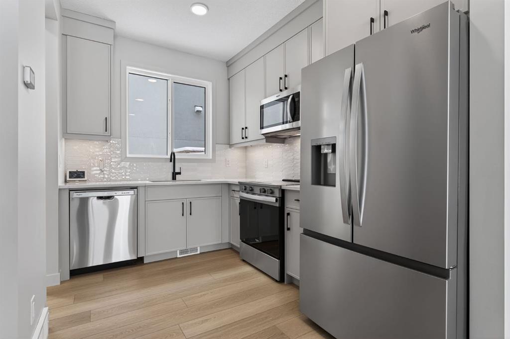 Inside, the home spans three well-designed levels with a north to south orientation that allows natural light to move through the space from morning to evening. The main floor is both functional and refined, featuring 9 foot ceilings, wide plank flooring, and a streamlined open concept kitchen with full height cabinetry, quartz countertops, and generous storage. The living space extends seamlessly outdoors, offering both a front patio and a private, fenced south facing backyard with a deck, ideal for everyday living and entertaining.