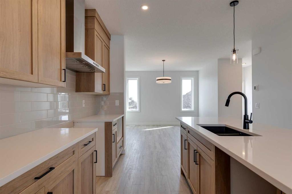 Welcome to the beautiful community of Southbow Landing. This well designed 3 bedroom, 2.5 bath home offers 1,782 ft² of functional and stylish living space. Step inside to a bright, sunny front living room centred around a cozy fireplace, creating a comfortable space to relax or gather. The home flows naturally into the kitchen and dining area located at the back of the house, overlooking the yard and offering a great layout for both everyday living and hosting. The kitchen is a standout, featuring warm light brown cabinetry, coordinating light quartz countertops, a large pantry, and a striking black Silgranit sink with black fixtures that add modern contrast and style. At the rear of the home, you’ll find a convenient closet at the back entrance along with a 2 piece bathroom. Upstairs offers a family friendly layout with three bedrooms, a full size linen closet, two full bathrooms, and an upper laundry area for everyday convenience. The basement is ready for your future plans, featuring 9 foot ceilings and rough in plumbing for a future bathroom. A garage pad is already in place for construction of a future double garage.