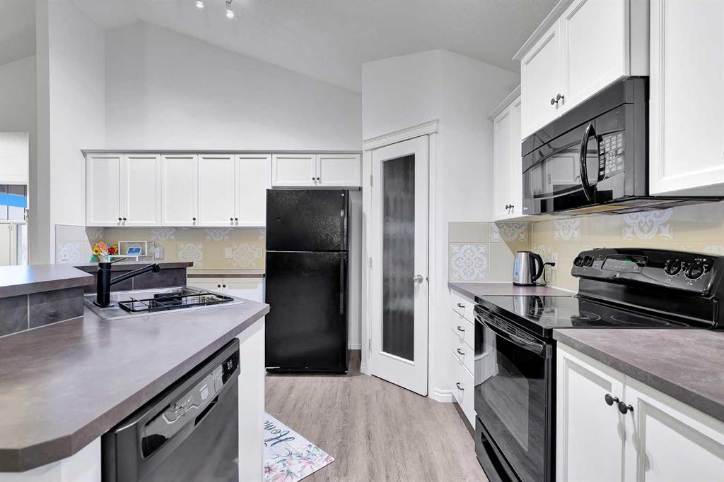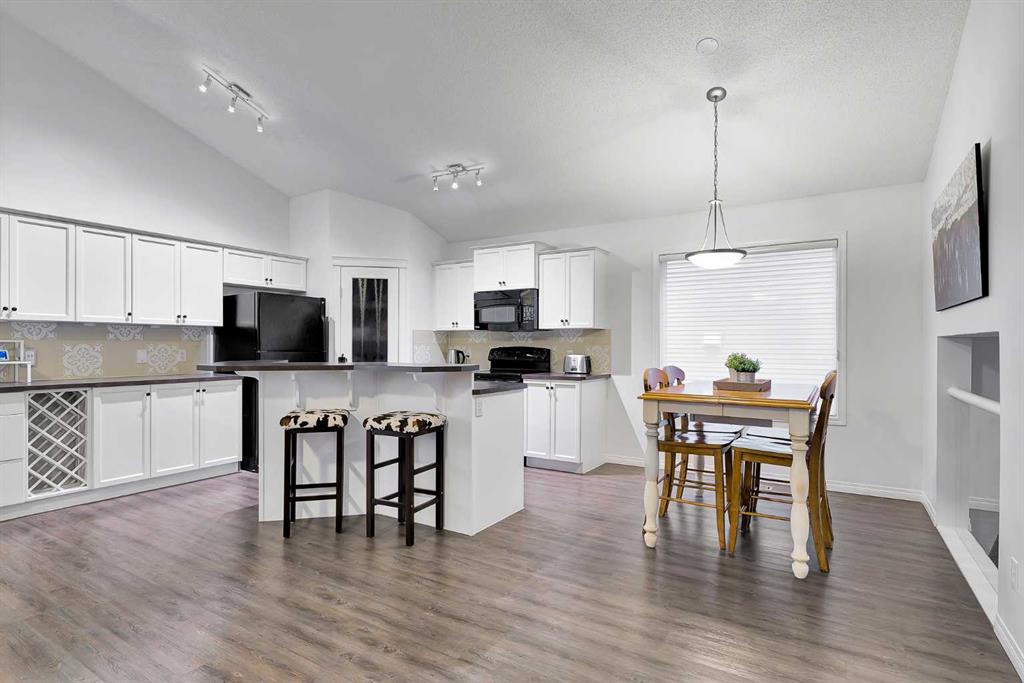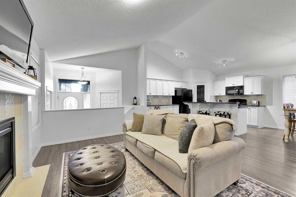 A short flight of stairs leads to the heart of the home, where an eye-catching vaulted ceiling creates an airy, open feel. The main living area features a cozy gas fireplace and an open-concept kitchen, dining, and living space finished with seamless vinyl plank flooring and a separate kitchen island that delivers warm, country-kitchen vibes—ideal for everyday living and entertaining.