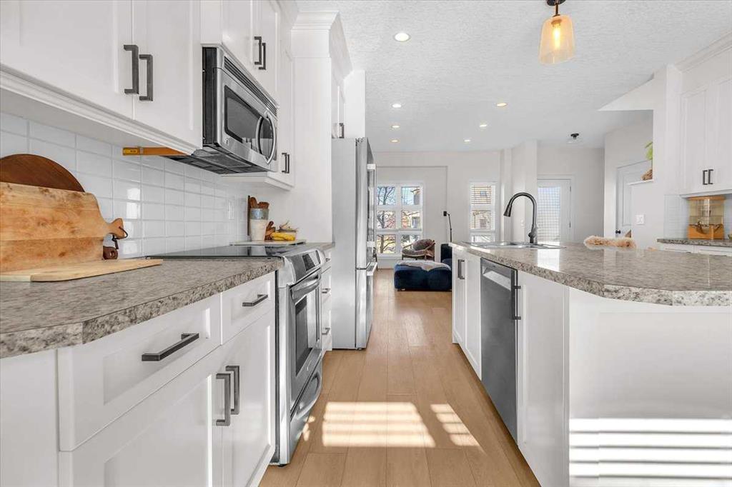 Welcome to this stunning two-storey in the heart of Walden, offering over 1,700 sq. ft. of beautifully developed living space. From the moment you step inside, you’ll appreciate the renovated kitchen with full-height cabinetry, newer appliances and modern finishes—a perfect blend of function and style. The main floor features 9-foot ceilings, stylish flooring, and an open-concept layout that’s bright, inviting, and ideal for entertaining.