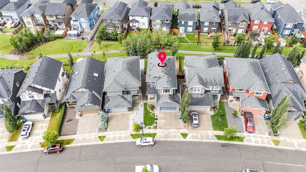 Welcome to this stunning, impeccably maintained home in one of Airdrie’s most sought-after upscale communities! Offering over 3,200 square feet of beautifully finished living space (just over 2,200 sq ft above grade plus 1000+ sq ft in the fully developed walkout basement), this 4-bedroom, 3.5-bathroom home is bright, sunny, and move-in ready. Backing directly onto a serene green space with walking paths and parks nearby, this home combines privacy, functionality, and luxury. The main floor features a spacious den perfect for a home office, a large front foyer, and a welcoming two-storey entrance with upgraded open railings that make a grand first impression. The open-concept living room includes a gas fireplace, and the generous dining area leads to the west-facing backyard—perfect for sunsets and evening entertaining. The gourmet kitchen is a chef’s dream with granite countertops, a gas cooktop with wall oven, pot and pan drawers, and a walk-through pantry connecting to the oversized mudroom. Upstairs, you’ll find a large bonus room, upper-level laundry, and three generous bedrooms, including the luxurious primary suite with vaulted ceilings, a walk-in closet, and a spa-inspired ensuite featuring dual vanities, a soaker tub, an oversized shower, and a private water closet. The fully finished walkout basement includes a kitchenette, a spacious fourth bedroom, full bathroom, and plenty of storage. Step out to the beautifully landscaped backyard complete with a hot tub, mature trees, and room to relax or entertain. Additional features include central air conditioning, tons of storage throughout, and a fantastic location close to schools (including a K-12 Francophone school), shopping, pathways, and parks. This immaculate, turn-key home offers space, style, and an unbeatable location—ready for its new family!