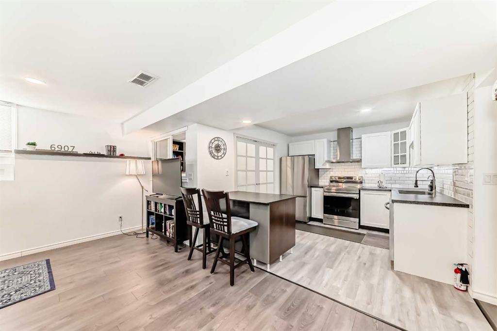 The basement has been fully renovated — including a brand-new kitchen and bathroom (new cabinets, tile, bathtub, toilet, shower door, and exhaust fan), new laminate flooring throughout, fresh paint, smooth ceiling, upgraded LED recessed lighting, added pantry and laundry hook-up, and all new appliances (dishwasher, range/oven, refrigerator, dryer).