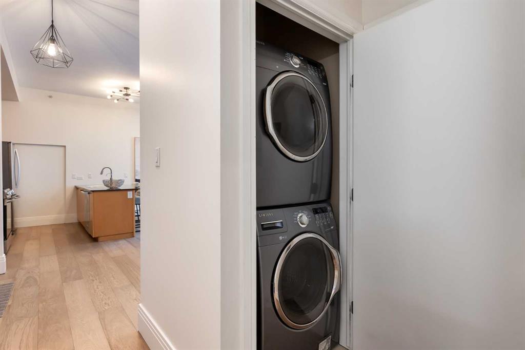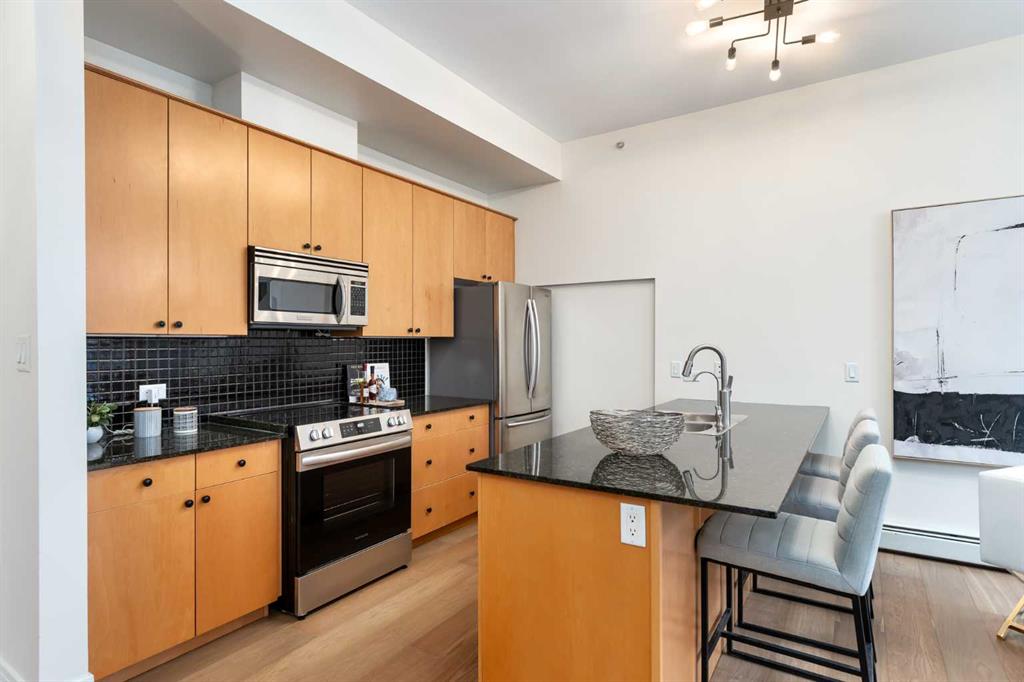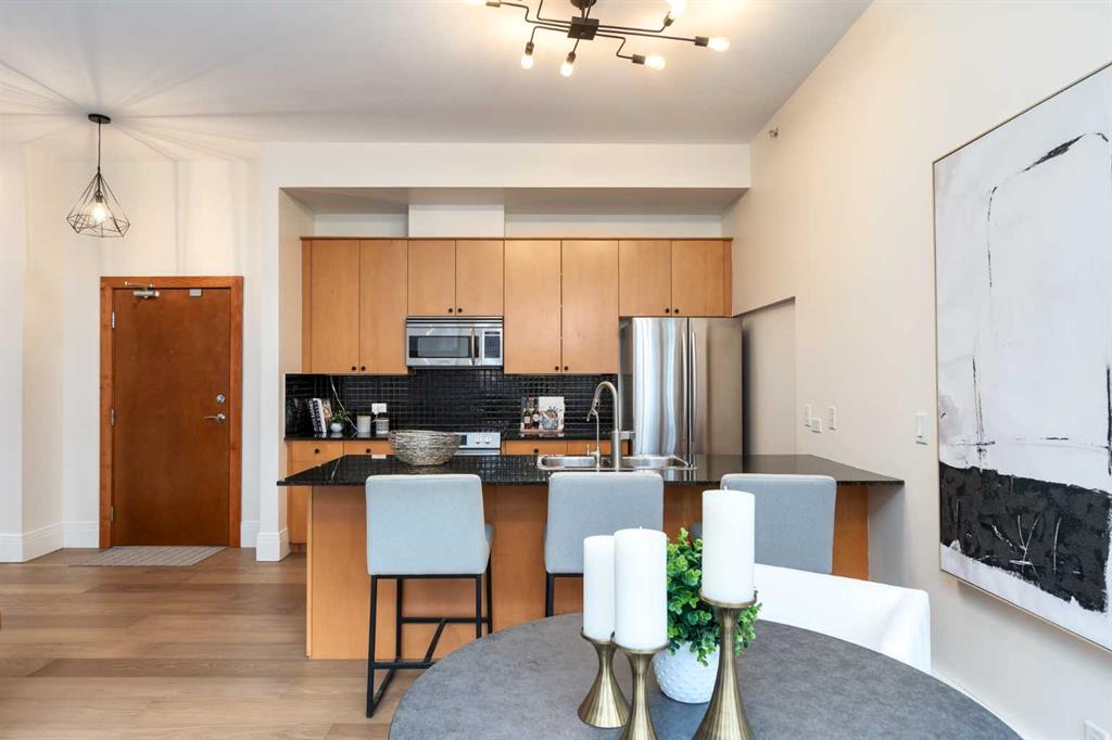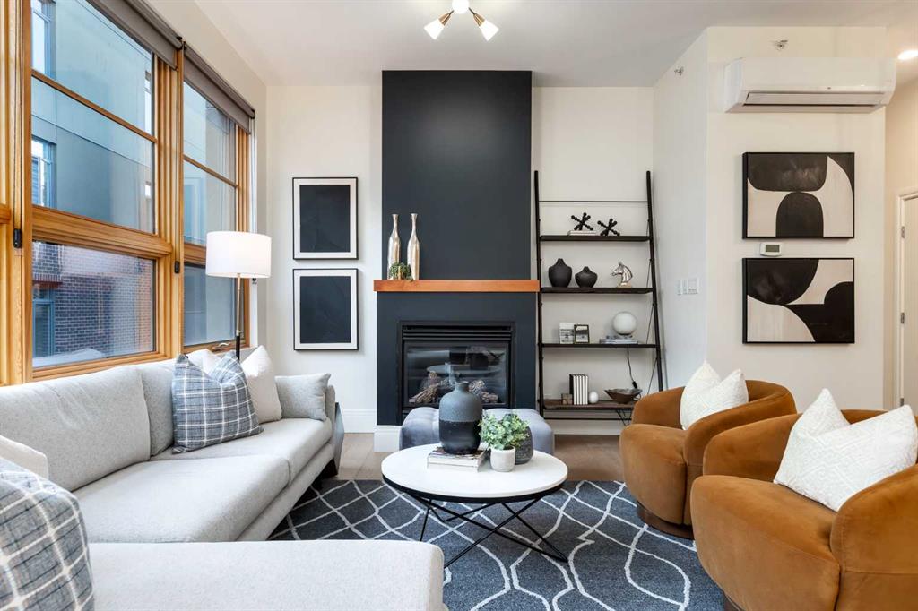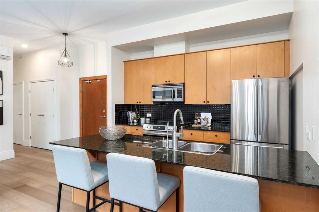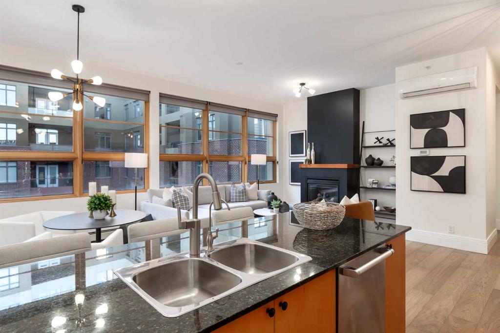 Step into this stunning 2-bedroom, 2-bathroom condo in one of Calgary’s most sought-after inner-city neighbourhoods. With brand new hardwood flooring throughout and gorgeous wood-frame windows that flood the space with natural light, this home blends warmth and modern sophistication effortlessly. The open-concept living and dining area is anchored by a gas fireplace set against a striking dark feature wall, perfect for cozy evenings in. A sleek kitchen with granite countertops, stainless steel appliances, and a black tile backsplash flows seamlessly into the entertaining space, with bar seating at the island for casual meals. The generous primary bedroom easily accommodates a king-size bed with plenty of room to spare, and features a large walk-in closet and ensuite bathroom. One of this home’s standout features is its private rooftop patio, a rare find! Offering sweeping neighbourhood views and the perfect spot for summer dinners and morning coffee. Speaking of coffee, there’s a Starbucks on the main floor of the building for those on-the-go mornings. Additional highlights include underground parking, and condo fees that cover all utilities except electricity. Located in the heart of Bridgeland, you’re steps from the pathways, local shops, plenty of restaurants, and just minutes to downtown Calgary. This is the lifestyle you’ve been looking for.