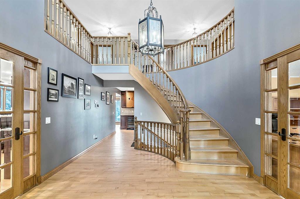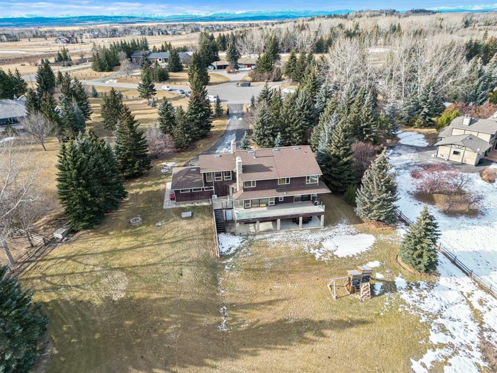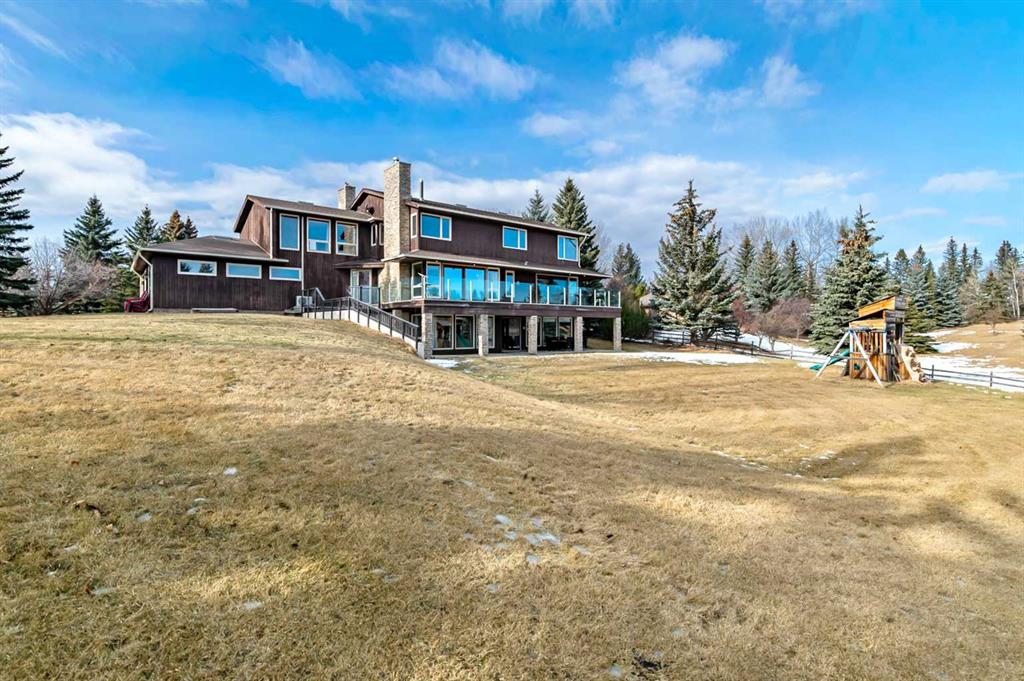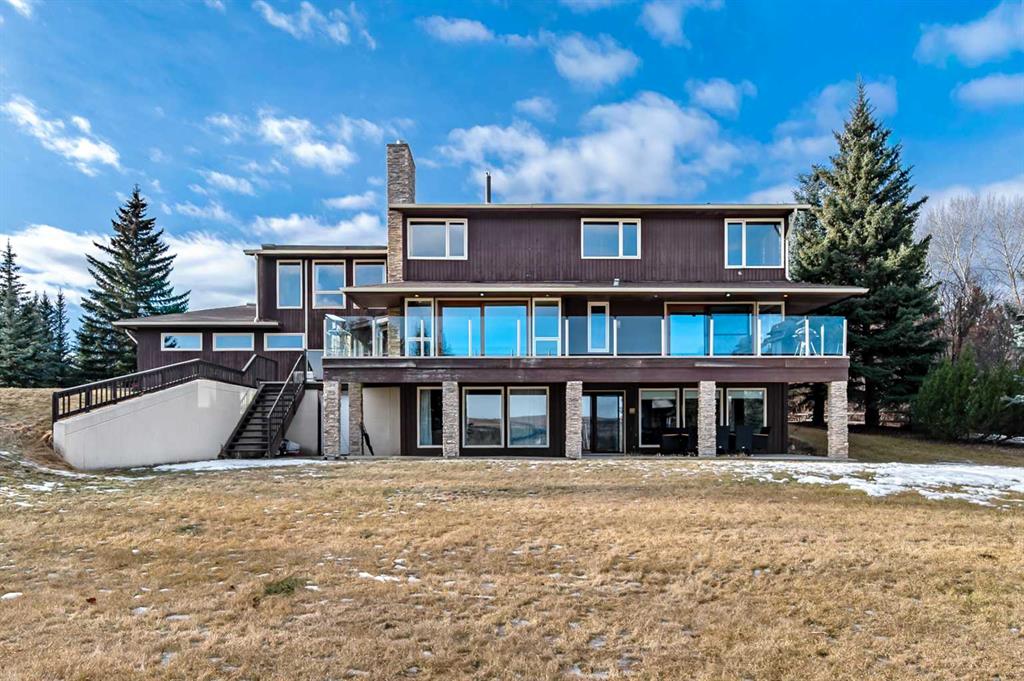 VIEWS VIEWS VIEWS! Welcome to this exceptional seven-bedroom, three-and-a-half-bathroom estate home in the prestigious Elbow River Estates community. Offering over 3,700 square feet of thoughtfully designed living space, this impressive two-storey residence is perfectly positioned on a premium lot capturing fantastic mountain views from the front and sweeping, unobstructed panoramas over the Glencoe Golf Course from the rear. A grand two-storey foyer with a graceful, curved staircase sets an elegant tone upon arrival. The main level is designed to highlight the scenery, featuring a warm and inviting living room with a wood-burning fireplace and large windows that frame the picturesque surroundings. The formal dining room, highlighted by a charming bump-out, provides an ideal setting for hosting. The beautifully updated kitchen is appointed with granite countertops, oak cabinetry, stainless steel appliances, and a built-in desk, all while enjoying serene backyard views. The adjoining family room, centered around a cozy gas fireplace, opens through sliding doors to a spacious deck—an outstanding vantage point to take in the spectacular golf course vistas and unforgettable sunsets. Upstairs, the primary suite offers a luxurious private retreat enhanced by beautiful views and a two-sided gas fireplace that separates the sleeping area from a tranquil sitting space. Four additional generously sized bedrooms and a full bathroom complete the upper level, offering comfort and flexibility for family or guests. The fully developed walkout lower level continues to impress with stunning, uninterrupted views of the golf course, along with an additional bedroom, recreation room, den, wine room, and abundant storage and utility areas. Step outside to enjoy the peaceful setting and expansive open landscape beyond. A triple attached garage and a well-designed mudroom with laundry and built-in storage add everyday convenience. Residents of Elbow River Estates enjoy access to exceptional community amenities including a playground, tennis and basketball courts, a seasonal outdoor rink, and a community horse arena—all just minutes from Calgary. Nearby Clearwater Park and Calgary Academy further enhance this highly desirable location. This is a rare opportunity to own a remarkable home defined by space and truly fantastic views in one of the area’s most sought-after communities!