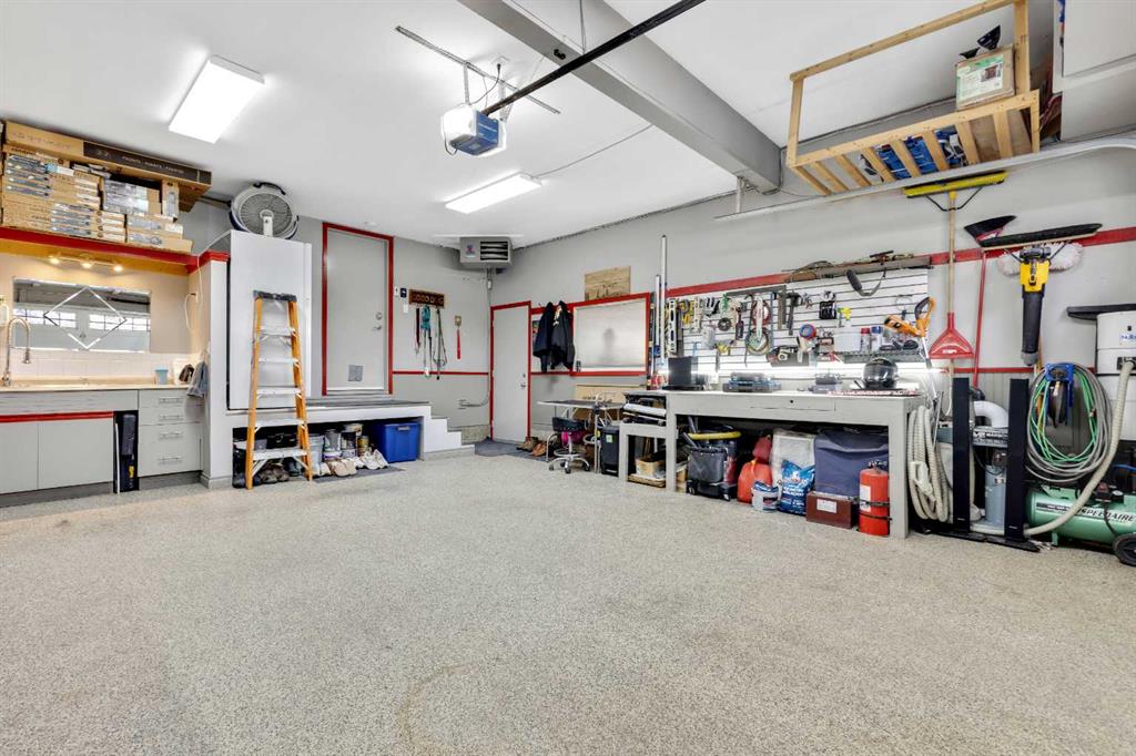 Over the top 24′ deep X 21′ wide, 8′ high door garage masterpiece: epoxy floor (2015), full wainscoting, built-in cabinets/sink/checker plate counters, saw table, slotted tool wall, central vac, air compressor w/reel & 50′ hose. Multi-camera hardwired security system + 2 Ring doorbells (2020), 3-zone underground sprinklers (2022), epoxy stone driveway/walkways, new sod (2022)