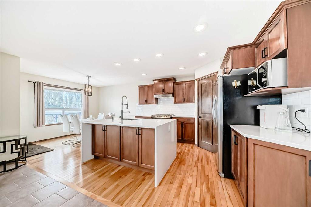 Welcome to this exceptionally well-maintained home that blends comfort, style, and everyday functionality. The open-concept main floor showcases a spacious kitchen featuring contemporary cabinetry, upgraded appliances, a convenient corner pantry, and a large island complete with quartz countertops and elegant waterfall edges. The inviting living room is centered around a stunning stone fireplace—perfect for cozy evenings—while the bright dining area overlooks the backyard, creating an ideal space for both daily living and entertaining guests. Step outside to enjoy a thoughtfully designed two-tier deck with a gazebo, leading to a private, professionally landscaped yard—perfect for outdoor relaxation. Upstairs, a generous bonus room with built-in cabinetry and a gas fireplace offers a versatile space for family gatherings or a quiet retreat. The primary bedroom features a walk-in closet and a well-appointed four-piece ensuite. Additional bedrooms are comfortably sized and share a full bathroom. The fully developed basement provides valuable extra living space, including a fourth bedroom, a full bathroom, and ample storage. A double attached heated garage with an epoxy-coated floor and built-in shelving adds both practicality and convenience. Ideally located close to schools, parks, shopping, public transit, and a nearby fire station—an added benefit that may help reduce insurance costs—this home offers an outstanding combination of lifestyle and location. Don’t miss this opportunity—book your showing today, as this property is sure to attract strong interest!