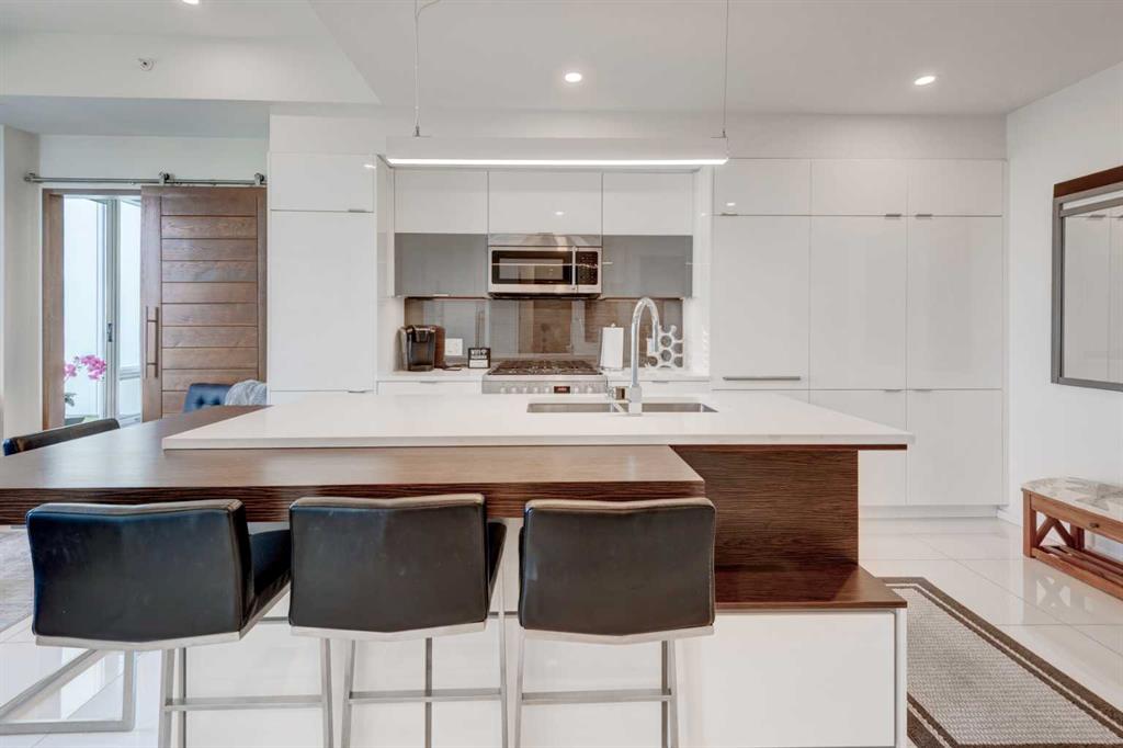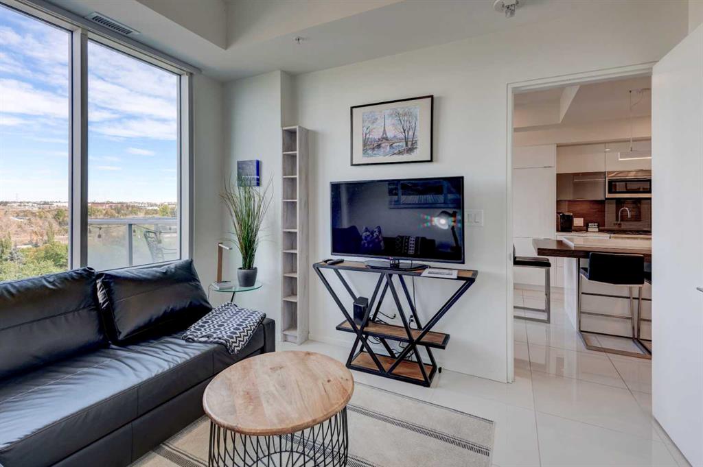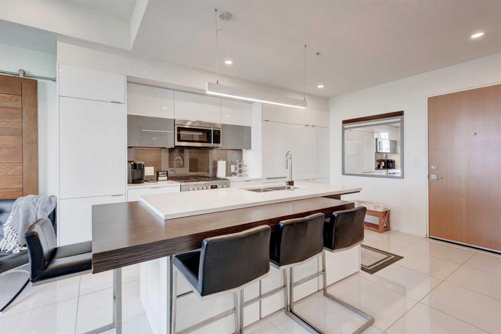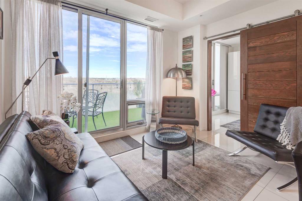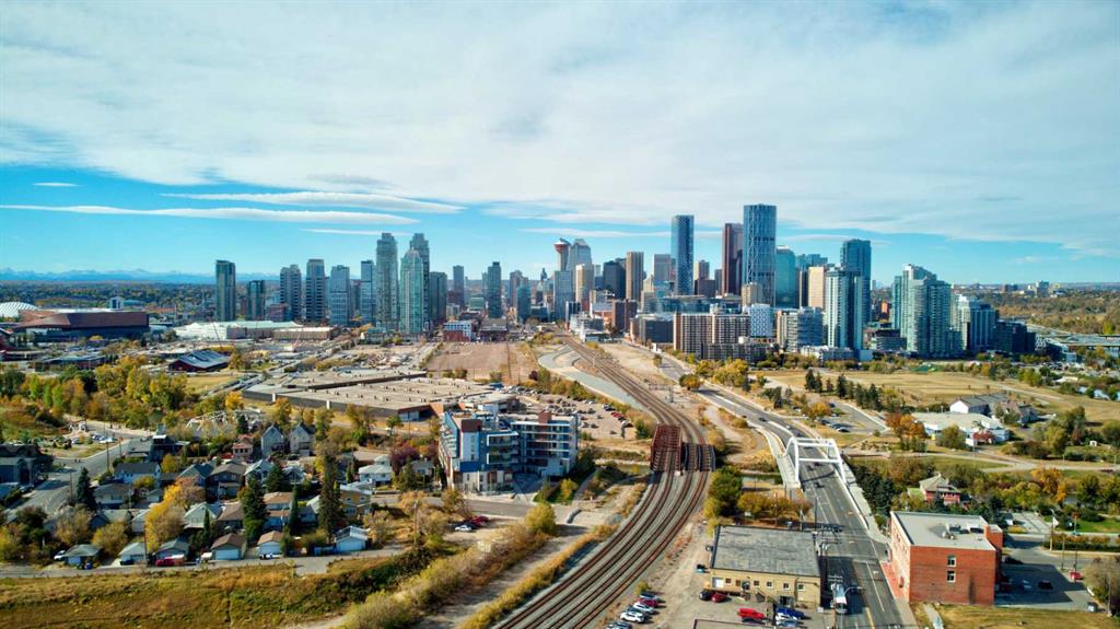 Welcome to unit 704 in The Avli in Inglewood a great unit in a pet friendly building. This TOP FLOOR unit with beautiful north views of the Calgary Zoo, Bow river and Bridgeland features 2 bedrooms – 2 bathrooms, titled underground parking and an additional storage locker. This is a great balance of modern style and functionality with sleek flooring, solid barn style sliding doors and modern lighting. The kitchen features a large quartz island with an extended wood eating counter, tons of cabinetry and European style integrated appliances. Primary bedroom has direct slider access to the large north facing balcony, built in wardrobes and a 4 piece ensuite with dual floating vanity and glass door shower. Second bedroom and bathroom are on the opposite side on the unit, perfect for guests. The flex space is ideal for a home office or additional storage. Building amenities include heated visitor parking, guest suite, car wash bay, bike locker and a large 3rd floor outdoor social space for larger gatherings. The Avli is a modern sleek stylish building in the heart of Inglewood that is well taken care of, very well managed and steps away from great restaurants, shopping, downtown, The Saddledome, Bow River and the Calgary Zoo.