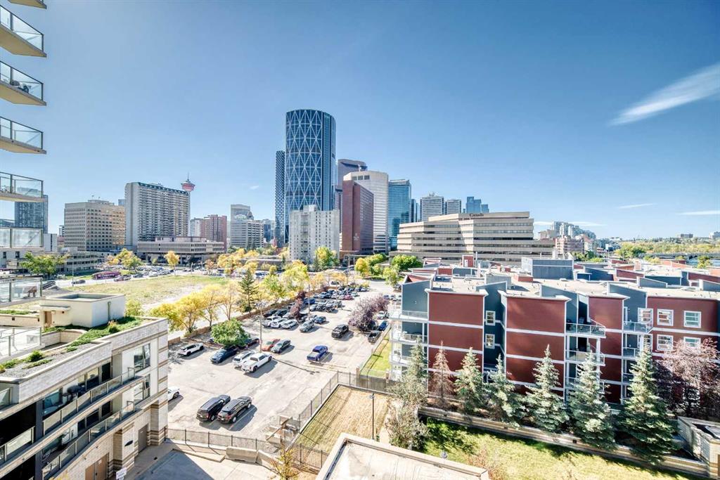 Welcome to Riverfront Pointe! This bright 7th floor west corner suite offers 2 bedrooms, 2 bathrooms + a flex/office area with unobstructed views of the Bow River and Downtown skyline. The open-concept layout features granite counters, designer tile backsplash, black appliances, eating bar, laminate flooring, and floor-to-ceiling windows that flood the home with natural light. The primary bedroom includes a 4-piece ensuite, while the second bedroom and full bath add flexibility for guests or a home office. In-suite laundry adds everyday convenienc Building amenities include a fitness centre, landscaped courtyard, concierge service, keyless entry, bike storage, and a titled underground parking stall located just steps from the elevator. Enjoy the ultimate urban lifestyle—walk to the Calgary Zoo in 10 minutes, City Hall LRT in 2 blocks. Enjoy being steps away from river pathways, parks, Chinatown, Eau Claire, and the best of downtown dining and entertainment. An excellent investment opportunity—previous tenant paid $2,500/month. Pet-friendly (with board approval).