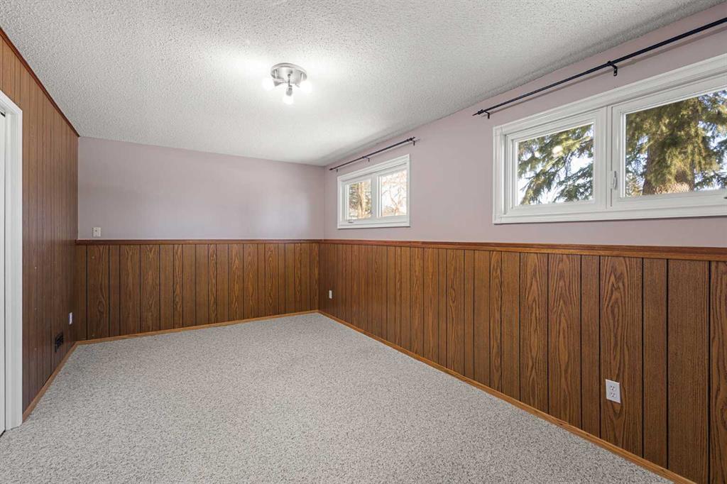 The fully developed basement features a large family room with a play or office area and nice windows. A gas fireplace is set into a striking brick feature wall with ample display space for family photos. Two additional bedrooms—one generously sized—a full bathroom with a window, under-the-stairs storage, and a laundry room complete the lower level.