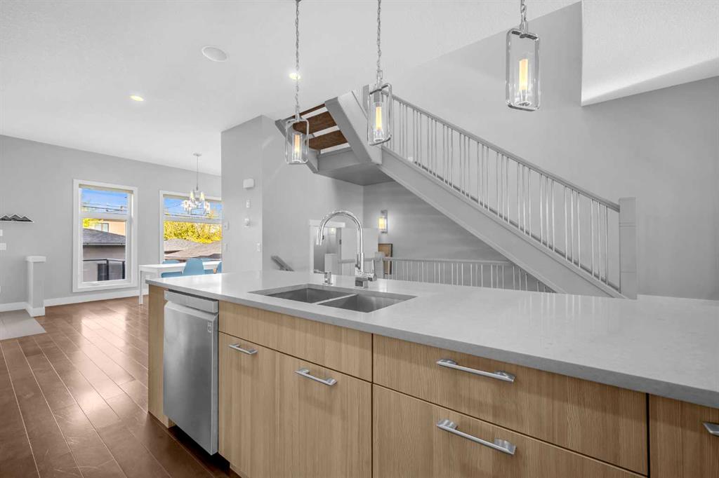 Welcome to this beautifully designed and extensively upgraded home in the highly desirable inner-city community of Mount Pleasant. Boasting over 2,800 sqft, this home stands out with architectural detail and premium finishes not found in typical infills. The main floor is a showstopper, featuring soaring ceilings, rich hardwood floors, and an inspired open-concept layout. The chef’s kitchen is anchored by an oversized quartz-covered island and features a gas cooktop, stainless steel appliance package, abundant cabinetry, and designer lighting — ideal for both daily living and entertaining. Sunlight pours into the south-facing living room, where an impressive feature wall with a fireplace and custom built-in units create a warm, inviting focal point. A spacious dining area connects seamlessly, offering plenty of room to host gatherings with friends and family. A striking open-tread staircase leads to the upper level, where the luxurious primary suite feels like a private retreat. Vaulted ceilings add an airy sophistication, while the spa-inspired ensuite offers dual vanities, a deep jetted tub, and a massive walk-in shower. Two more spacious bedrooms and a convenient upper laundry room complete the upstairs. The fully finished basement is designed for entertainment and comfort, featuring a large family/media room with a custom wet bar, perfect for movie nights or hosting game day. A fourth bedroom and a full bathroom make this level ideal for guests, teenagers, or a private home office. Outdoors, the low-maintenance backyard is an oasis — enjoy grilling on the large deck with patio space for all your outdoor furniture. A double detached garage offers secure parking and storage and the property’s curb appeal is undeniable. Situated on a lower-traffic street, this home is close to excellent schools, Confederation Park and the Mount Pleasant Community Center. You will love the quick access to downtown, shopping, restaurants, and transit. If you are searching for a truly special inner-city property that combines thoughtful design, exceptional craftsmanship, and an unbeatable location, this home belongs at the top of your must-see list.