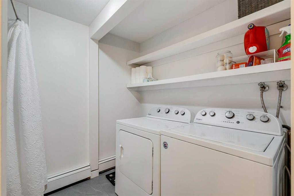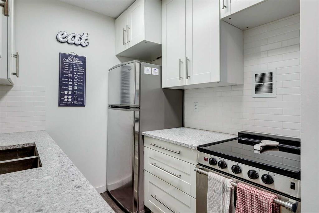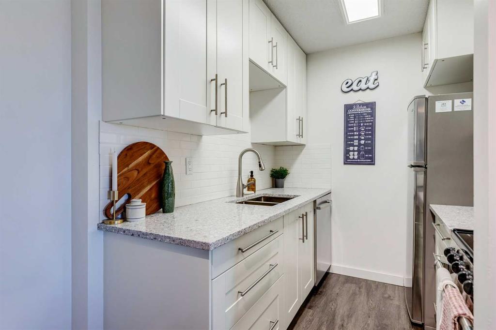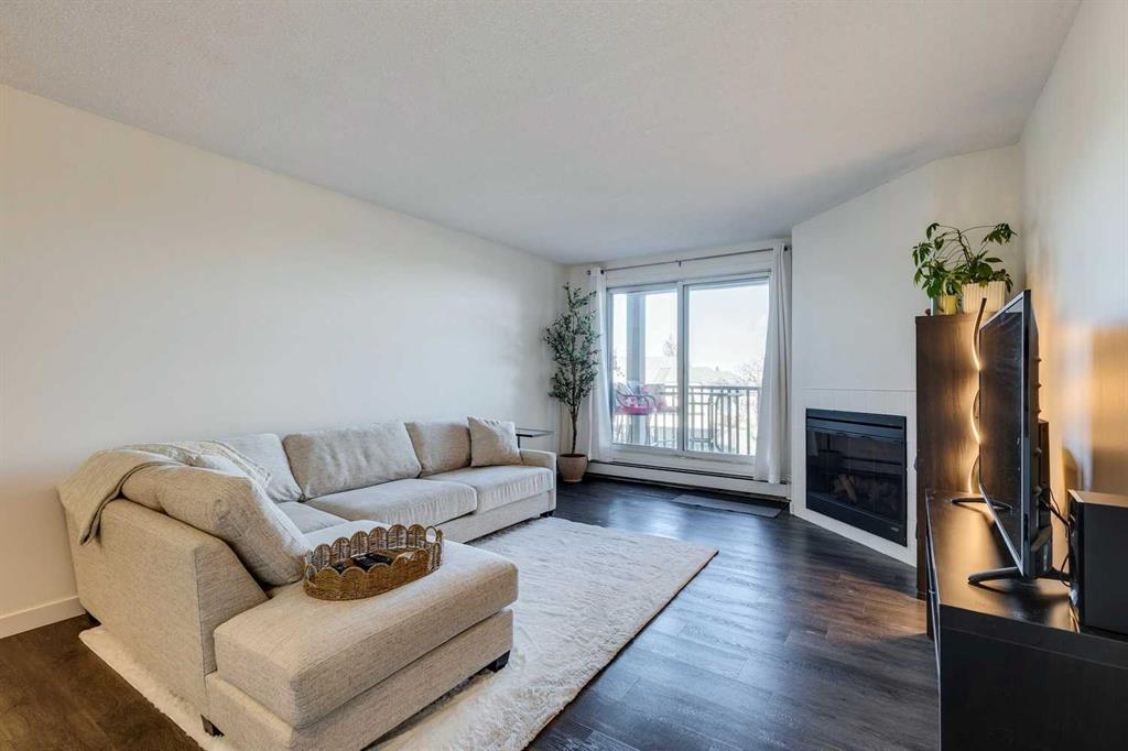 This two bedroom condo in the Village of Westhills offers practical living in a convenient west side location. Set in Coach Hill, the building is close to downtown Calgary, Westhills Shopping Centre, Westside Recreation Centre, Mount Royal University, Winsport, and the West LRT, with easy access to Highway 1 for trips out of the city. The unit features open living and dining space with large windows that look toward the city skyline. The primary bedroom is generously sized and can comfortably fit larger furniture. The living room features a natural gas fireplace and opens onto a private balcony with an exterior storage room for seasonal items. The kitchen has been refreshed with updated cabinetry, backsplash, quartz counters, and newer appliances, providing a clean and functional workspace. Additional storage is available in the lower level of the building. One assigned parking stall is located close to the entrance, with the option to arrange a second leased stall if required. The complex is surrounded by mature trees and nearby pathways for walking and biking. An affordable option for first time buyers, students, investors, or anyone looking for straightforward condo living in an established neighborhood.