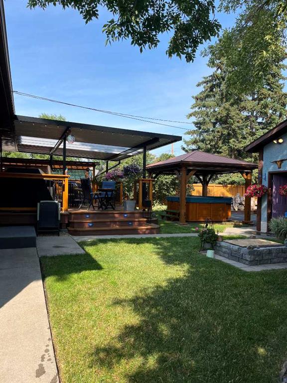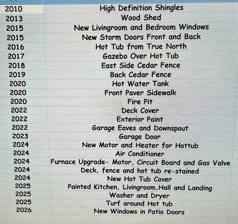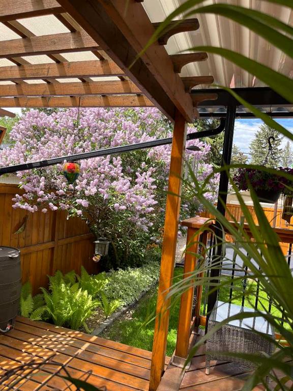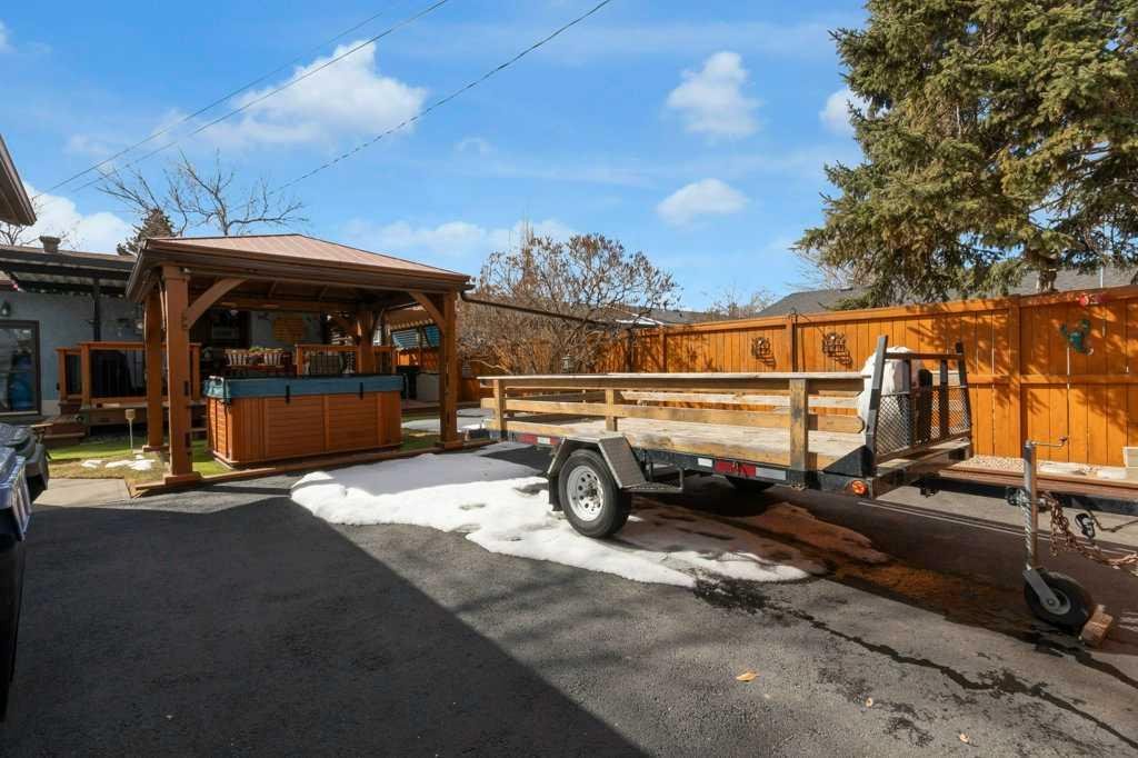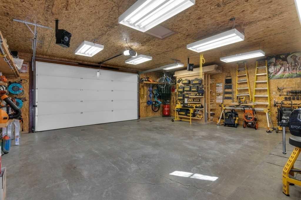 Out back… well, this is where things get extra special. Step through the kitchen’s French doors and into your own backyard escape. Picture summer evenings surrounded by blooming perennials and fragrant lilacs, unwinding on the massive deck with a drink from your live edge bar, soaking in the hot tub, or lounging under the pergola. It’s equal parts garden oasis and entertainer’s playground. The cedar fencing and railings add a timeless, natural charm, while the treated wood accents keep everything looking sharp for years to come. There’s even a cozy fire pit for late-night stories under the stars and a handy wood shed to keep everything stacked and ready. For the hobbyist (or anyone who loves a seriously great garage), the insulated and heated 27′ x 25′ garage is a total dream setup. With paved RV parking and a dedicated RV gate, there’s room for all your toys.