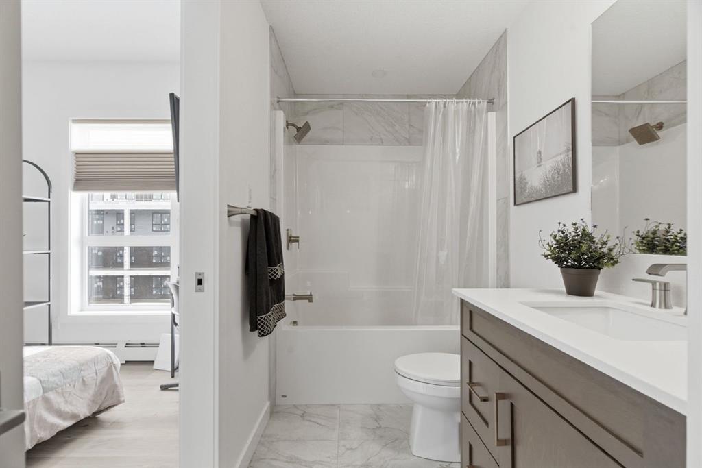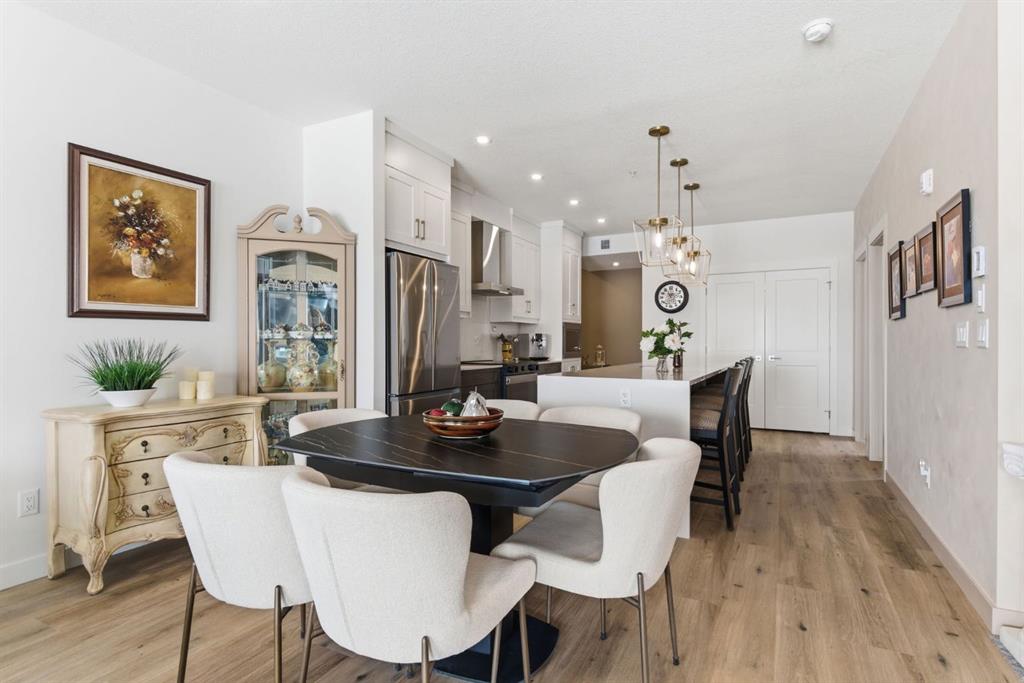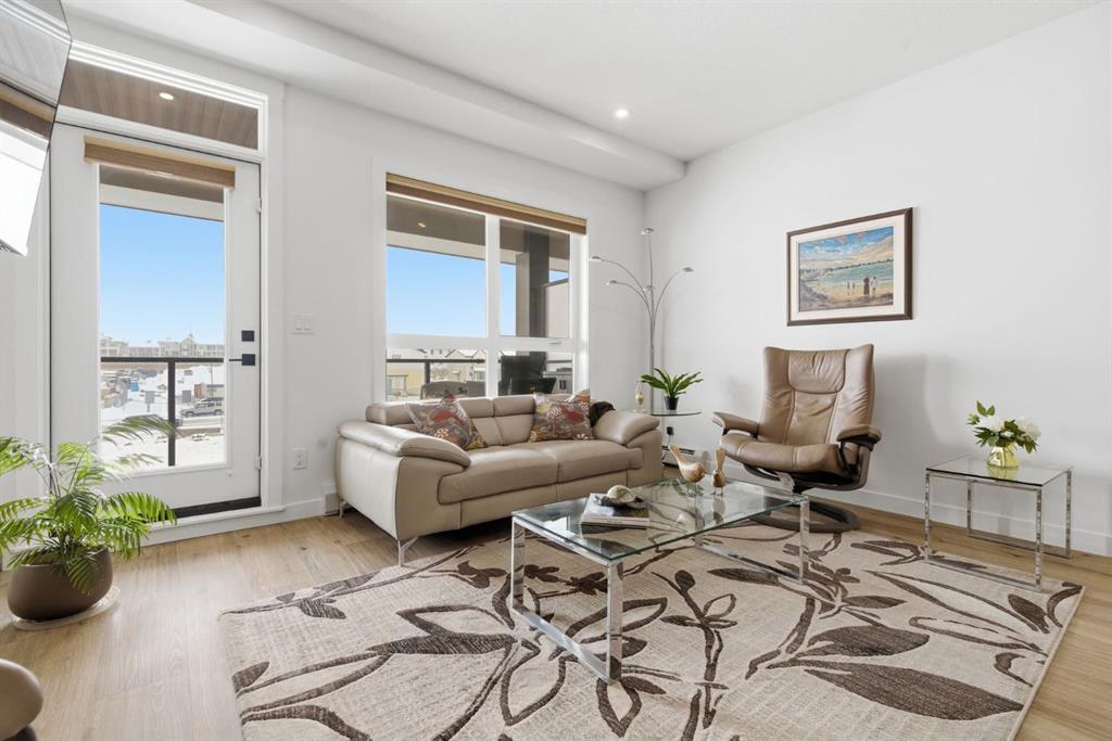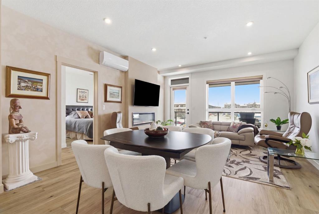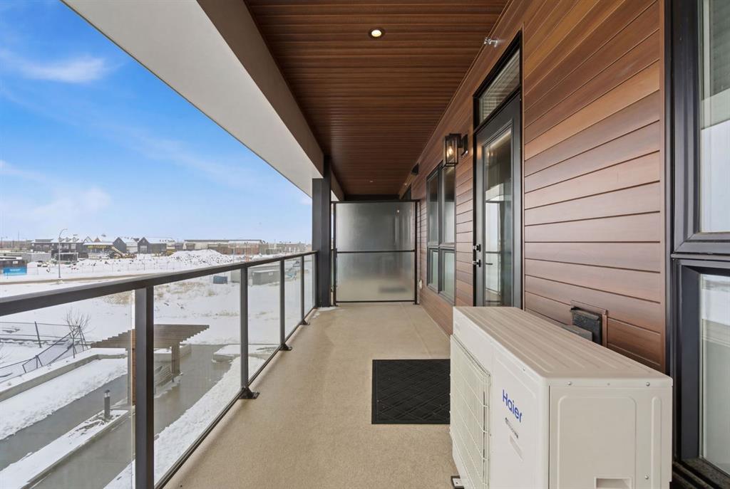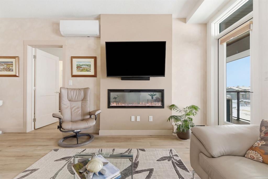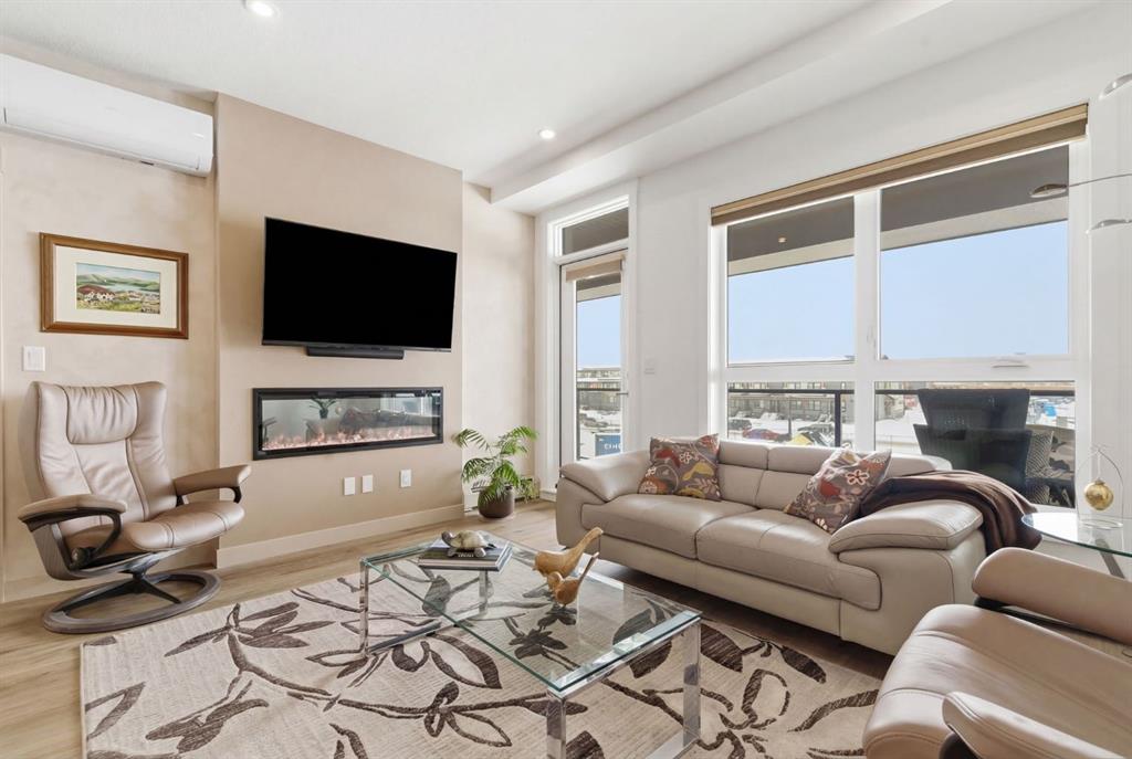 Welcome to this beautifully designed and upgraded, 3rd floor corner unit in the sought-after Waterside in Mahogany. Boasting nearly 1,000 sq ft of thoughtfully crafted living space, exceptional natural light from the south western exposure and large windows, and modern finishes throughout. From the moment you step inside, you’ll appreciate the spacious foyer and the bright and open layout that is enhanced by large dual pane, low-e southwest-facing windows that fill the home with beautiful sunshine all day long. Luxury vinyl plank flooring flows throughout the main living areas, creating a warm and inviting feel. The kitchen is both stylish and functional, hosting sleek quartz countertops, an upgraded stainless steel appliance package, elegant cabinetry with upgraded hardware and custom organization, and a stunning central island with waterfall ends, that provides plenty of space for cooking, dining, and entertaining. The open-concept design seamlessly connects the kitchen to the spacious living and dining areas, anchored by a contemporary electric fireplace for added comfort and ambiance. Step outside onto the oversized private balcony overlooking the courtyard area and is complete with a gas BBQ line, perfect for enjoy beautiful summer evenings on the patio. This well appointed Atwood 3 model suite offers two spacious bedrooms and 2 full baths. The primary bedroom features a generous walk-in closet with custom California Closets providing great storage options and a beautifully upgraded ensuite with a double vanity. Both bathrooms showcase quartz counters and upgraded fixtures, continuing the home’s luxurious, modern style. Additional highlights include in-unit laundry, 2 air conditioning wall units for year-round comfort, stylish upgraded lighting package throughout, and custom California Closets for exceptional organization. The home also includes a titled underground tandem parking stall to accommodate two vehicles and a separate storage locker, offering both convenience and extra space. Located in the award-winning community of Mahogany, residents enjoy exclusive access to Mahogany Lake, Calgary’s largest freshwater lake featuring sandy beaches, swimming, paddleboarding, skating in the winter, and endless pathways and wetlands for walking and biking and all your outdoor lifestyle needs. With numerous nearby shops, great restaurants including Chairmans Steakhouse, great schools, and amazing amenities just minutes away, Mahogany offers a vibrant, resort-style lifestyle in one of Calgary’s most desirable communities. This is condo living at its finest—modern, low maintenance, and surrounded by incredible amenities. Don’t miss your chance to see this one today!