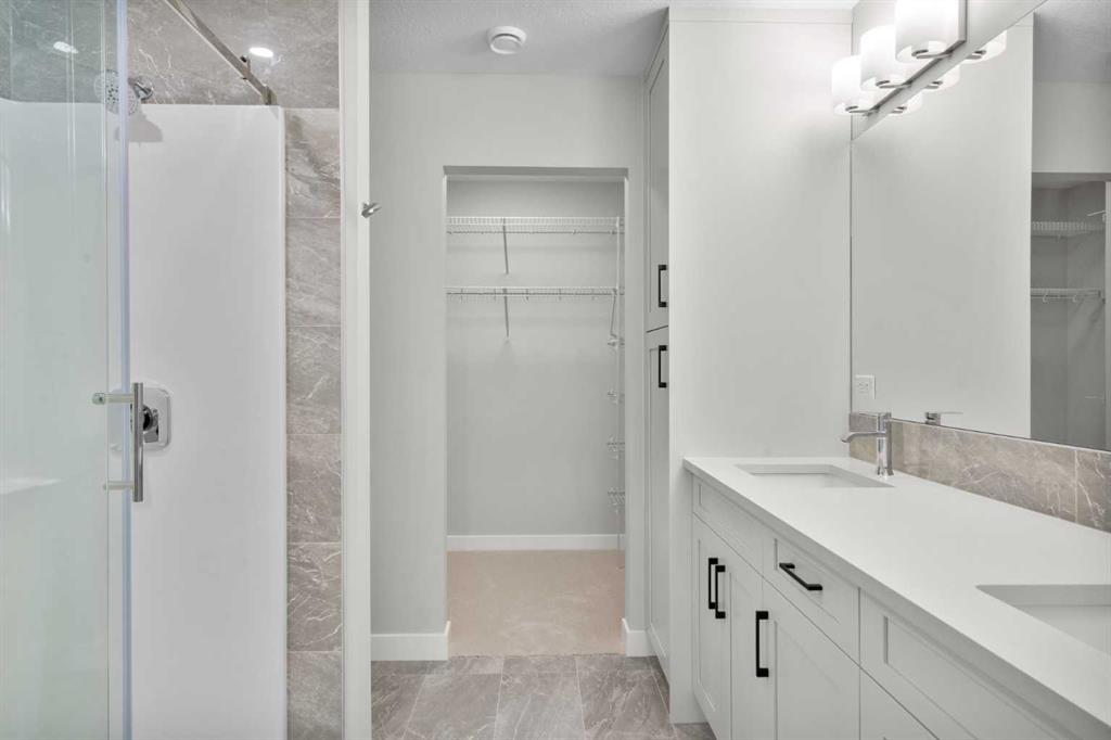Both bathrooms carry forward the same elevated standard, finished with tile flooring and quartz surfaces. The primary ensuite is designed as a refined retreat, offering dual undermount vanities, a statement 10mm Sydney barn-style sliding glass shower with chrome detailing, and enhanced lighting throughout. A built-in linen tower and additional GFI outlets provide both convenience and thoughtful functionality. The second bathroom mirrors these finishes, maintaining a cohesive, upscale feel across the home.