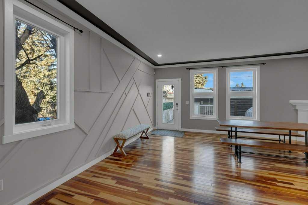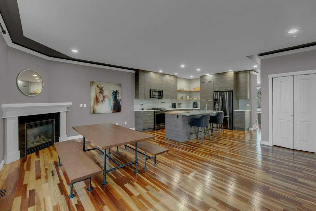 The main floor showcases 9-foot ceilings and elegant back-lit crown moldings throughout. A striking staircase with maple railings, iron spindles, and a skylight creates a bright and inviting transition to the upper level.