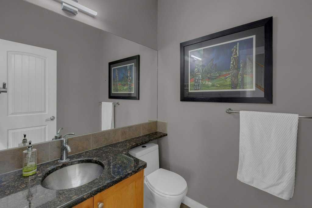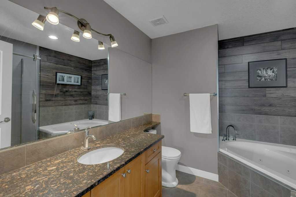 Upstairs, the primary bedroom offers a walk-in closet and private balcony with glass railing and scenic south hillside escarpment views. The spa-like ensuite features granite countertops, a jetted tub, and a separate shower. A convenient second-floor laundry room completes this level. All bathrooms are finished with tile floors, backsplashes, and tiled tub surrounds.