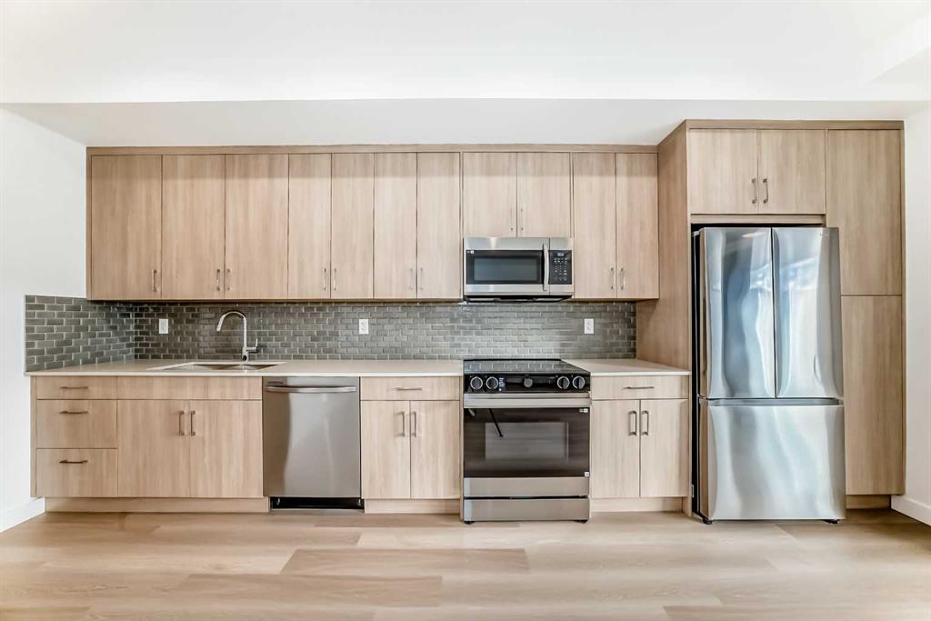 This is the Carr 2 floorplan, it is a one bedroom, one bathroom suite. This home features 41” upper cabinets with soft close doors and drawers, quartz countertops, luxury vinyl plank, and ceramic tile as standard in the bathroom, Samsung stainless steel appliances, pot lights, and 8′ wide patio door, and titled surface parking.