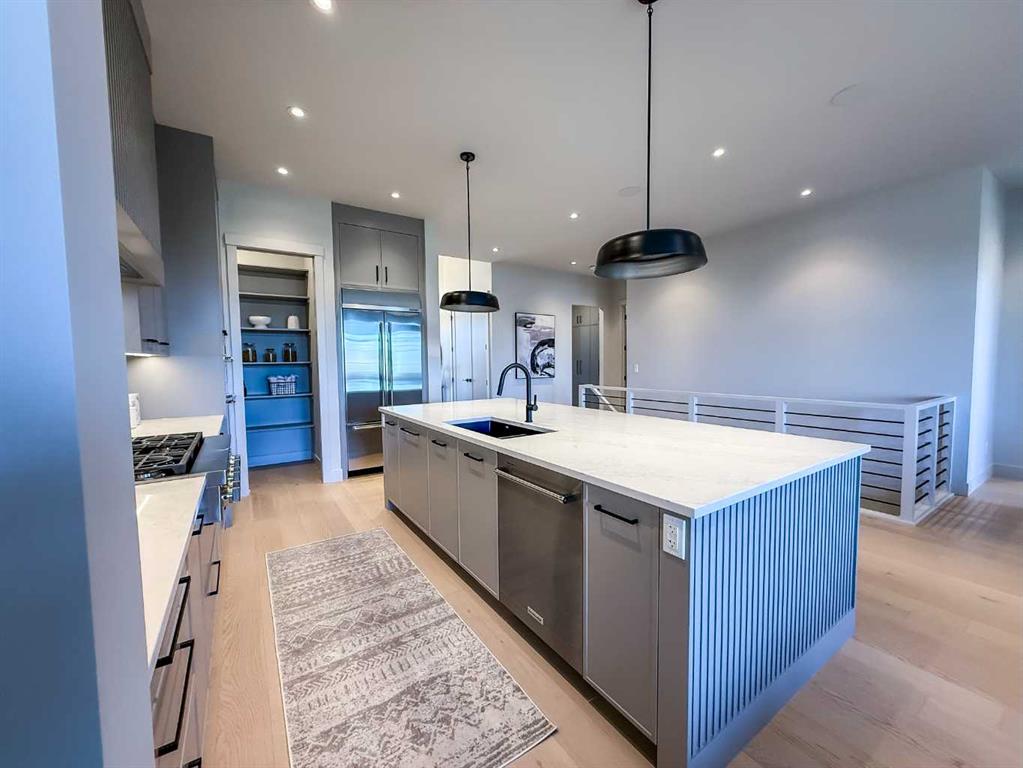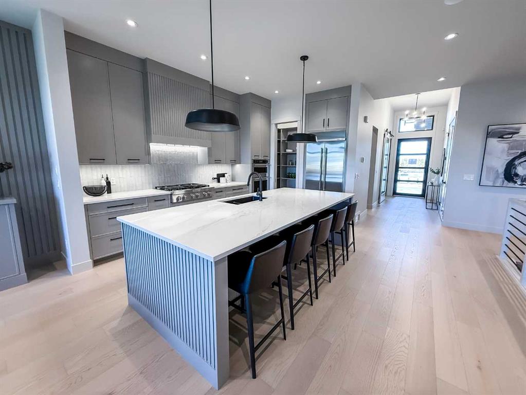 Nestled in the heart of Serenity at Heritage Pointe, this luxurious 3 bedroom, 2.5 bath townhome with the Sydney floorplan has been carefully crafted by RareBuilt Homes & offers over 3200 sq ft of exceptional living space. The open concept main floor impresses with engineered wide plank hardwood, custom tile detailing, 10’ ceilings, and a spacious great room with large sliding doors that open to a covered rear deck and private fenced yard. The chef inspired kitchen is equipped with a full KitchenAid appliance package, including a six burner gas cooktop, custom hood fan, refrigerator/freezer, dishwasher, and built in oven with convection microwave. A generous island, ample storage, and thoughtful layout make this kitchen ideal for both everyday living and entertaining. A stylish home office with beam detailing adds both character and functionality. The primary suite provides a serene retreat, complete with a spa inspired 5 piece ensuite featuring heated floors, a freestanding soaker tub, an oversized shower, and a custom walk in closet. The fully finished basement extends the living space with a large recreation room, two additional bedrooms, a full bath, and a roughed-in theatre room that can be modified to wherever your imagination takes you. Additional highlights include a 3 stop elevator, tilt and turn triple glazed windows, 6 standard solar panels, a high efficiency furnace, heat pump, air conditioning, and radiant in floor heating—ensuring year round comfort and energy efficiency. Parking is effortless with a fully finished and painted oversized double attached garage complete with epoxy flooring, aggregate driveway and EV charger readiness. Enjoy the freedom of full landscape maintenance and snow removal plus close proximity to Heritage Pointe Golf Club, LaunchPad Golf at Heritage Pointe & easy access to Calgary or Okotoks via highway 2 or 2A.