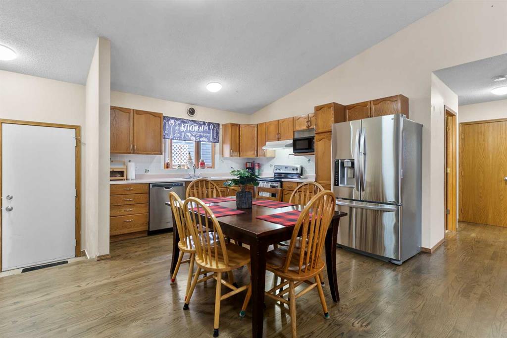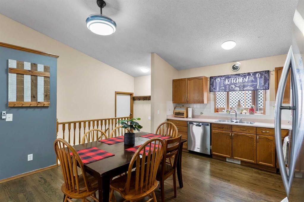BUNGALOW alert — a rare opportunity at this price point for those ready to add their own personal touches. Step inside to a bright, open-concept layout featuring hardwood floors, a vaulted ceiling, a cozy gas fireplace (offered as-is), and a charming bay window that brings in plenty of natural light. The functional L-shaped kitchen includes stainless steel appliances and a convenient side door leading to the side yard/dog run. The main level offers a primary bedroom with direct access to the east-facing backyard and a 2-piece ensuite, along with two additional bedrooms and a full bathroom. Downstairs, you’ll find two more bedrooms/flex rooms (non-egress windows), a full bathroom, and a generous family/rec area — an ideal space to refresh, reimagine, or customize to suit your needs. Thoughtful storage is found throughout the home with deep closets, utility room shelving, and a dedicated basement storage room. This property offers solid bones, great space, and plenty of potential for buyers who enjoy rolling up their sleeves and making a home their own. Additional highlights include a double attached garage with a newer garage door (January 2023), a replaced front living room bay window, several newer light fixtures and ceiling fans with remotes, and a recently serviced furnace with duct cleaning completed.