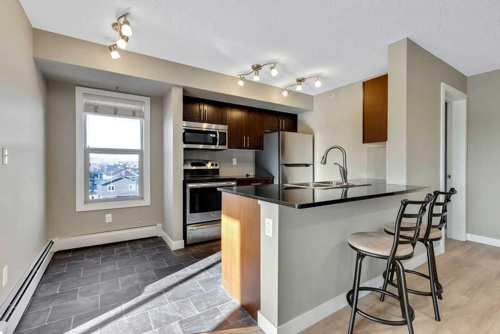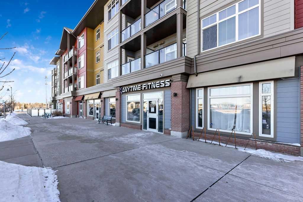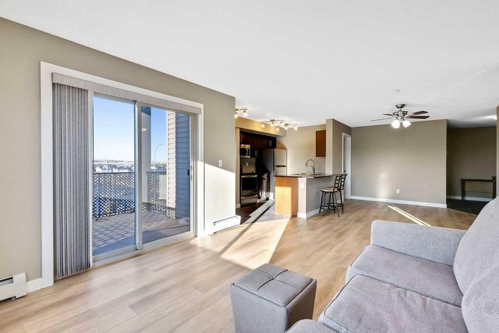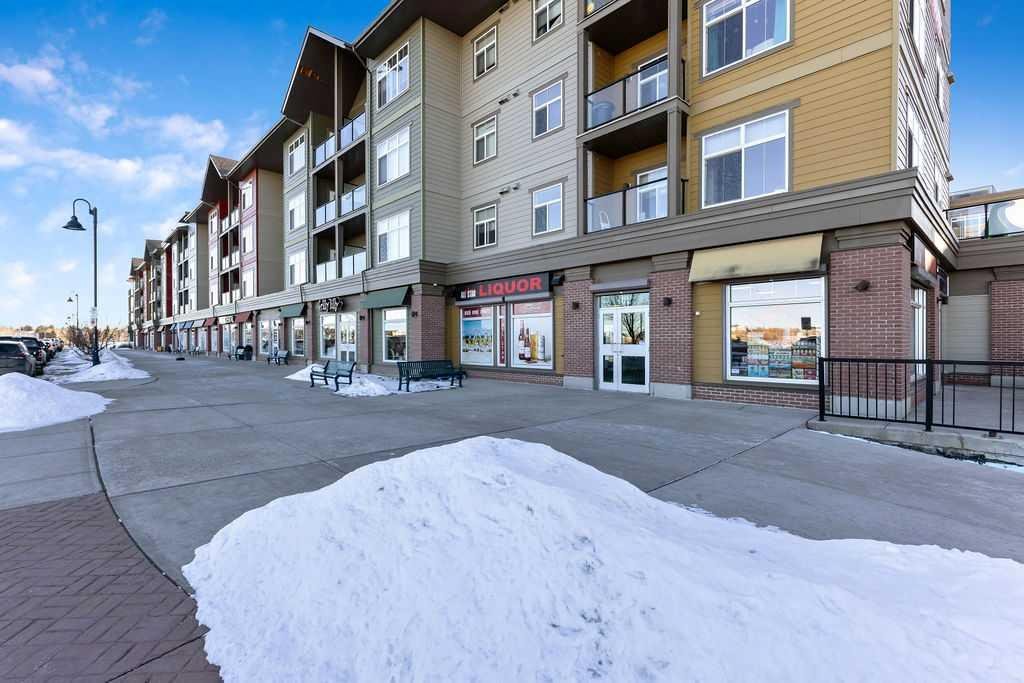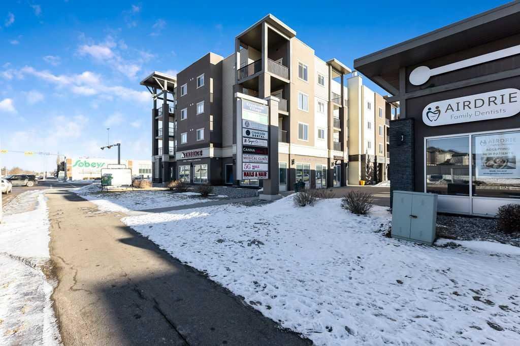 This TOP FLOOR two-bedroom, two-bathroom suite offers TWO Parking Stalls in Downtown Airdrie’s most desirable location, with beautiful southwest-facing views. With almost 1,000 square feet, the thoughtfully designed layout includes two spacious bedrooms plus a versatile den area. Recent upgrades include new carpeting, vinyl plank flooring, stainless steel appliances, and a custom 2” blind package, enhancing both comfort and style. The open-concept living space is bathed in natural light from expansive windows, creating a bright and welcoming atmosphere. Elegant kitchen features granite countertops, a breakfast island, soft-close cabinetry, and a dedicated dining area—perfect for everyday living and entertaining alike. The living room opens through patio doors to a generously sized balcony, ideal for hosting guests or simply enjoying the stunning views. The primary bedroom offers a private 3-piece ensuite, while the second bedroom is conveniently located near a full four-piece bathroom. Large foyer with an office nook and in-suite laundry adds further functionality. This well-appointed condo includes one titled underground parking stall and one above-ground surface stall. With numerous upgrades and a walkable location close to Sobeys, Good Earth Café, fitness facilities, shops, and transit, this is a true move-in-ready opportunity—simply settle in and enjoy.