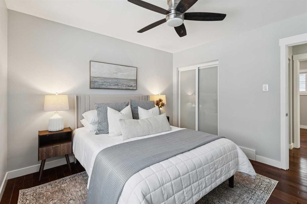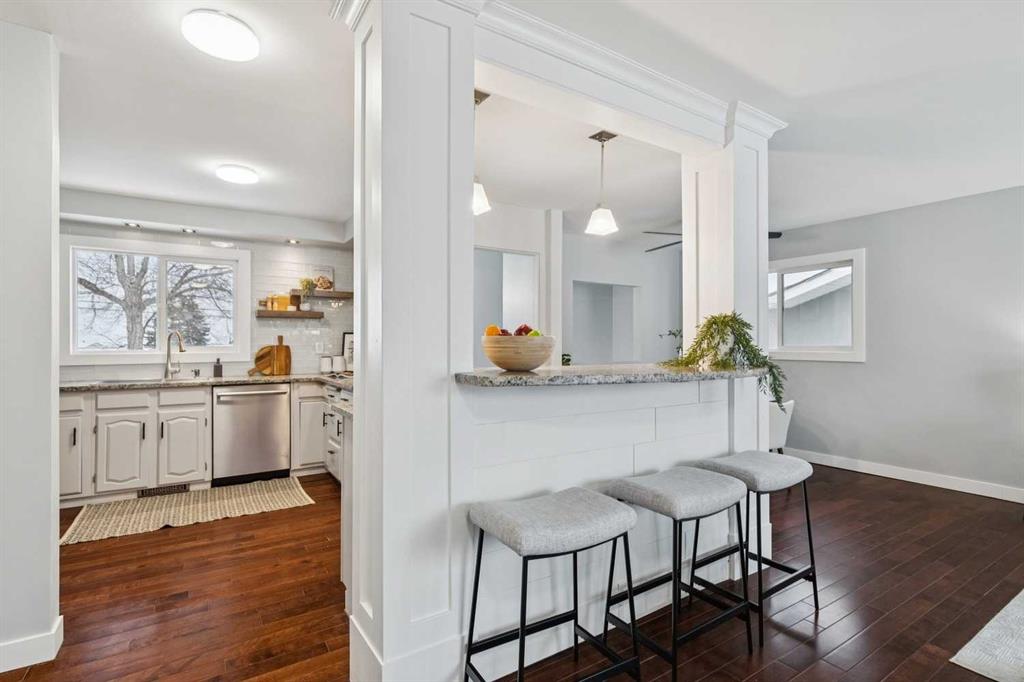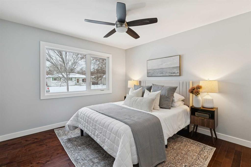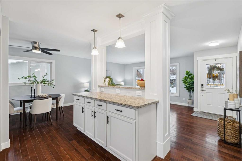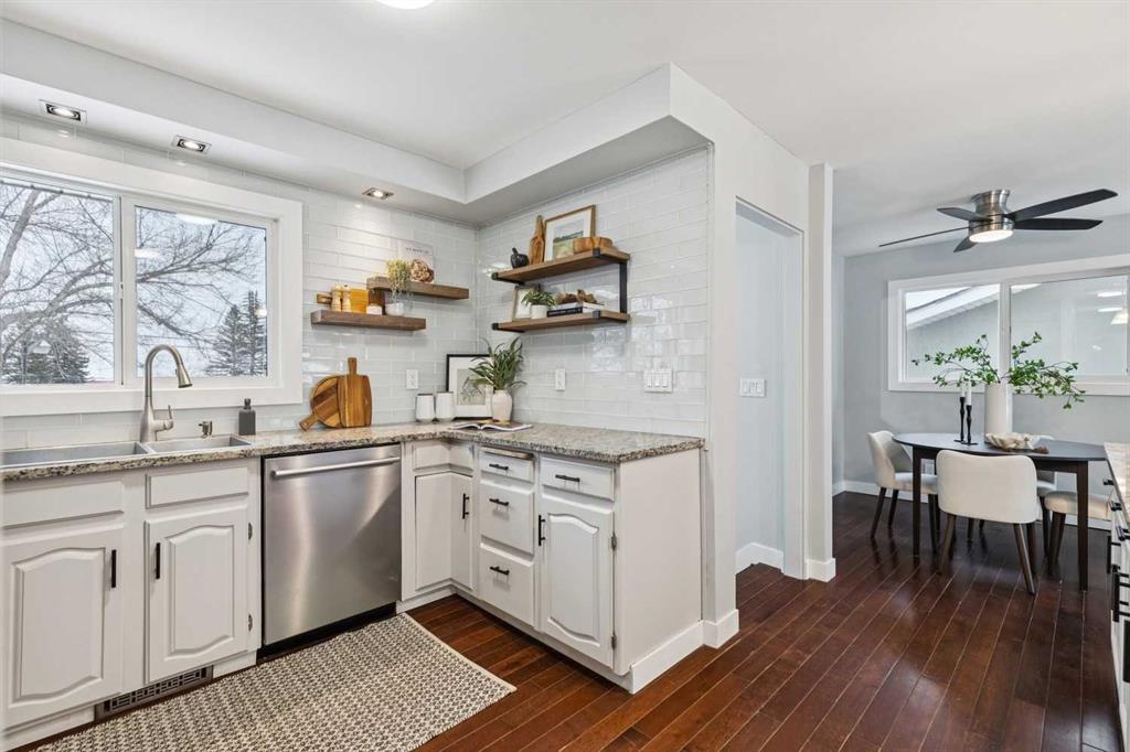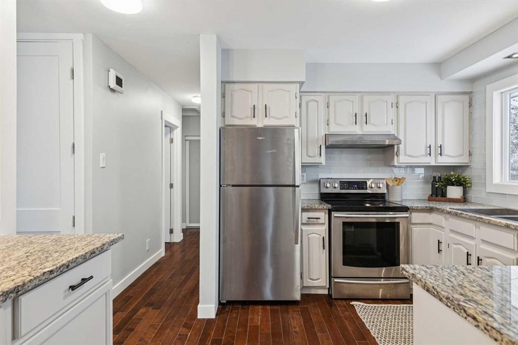 Welcome to this beautifully renovated bungalow nestled in the heart of Fairview, a mature, tree-lined community known for its welcoming feel and unbeatable convenience. Offering immediate possession, this move-in-ready home blends timeless charm with thoughtful modern updates throughout. Freshly painted throughout in 2025 and featuring new carpet in the fully developed basement (2025), the home is bright, refreshed, and ready for its next chapter. Hardwood floors grace the main level, where a large front window (new in 2024) fills the inviting living room with natural light and overlooks the landscaped front yard. The kitchen has been tastefully updated with newly painted cabinetry (2026), stylish new hardware, granite countertops, stainless steel appliances, a brand-new fridge (never used), breakfast bar seating, new lighting, and even a water line behind the fridge for a future ice and water connection. The main floor offers 3 comfortable bedrooms and a full bathroom complete with a tiled tub & shower combo. Downstairs, the spacious lower level creates the perfect retreat with a large rec room with plush new carpet (2025), a new gas fireplace (2022), a 4th bedroom with an egress window, a convenient half bathroom (seller can add shower for additional cost), laundry area with storage, generous storage room with shelving, water softener, and a dedicated workbench space for projects and storage. Comfort continues with air conditioning added in 2021 and rough-in for central vacuum. Outside, the fully fenced backyard is designed for both relaxation and enjoyment, featuring mature lilac bushes, a large deck ideal for summer evenings, garden beds, back alley access, and the rare bonus of an off-leash dog park directly behind. Parking for 4 is effortless with a detached single garage boasting a new smart overhead door (2021), new shingles (2021), and a gas line already run for a future heater, plus 1 driveway stall and 2 additional spaces beside the garage. The house roof was comprehensively redone in 2021 with new shingles, eaves, soffits, and downspouts, and the front windows were replaced in 2024. All new attic insulation in 2021. Ideally situated near Fairview School and Lord Beaverbrook High School, close to parks, shopping, transit, and with quick access to Glenmore Trail and Macleod Trail, this lovingly maintained home offers the perfect blend of comfort, functionality, and location in one of Calgary’s most established neighbourhoods.