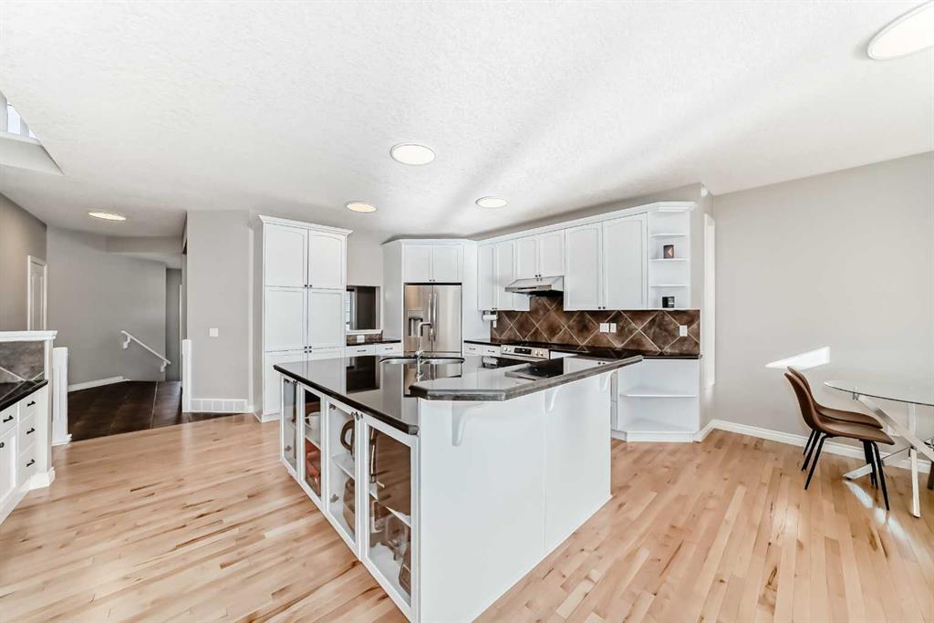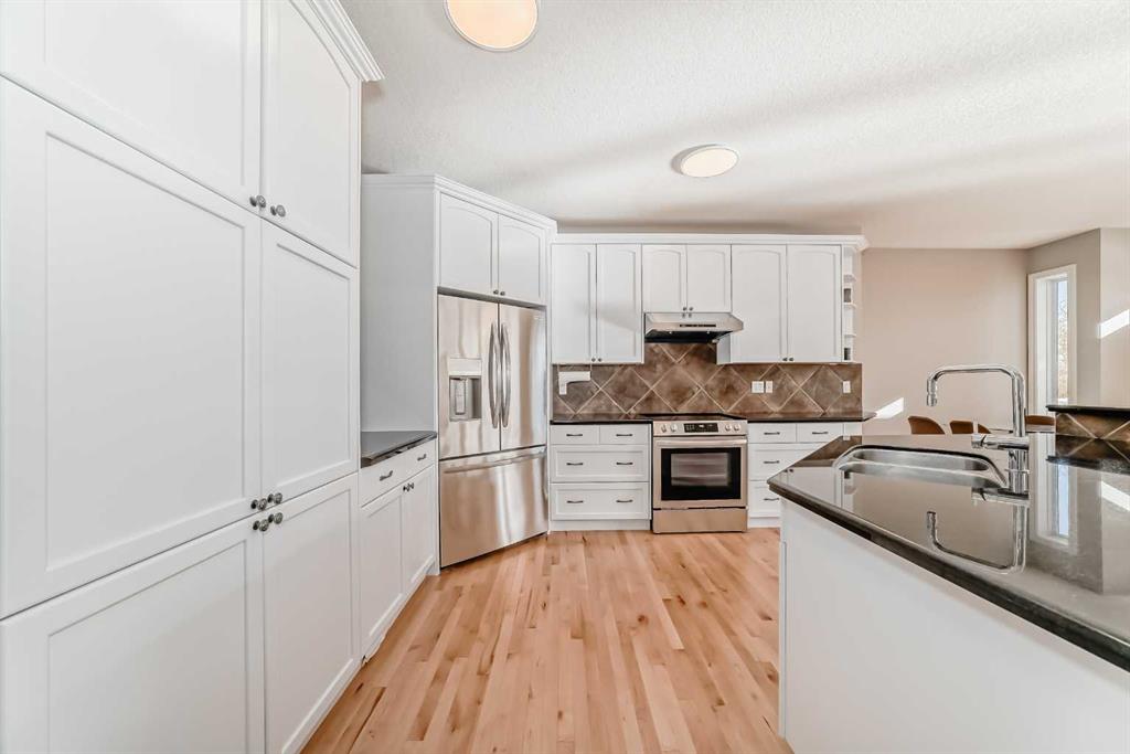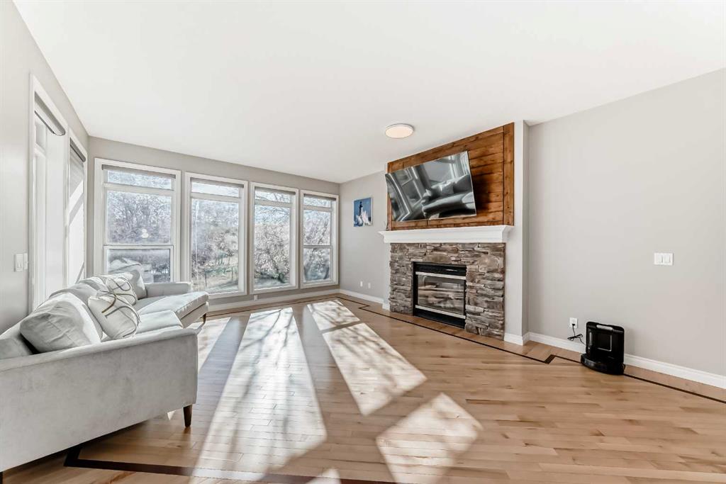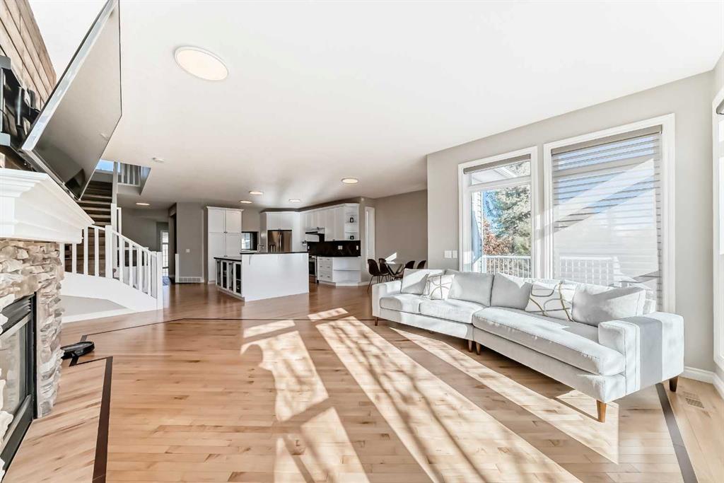Nestled on a quiet cul-de-sac, this beautifully updated bungalow backs onto walking paths and green space, offering peaceful city views. From the spacious foyer, you’ll be welcomed into an open-concept main floor featuring a chef’s kitchen with abundant cabinetry, generous counter space, and a large central island. The bright living room showcases a two-way fireplace and oversized picture windows that capture the outdoor scenery. The primary suite provides a relaxing retreat with a fireplace, soaker tub, separate shower, and skylight. A unique upper loft offers a perfect space for a den or study, complete with a private balcony for quiet moments. The walk-up lower level is ideal for entertaining, featuring a large family room with a wet bar, two additional bedrooms, a full bathroom, ample storage, and full air conditioning. Close to downtown, transit, schools, parks, and amenities, this exceptional home blends style, comfort, and convenience in one of the city’s best locations.