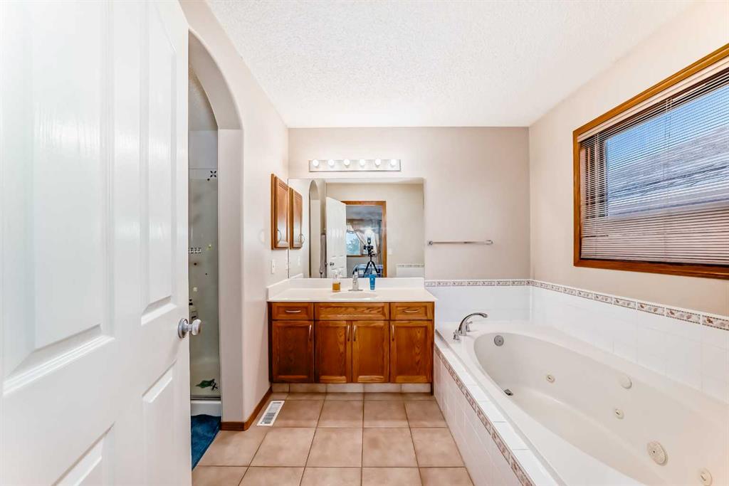 Upstairs, retreat to the master bedroom complete with a walk-in closet and an ensuite bathroom featuring a jetted bathtub, perfect for unwinding after a long day.