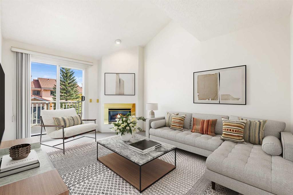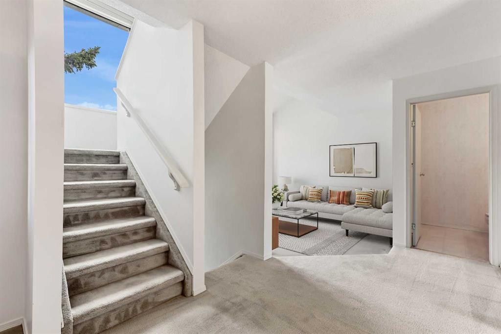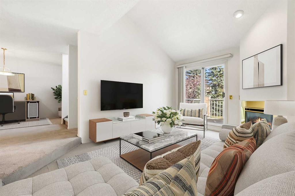 Welcome to #77, 5810 Patina Drive SW — a beautifully maintained multi-level townhome nestled in the picturesque community of Patterson. Offering over 1,590 Sq.Ft. of above-grade living space plus a fully developed basement, this home features a total of two bedrooms + family room, providing space and flexibility for your lifestyle. The main level boasts vaulted ceilings, a bright and welcoming living room with a cozy gas fireplace, and a mix of carpet and laminate flooring throughout. The kitchen is both functional and inviting, with white cabinetry, a central kitchen island, brand new stainless steel appliances, and a full pantry. Enjoy seamless flow between the formal dining room and the sun-soaked breakfast nook, which opens to your rear deck.