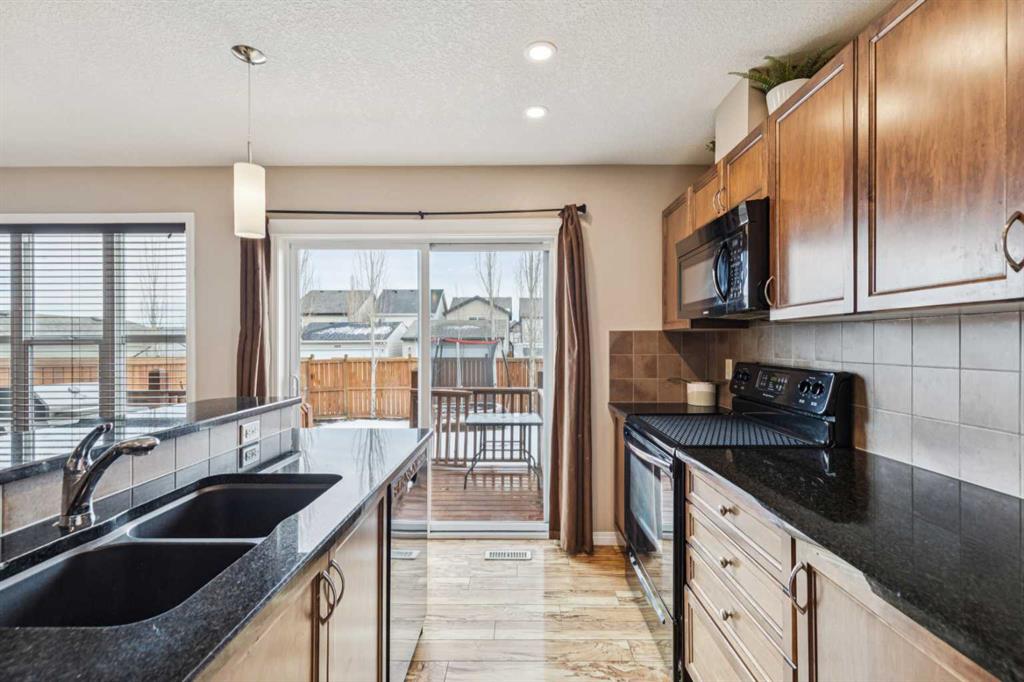 The chef-inspired kitchen is the centerpiece of the home, featuring a deep undermount sink, full-height tile backsplash, corner walk-in pantry, and an impressive central island with raised eating bar. Granite countertops, sleek black appliances, and abundant rich maple cabinetry provide both style and exceptional functionality for cooking and entertaining.