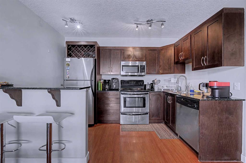 Get in the market and become a home owner with this great 1 bedroom, 1 bathroom condo apartment in Shaganappi in the southwest just minutes from downtown! In a quiet building, this property won’t last long. It’s location is close to amenities, shopping, parks and transportation. Second Cup is just across the road and Newcastle Pub is a stone’s throw away. This home features a large kitchen with espresso coloured cabinets, stainless steel appliances, granite counter tops and a breakfast bar for 2. The kitchen flows easily to the dining and living area with light streaming in through the sliding patio doors leading to the balcony. There is a queen sized bedroom with sliding doors on the closet and loads of room for a dresser and additional furniture. The bathroom has a granite counter top, lovely tiled bathtub/shower and tiled floor. There is insuite laundry and additional storage space in the home as well as a separate storage locker. Come take a look, you won’t be disappointed!