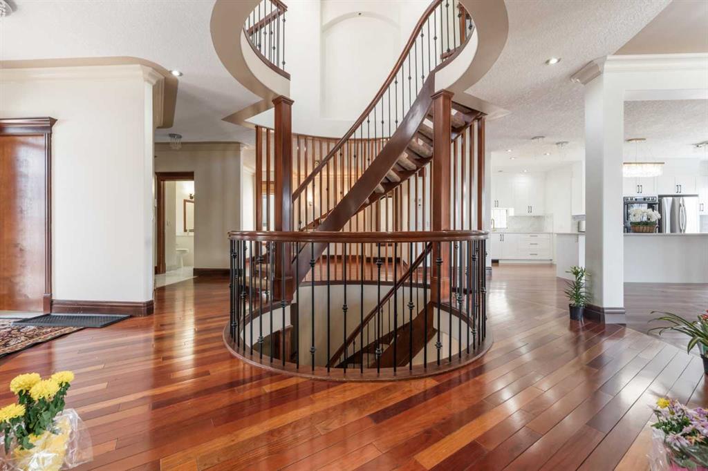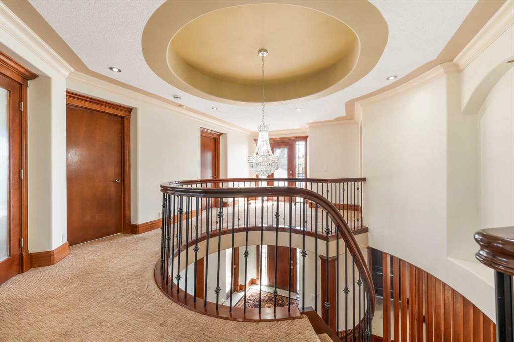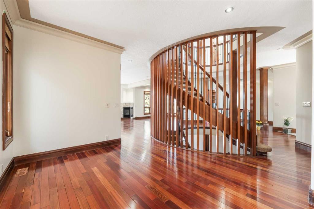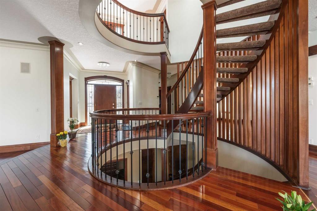 Are you looking for a house like no other, with a unique floor plan? See it to believe it. An extraordinary custom built LUXURY HOME in Calgary’s most sought-after neighborhood. Just moments from the prestigious Calgary French International School, premier shopping, and convenient highways, this stunning 5-bedroom, 4-full, 2-half-bath residence spans over 4500 square feet of sun-filled living space. As you enter, a cozy foyer welcomes you into a world of sophistication. The UNIQUE OPEN SPIRAL STAIRCASE stands as a centerpiece, CONNECTING ALL THREE LEVELS IN A FREE FLOWING LAYOUT. Unlike typical basements, this home embraces an open, airy feel, NO CEILING CUTS THE BASEMENT OFF; instead, the basement, VISIBLE FROM THE TOP FLOOR, invites you into a UNIFIED living experience. The main floor dazzles with 2 expansive living areas, perfect for hosting, and a formal living room with a fireplace. The RENOVATED and UPGRADAED chef’s kitchen is a dream—granite countertops, mostly BRAND NEW APPLIANCES, and a separate SPICE KITCHEN. 3 BALCONIES in the house expand your living space, perfect for summer gatherings, while the home is bathed in natural light from LARGE WINDOWS. Upstairs, enjoy the convenience of a bedroom-level laundry, complete with a SKYLIGHT, while the secondary bathroom also boasts ANOTHER SKYLIGHT, ensuring brightness at every turn. Upstairs, 4 serene bedrooms await, with two sharing a RENOVATED luxurious spa-like bathroom, each with double vanity sinks. The master suite is a private haven, featuring a fireplace, double-door entry, and a spa-inspired ensuite with a jetted tub, steam shower, and walk-in closet. The home offers ample storage, and central air for comfort year-round. The walkout basement is an entertainer’s dream—a cozy living area with a fireplace, a wine cellar, wet bar, bedroom, and den—perfect for guests. With a large garage, a flex room, and abundant storage, every detail is designed for practicality. Bathed in positivity, with abundant windows, this home is a masterpiece—where openness, elegance, and a warm family vibe come together. You will appreciate the location of this home surrounded by grocery stores like Co-op, No Frills and Save-on foods and only 12 minutes to the Shouldice park. A great convenience of walking distance to the prestigious Calgary French & International School and just minutes to Webber Academy. Upscale living in a family friendly community, your search ends here…..