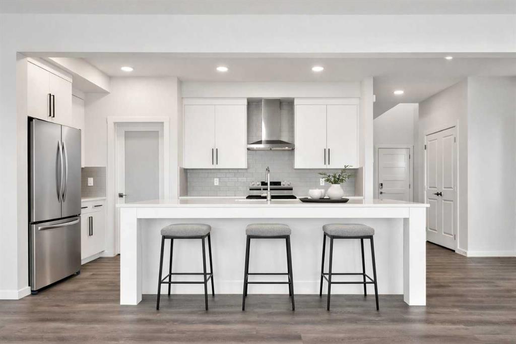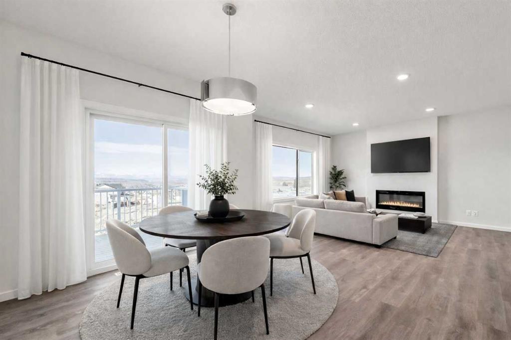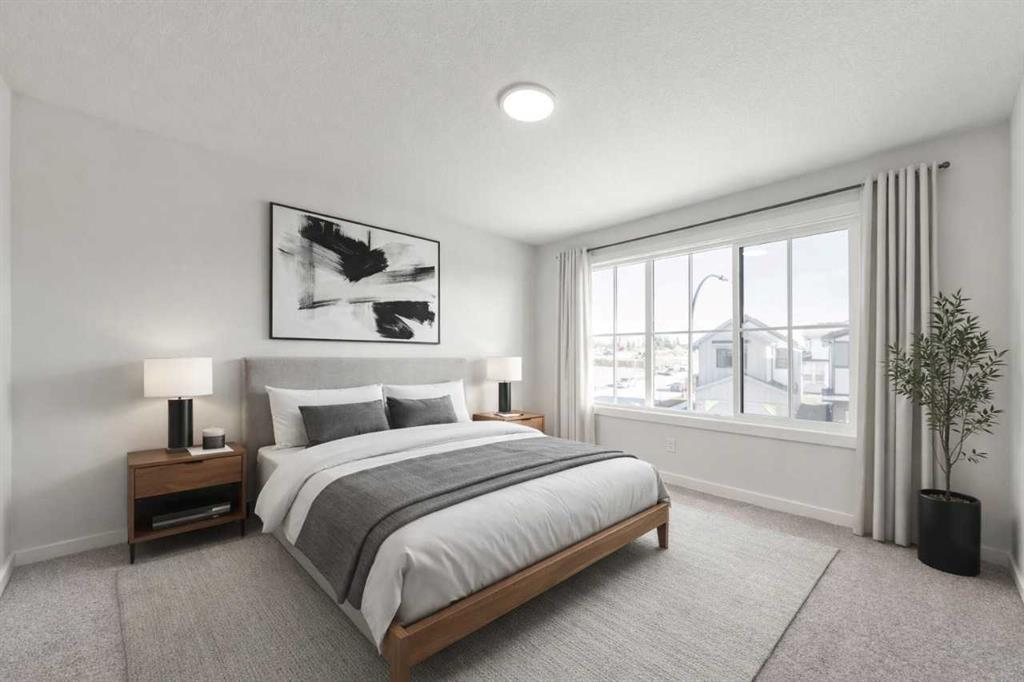 Framed by breathtaking mountain views from the rear, this 3-bed, 2.5-bath, 2,237 sq ft front-attached garage home delivers refined, quick-possession living at its finest. An open-to-above foyer flows into a sun-drenched main floor with 9′ ceilings and a great room anchored by a 50″ electric fireplace. The chef’s kitchen stuns with quartz countertops, ceiling-height cabinetry, chimney hood fan, oversized island, and walk-through pantry. Upstairs, the primary bedroom features a private sitting area, custom walk-in closet with direct laundry access, and a spa-style ensuite with double sinks, soaker tub, and tiled shower. A walkout basement with 9′ foundation offers exceptional development potential, while an extended concrete patio and rear deck elevate outdoor living. High-efficiency furnace, HRV system, and soft-close finishes throughout.