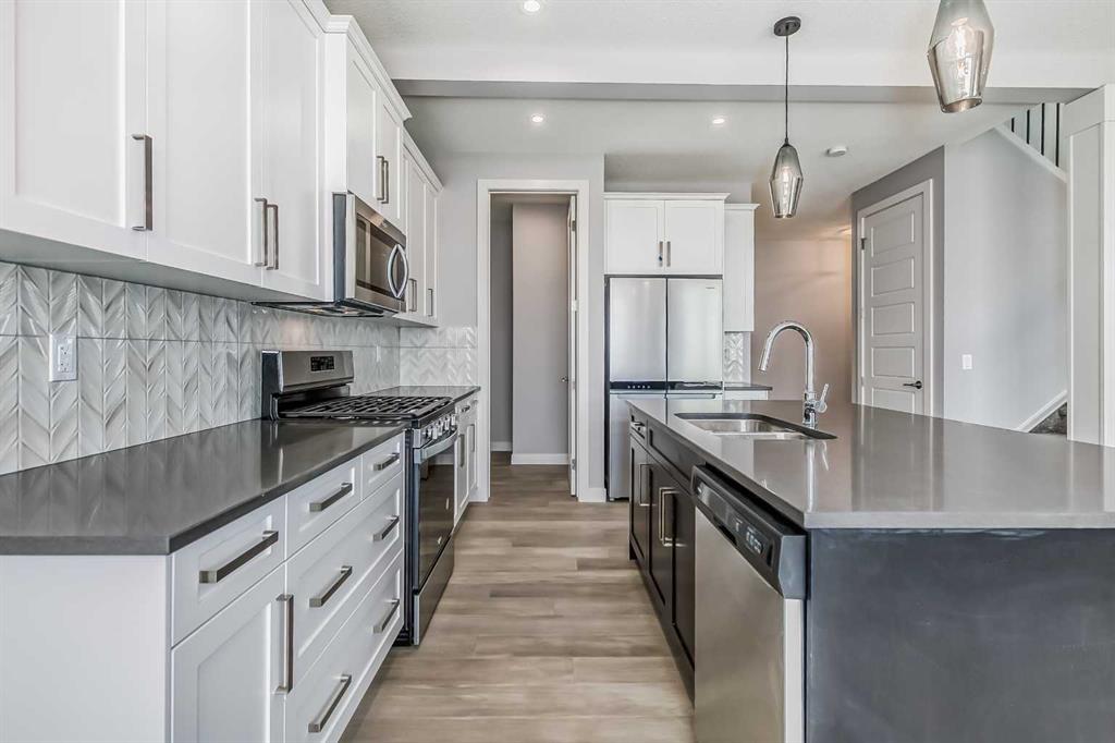 BRAND NEW HOME by Douglas Homes, Master Builder in central Greystone, short walking distance to parks, the Bow River, major shopping & interconnected pathway system. Featuring the Madison 2 on a corner lot, south facing back yard, walkout basement, deck off the main floor accented by built out columns on an R-MX zoned lot for POTENTIAL future lower level suite. NOTE: a secondary suite would be subject to approval and permitting by the city/municipality. Located on a quiet street, very close two Children’s Play Parks & paved back lane. This gorgeous 3 bedroom, 2 & 1/2 half bath home offers over 1760 sq ft of living space. Loads of upgraded features in this beautiful, open floor plan. The main floor greets you with a grand glazed 8′ front door, soaring 9′ ceilings, oversized windows , & 8′ 0″ passage doors. Distinctive Engineered Hardwood floors flow through the Foyer, Hall, Great Room, Kitchen & Nook adding a feeling of warmth & style. The Kitchen is completed with an oversized entertainment island (7’0″ single level island) & breakfast bar, roomy closet pantry with 8’0″ French Door , Quartz Countertops, 42″ Cabinet Uppers accented drop bulkhead, Pots & Pans Drawers, soft close doors & drawers throughout, new stainless appliance package including Side by Side Fridge with Ice and Water, Gas Range, Chimney Hood Fan, Built-In Microwave in the island & Built-In Dishwasher. The main floor is completed with an expansive, open Great Room & Nook finished with over height windows & Napoleon “Entice” fireplace. Ascending the second floor there is a large “U” shaped staircase complimented by black metal spindle railing naturally light by a large window. Upstairs you’ll find a generous Primary Bedroom with 5 piece Ensuite including dual, separate, Quartz vanities with undermounted sinks, oversized 4’0″ x 3’0″ shower, 6’0″ soaker tub with large window above, private water closet, & ceramic tile flooring. There is also a generous sized walk-in closet accessed from the Ensuite. The 2nd floor is completed by a spacious, centralized Family Loft & two additional, good size bedrooms, one with WIC. The 2nd & 3rd bedrooms have the convenient access to the main bath with Quartz countertop, undermounted sink & tile flooring. You’re certain to love the convenience of the 2nd Laundry completed with large access doors, light & tile flooring. This is a very popular plan, great for young families or for the sizing down crowd. Spacious, Beautiful and Elegant! The perfect place for your perfect home. Call today! Photos are from prior build & are reflective of fit, finish & included features. Note: Front elevation of home & interior photos are for illustration purposes only. Actual elevation style, interior colors/finishes, & upgrades may be different than shown & the Seller is under no obligation to provide them as such. Directions: Come to the Show Home first at 500 River Avenue. Showings only during Show Home hours & days. THIS HOME IS UNDER CONSTRUCTION